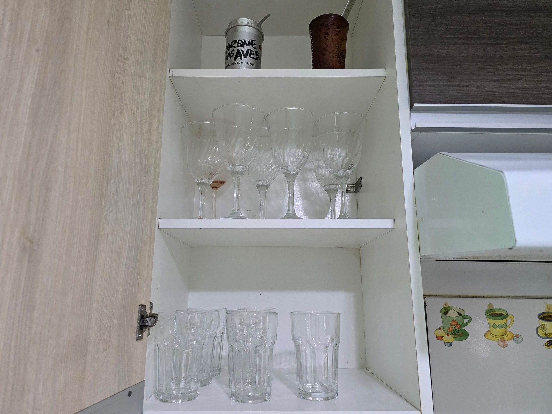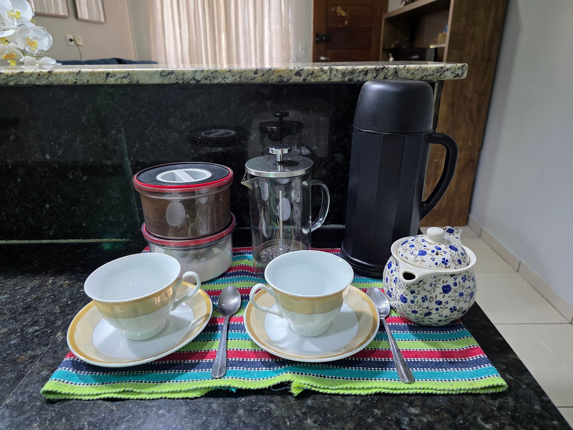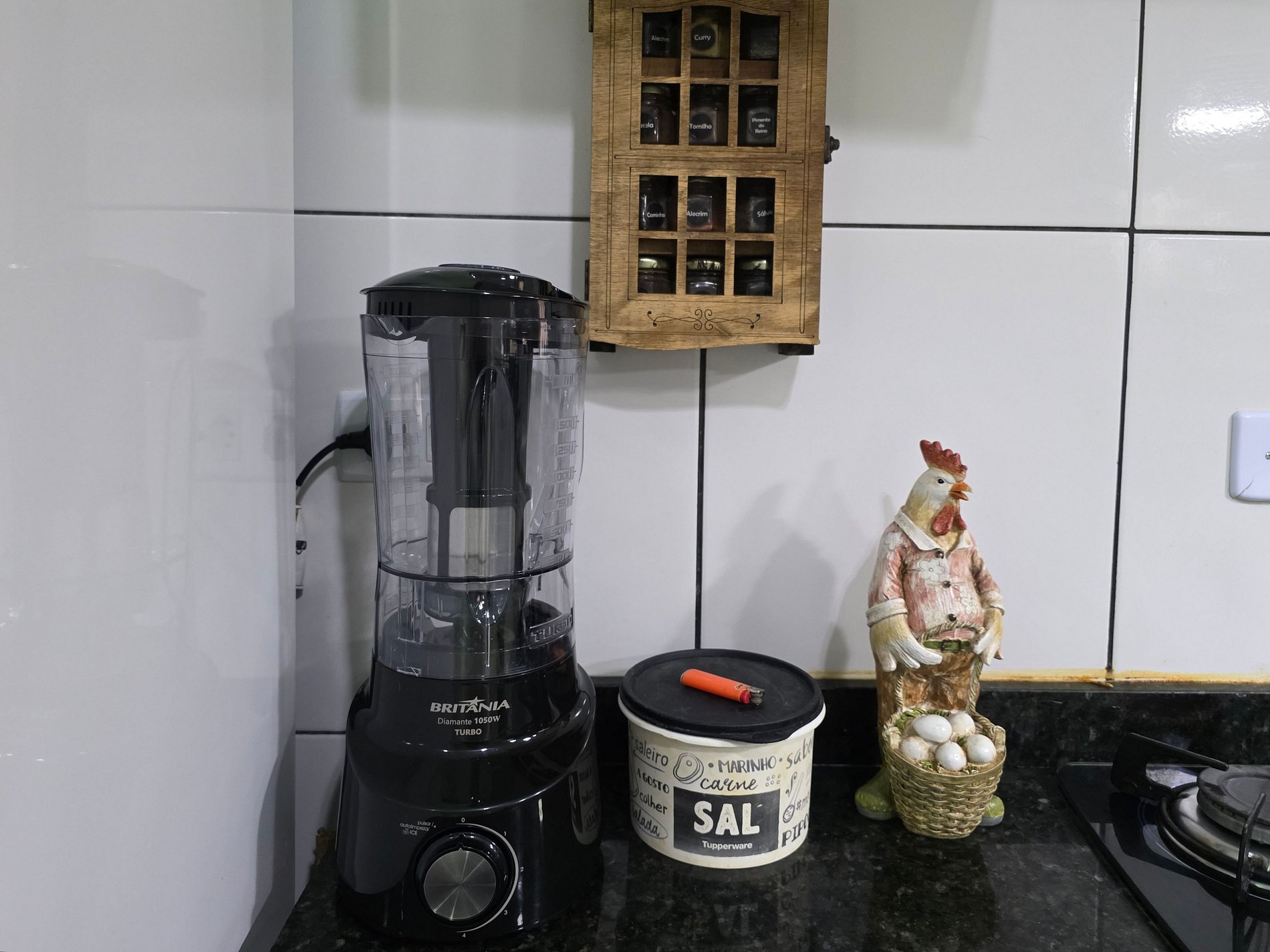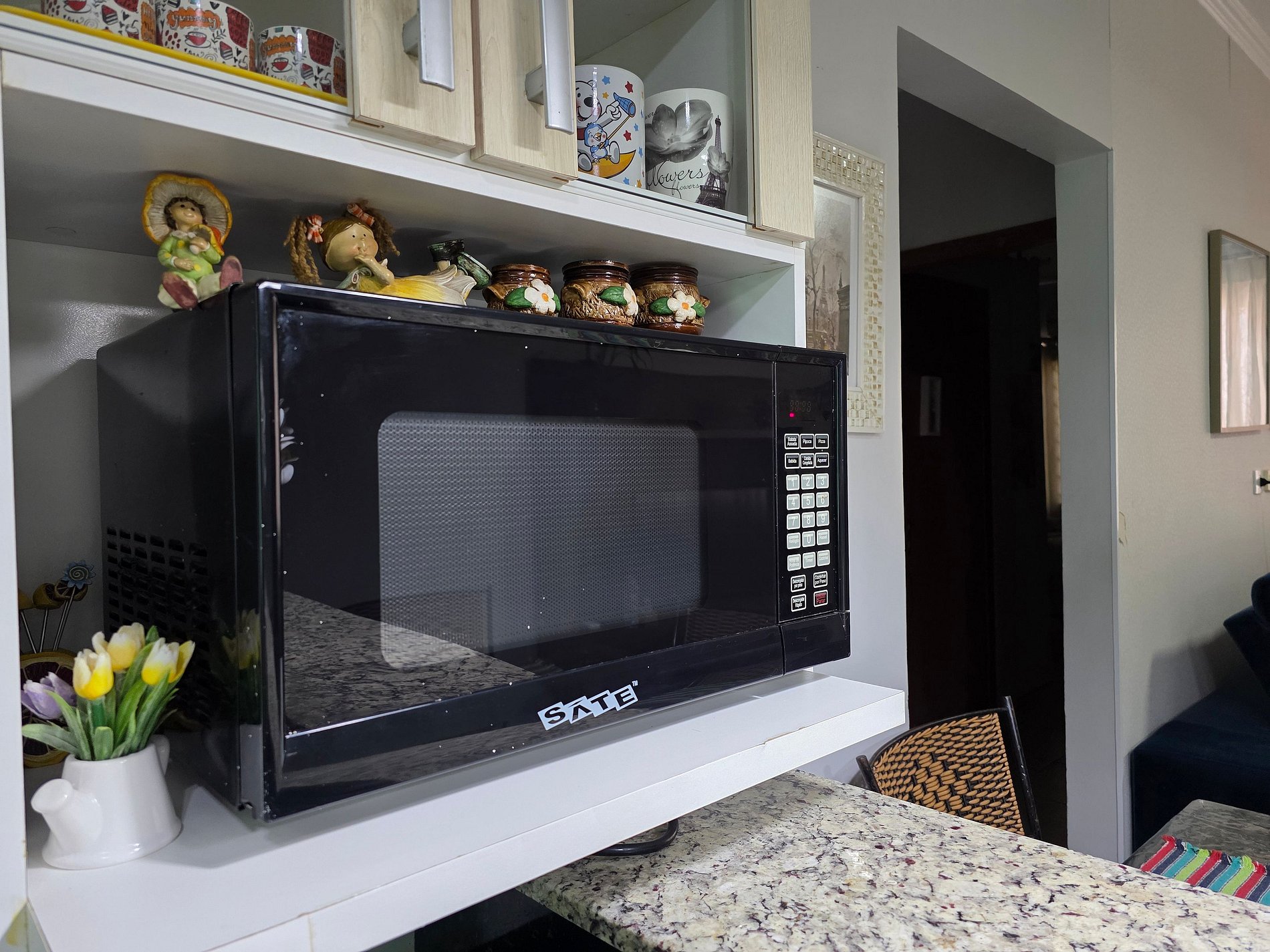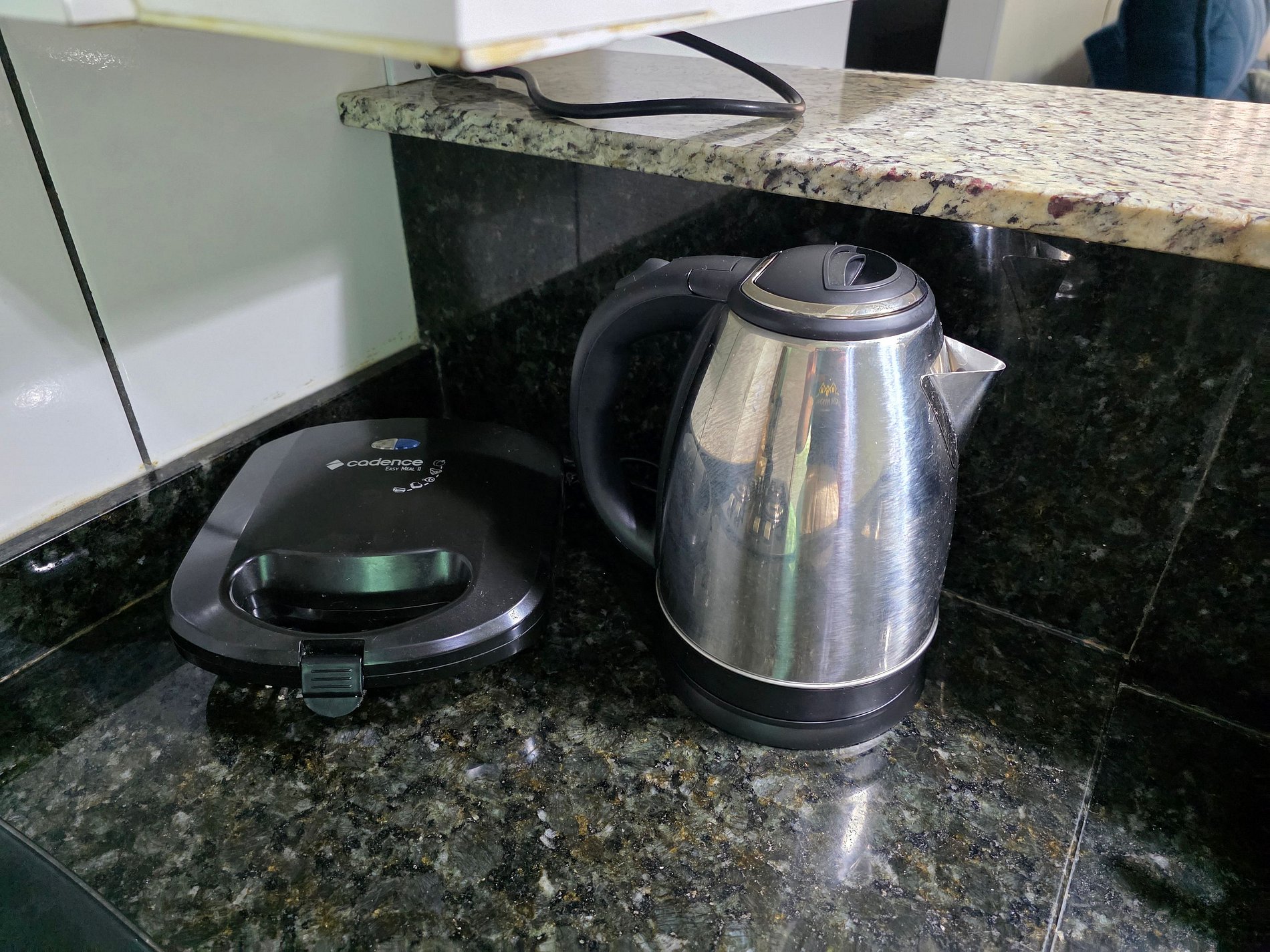 Cozinha completa com utensílios e louças para as refeições, fogão com forno, microondas, liquidificador, sanduicheira e chaleira elétrica.