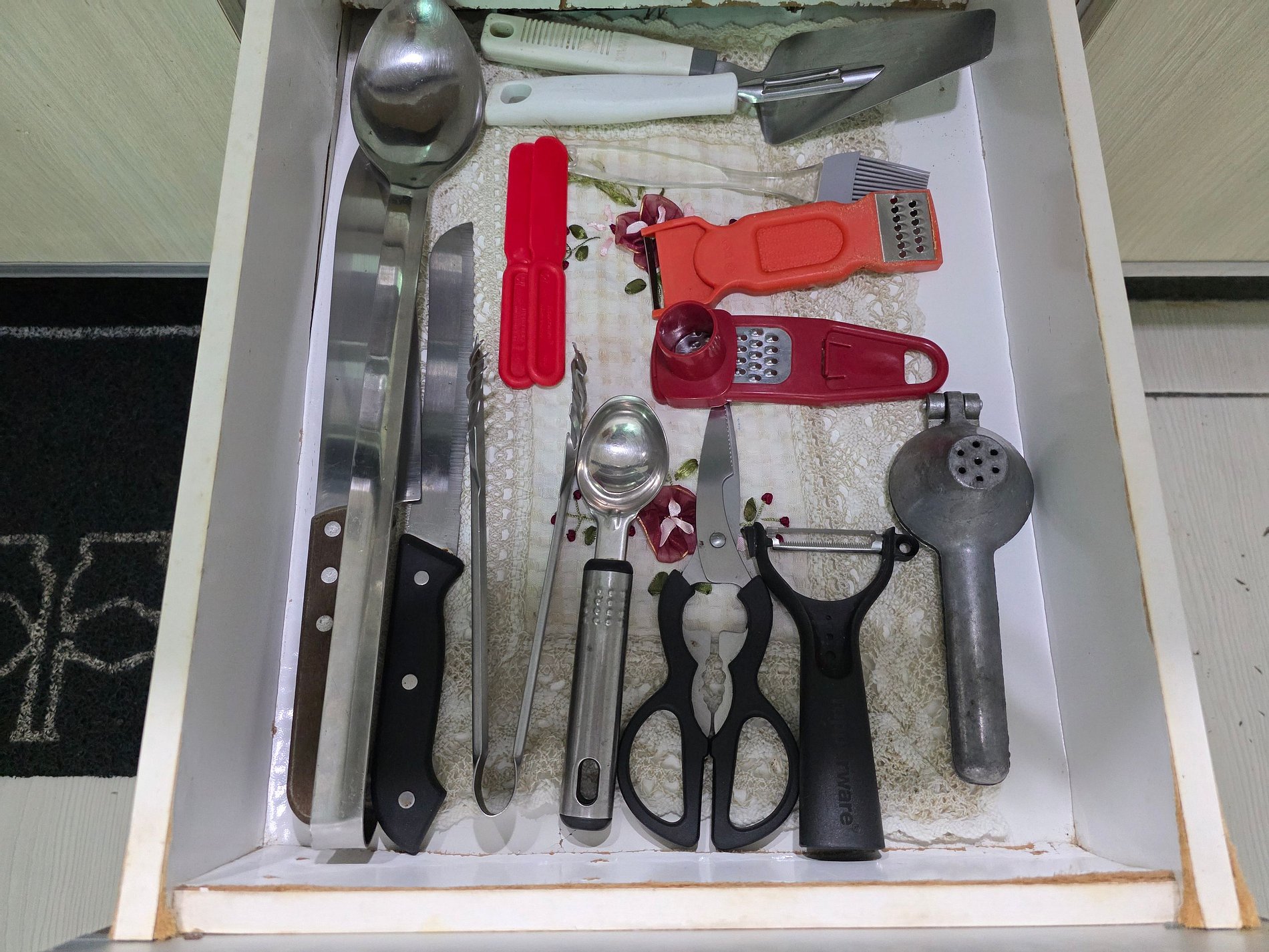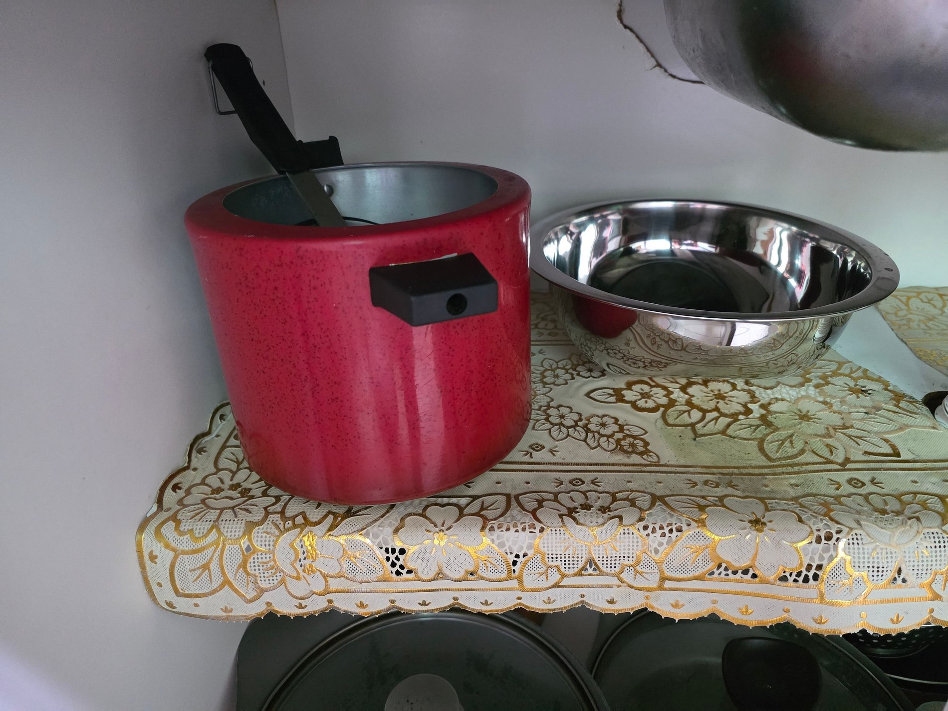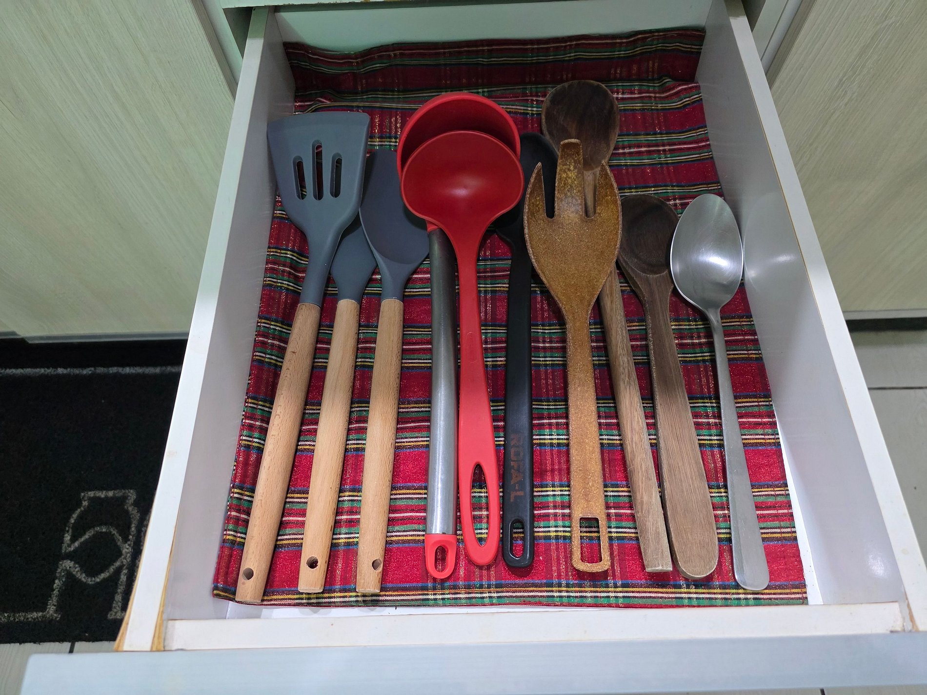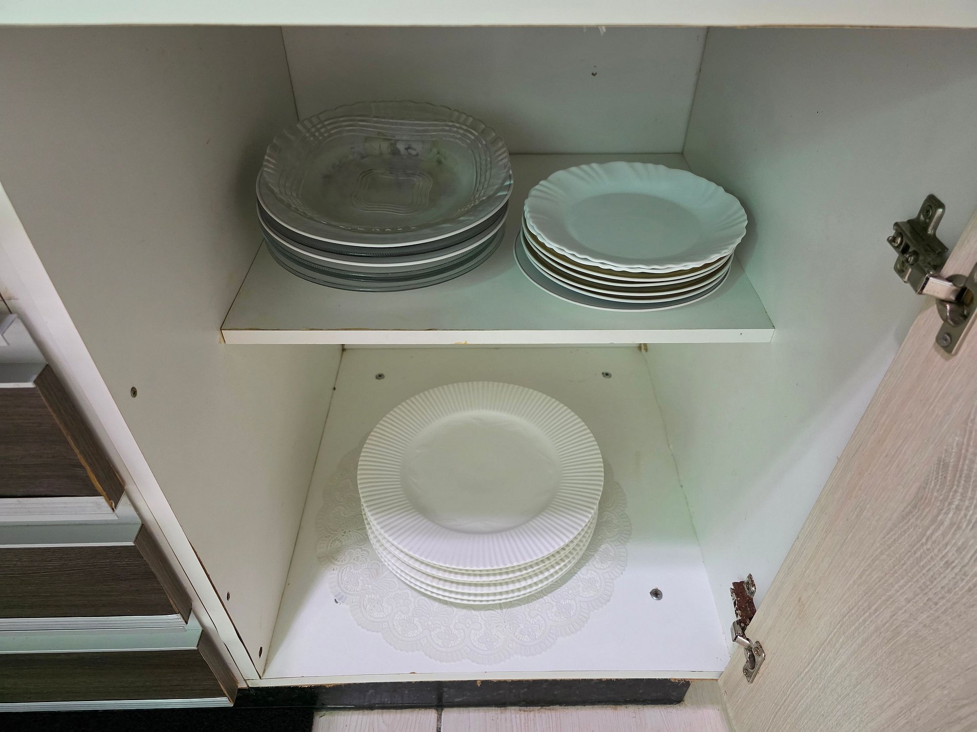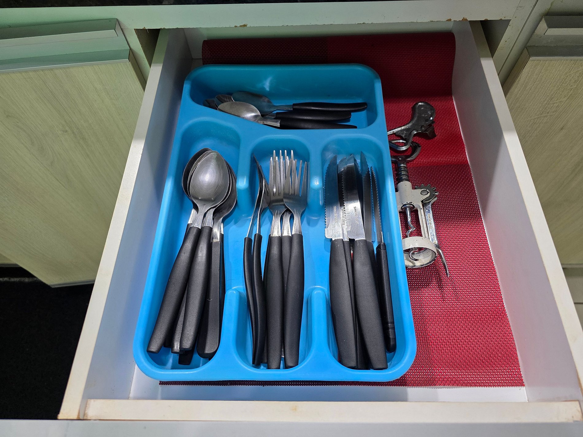 Cozinha completa com utensílios e louças para as refeições, fogão com forno, microondas, liquidificador, sanduicheira e chaleira elétrica.