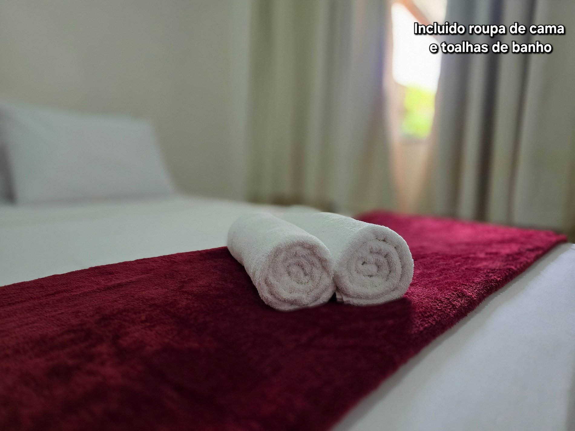 Incluimos roupas de cama, 1 toalha de banho por pessoa, 1 toalha de rosto no banheiro e 1 manta por cama.
