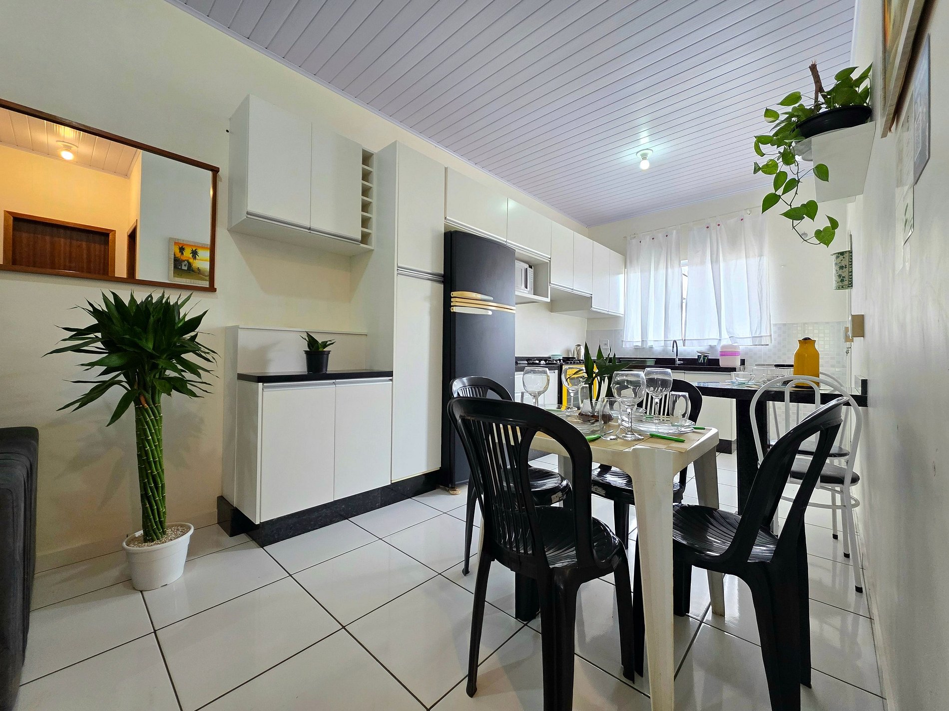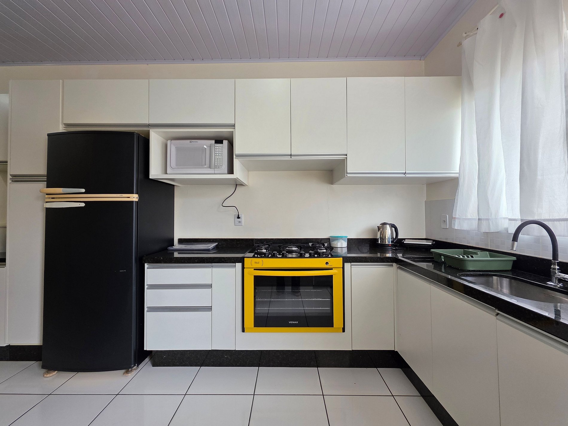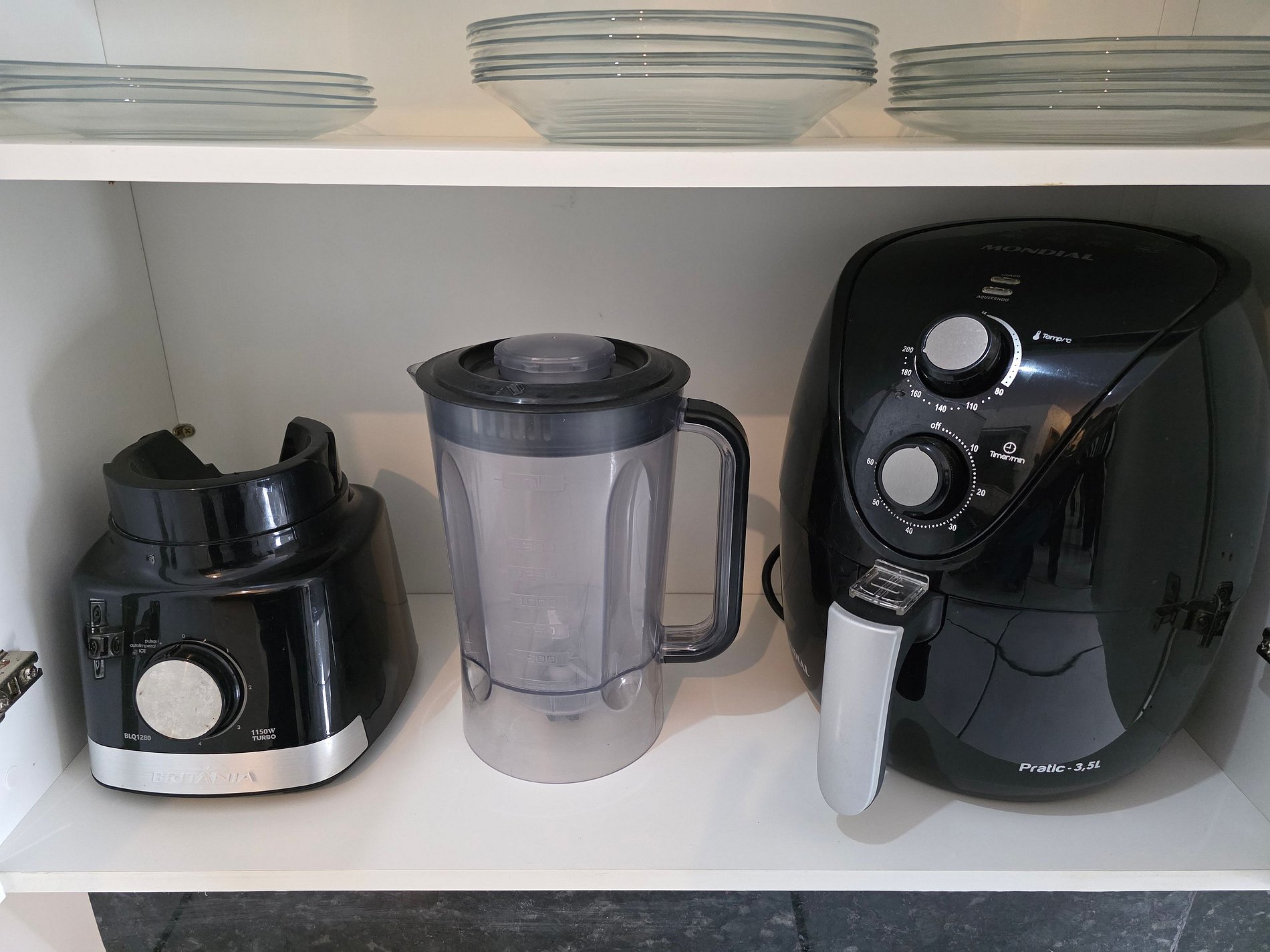 Cozinha completa com utensílios e louças para as refeições, fogão com forno, microondas, liquidificador, sanduicheira e Airfryer.