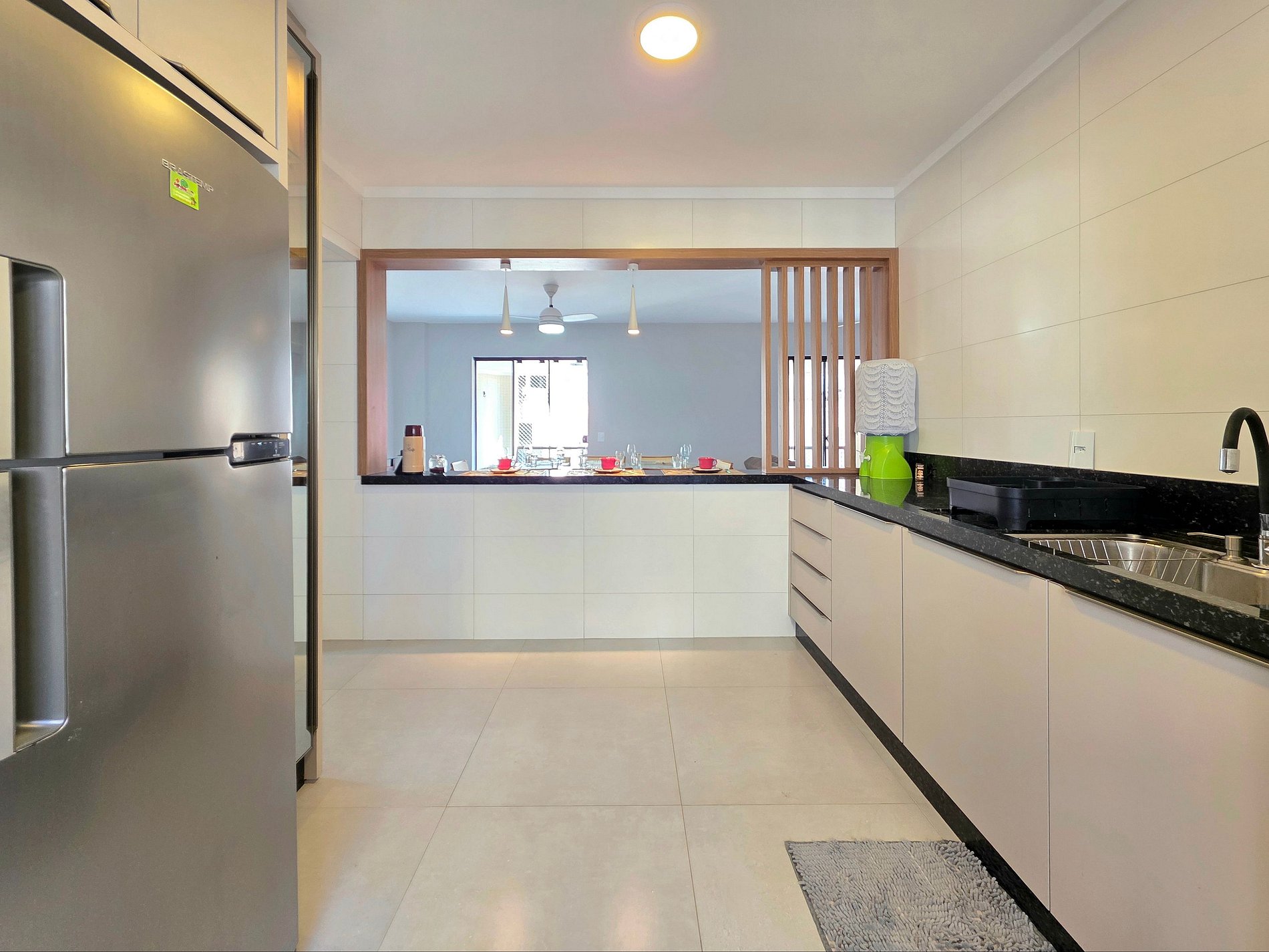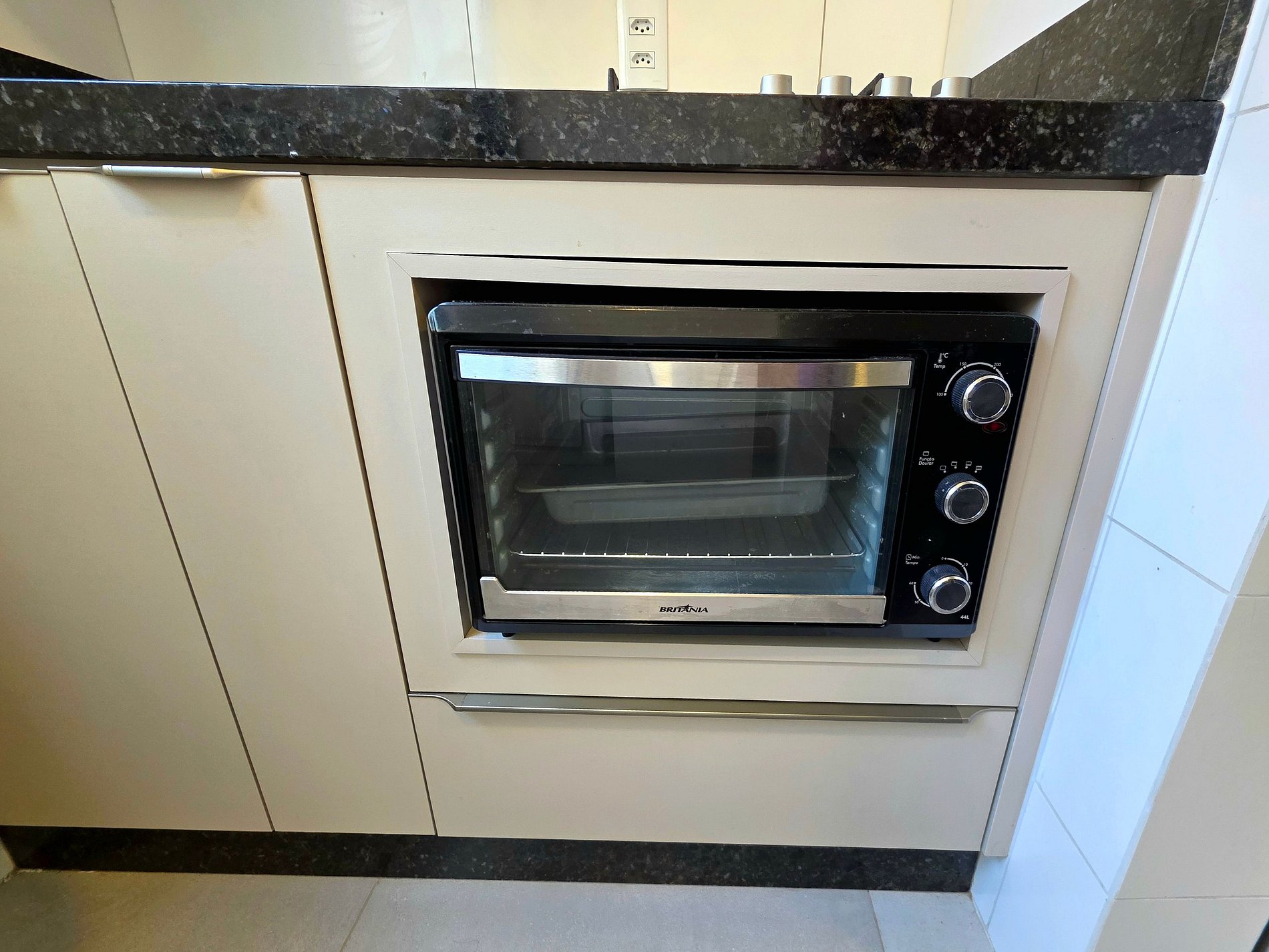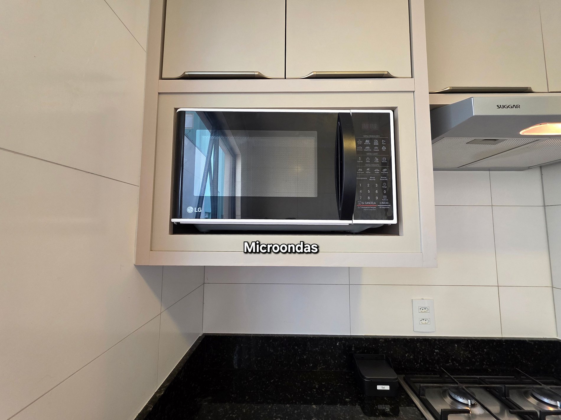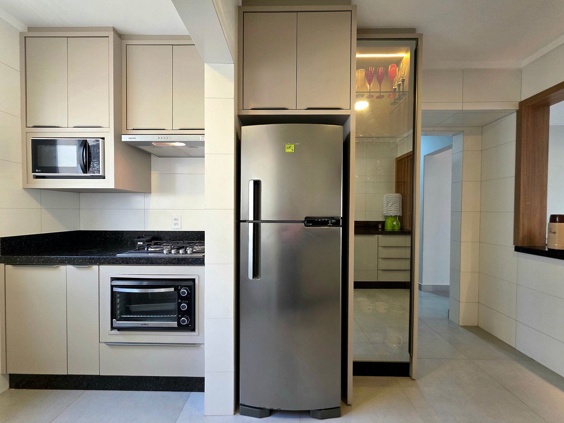 Cozinha completa com utensílios e louças para as refeições, microondas, forno, liquidificador, sanduicheira.