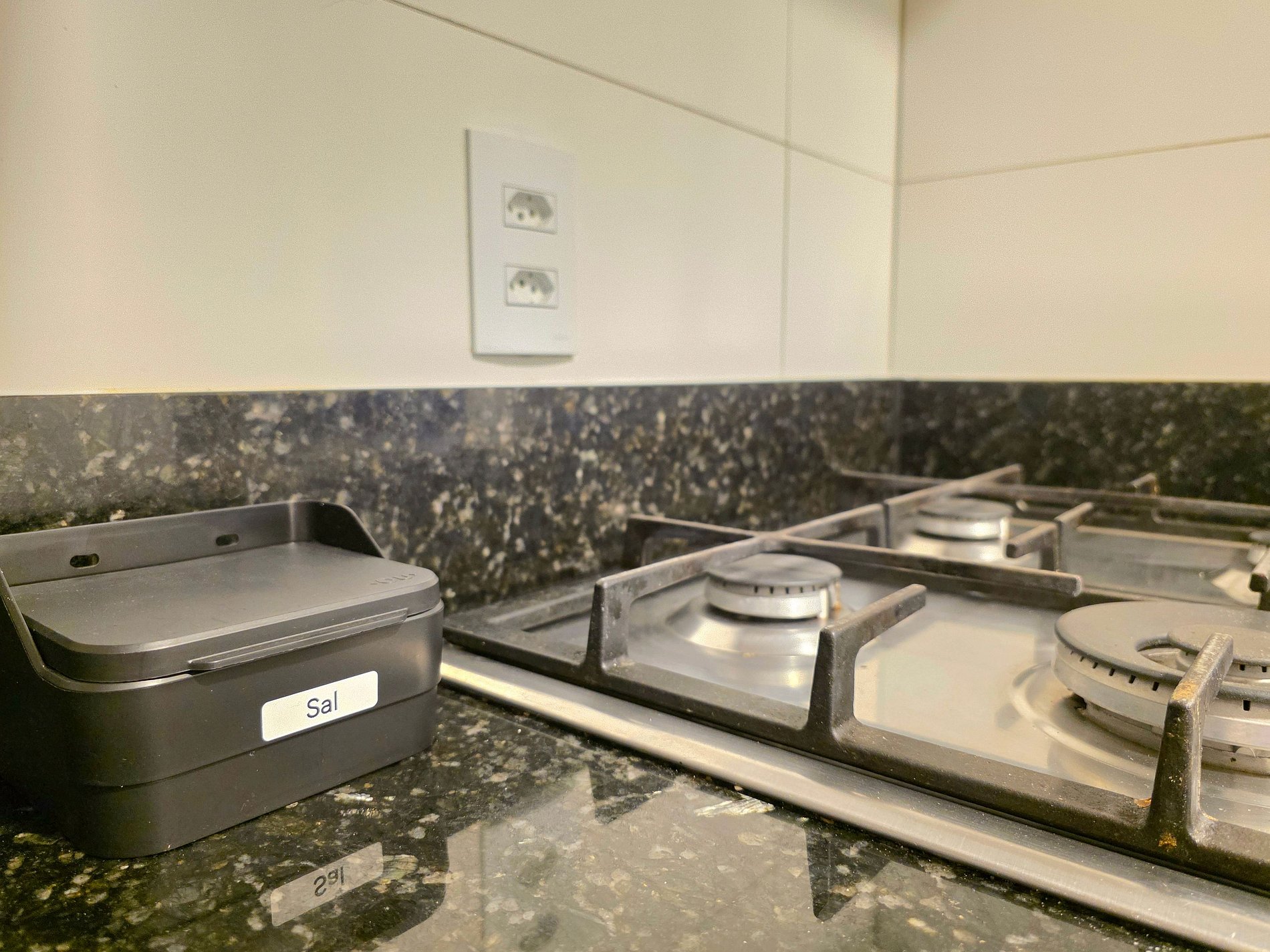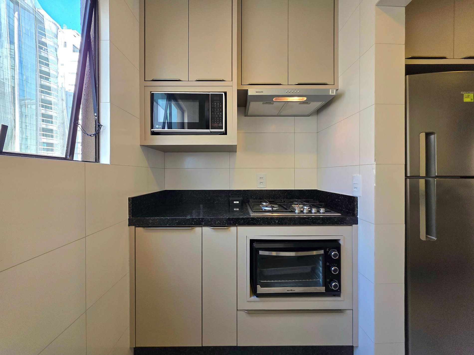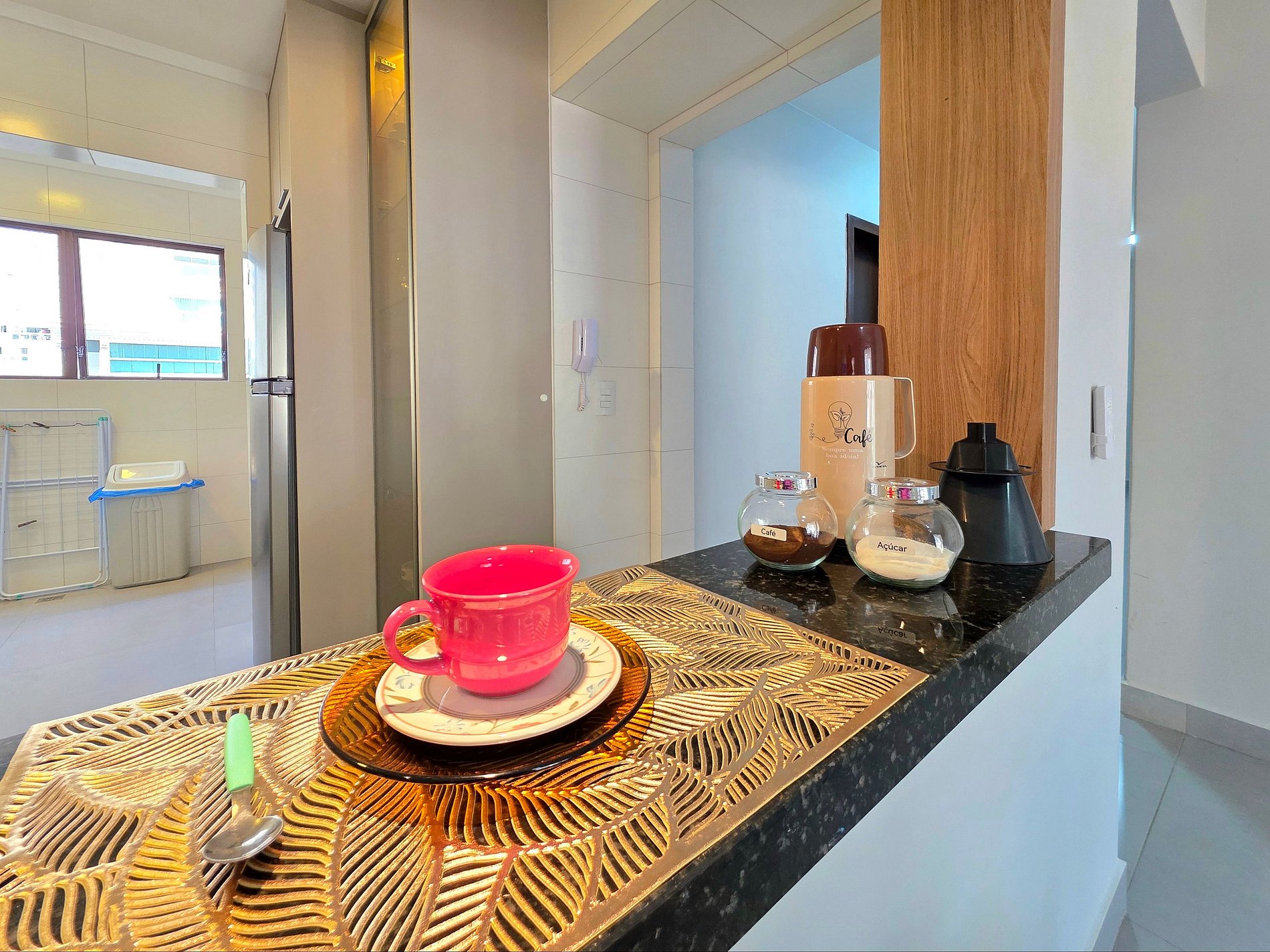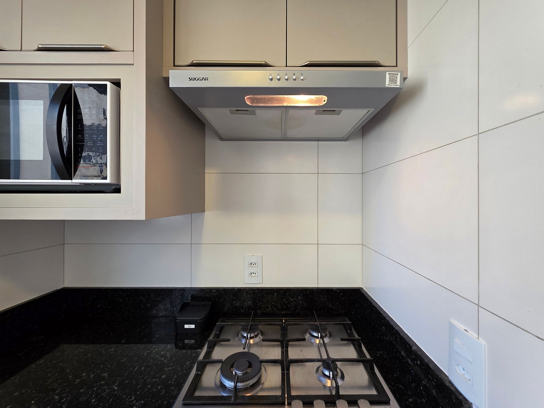 Cozinha completa com utensílios e louças para as refeições, microondas, forno, liquidificador, sanduicheira.