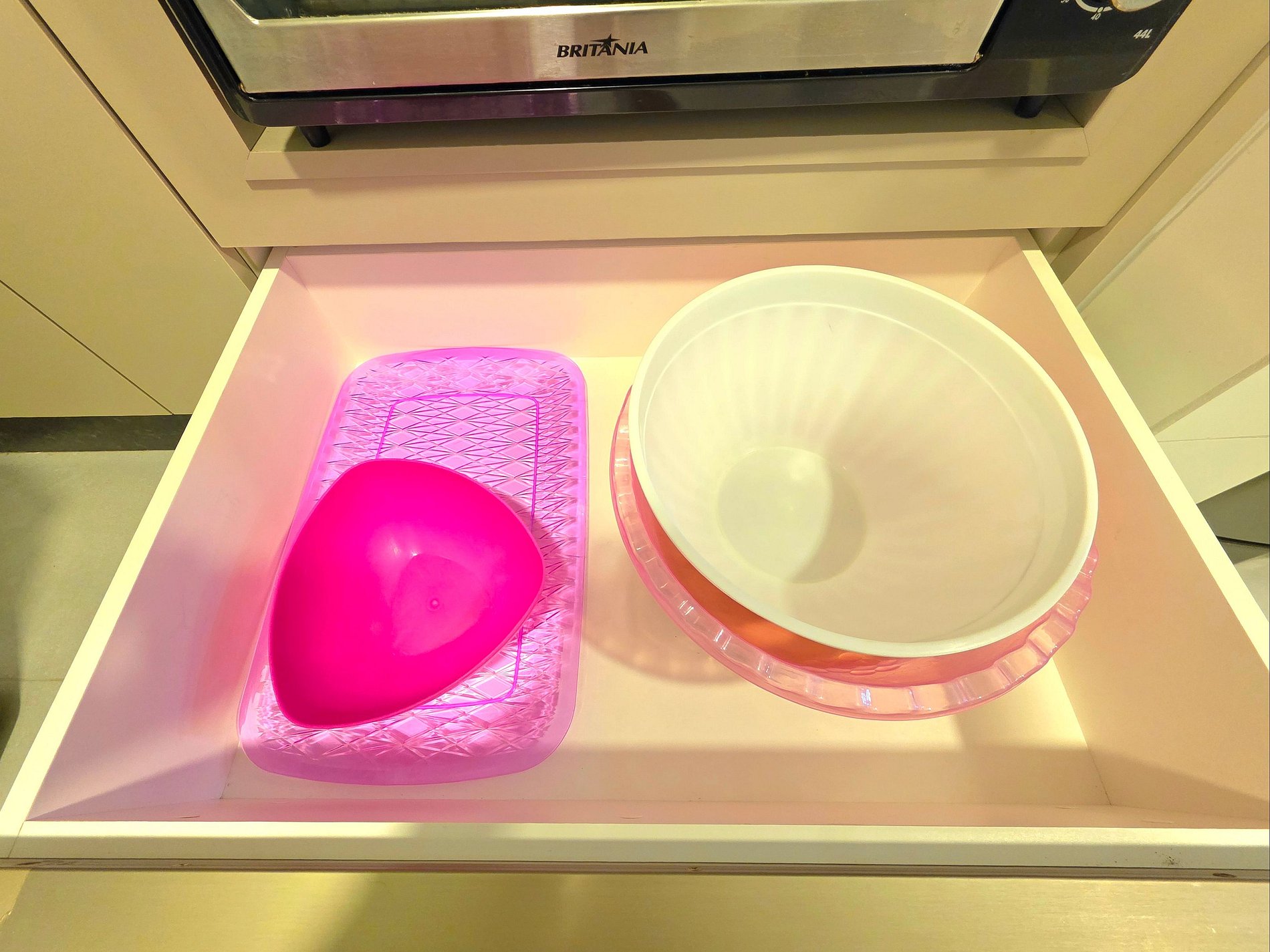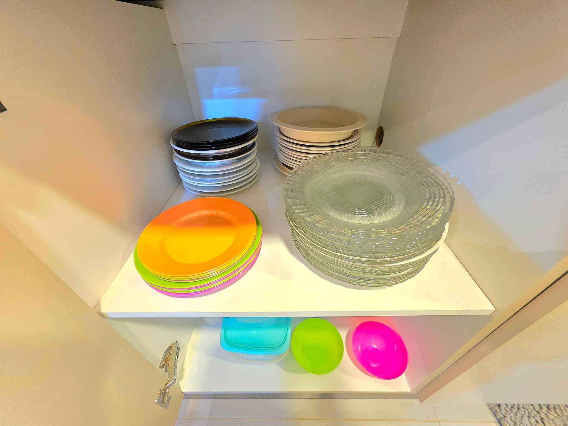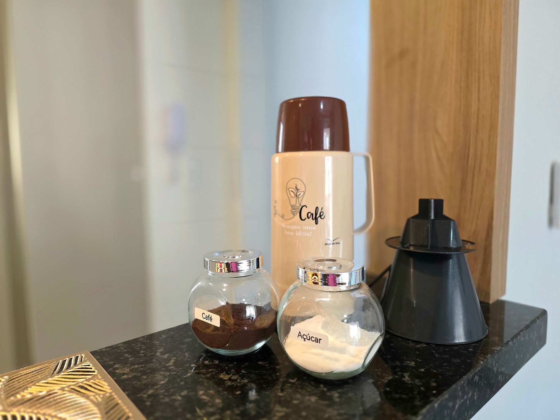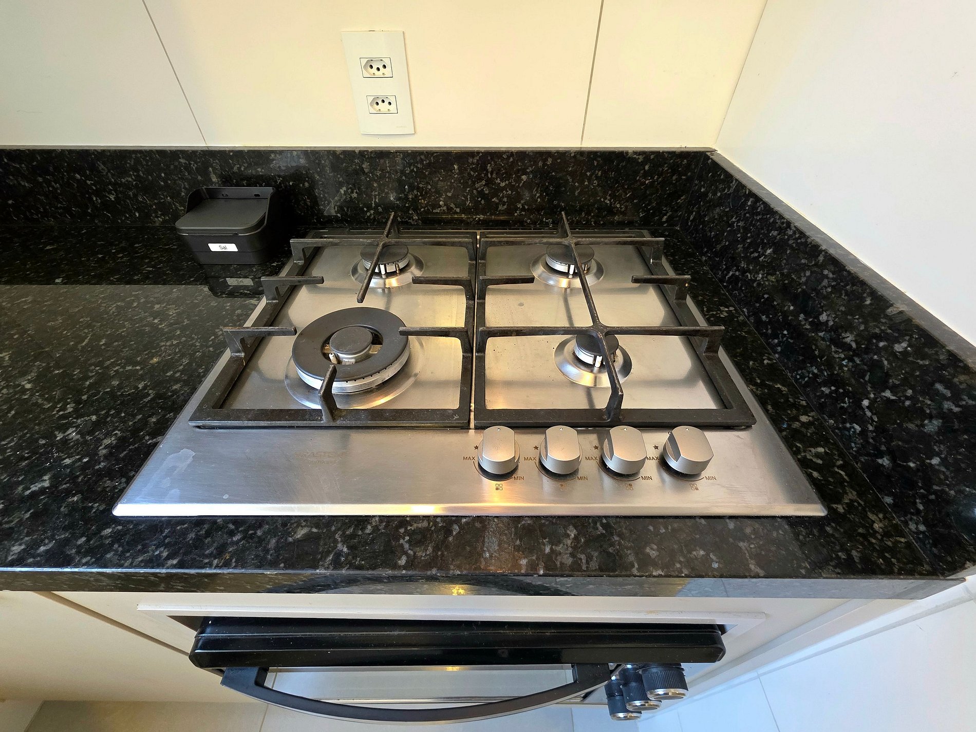 Cozinha completa com utensílios e louças para as refeições, microondas, forno, liquidificador, sanduicheira.