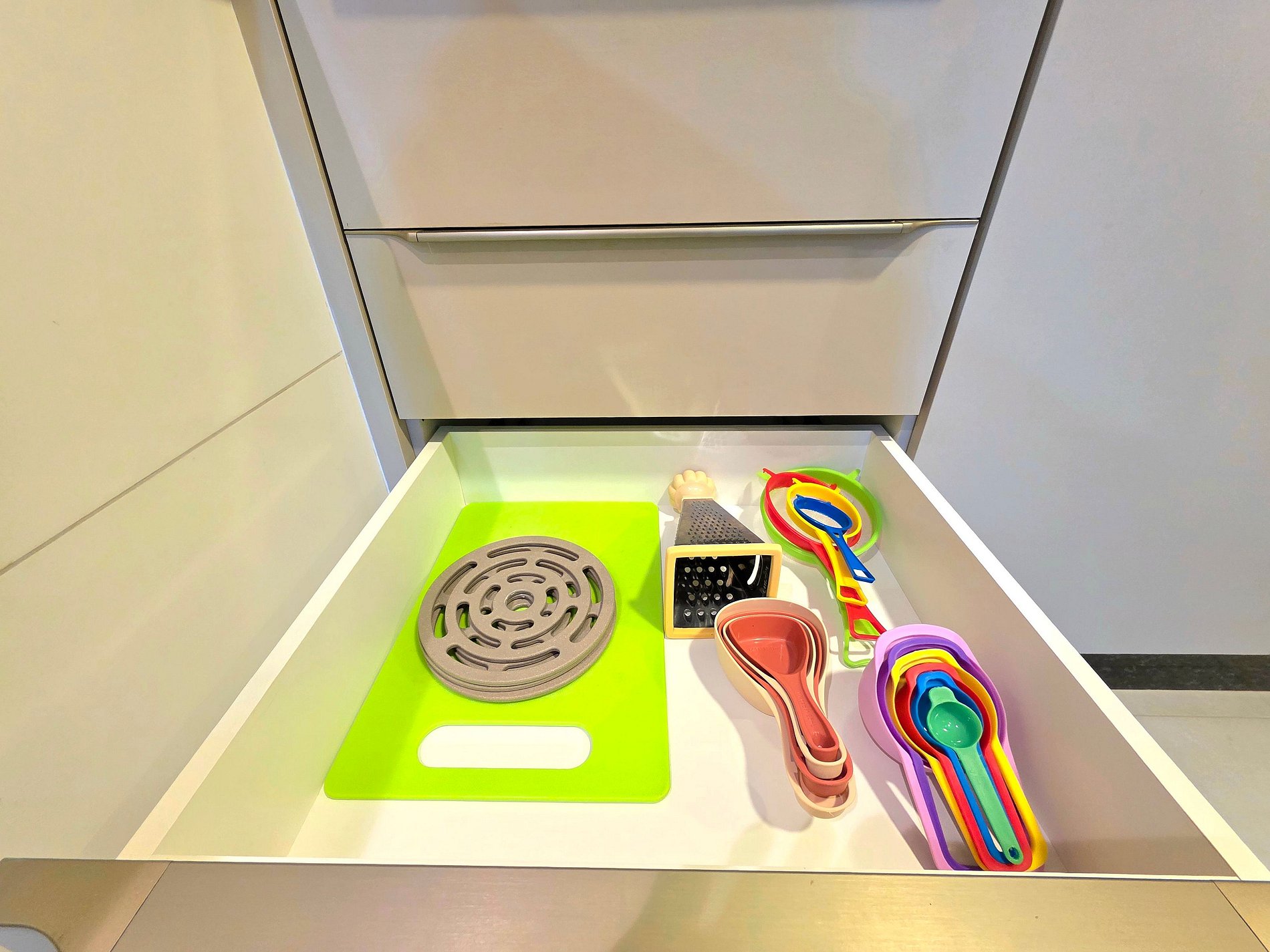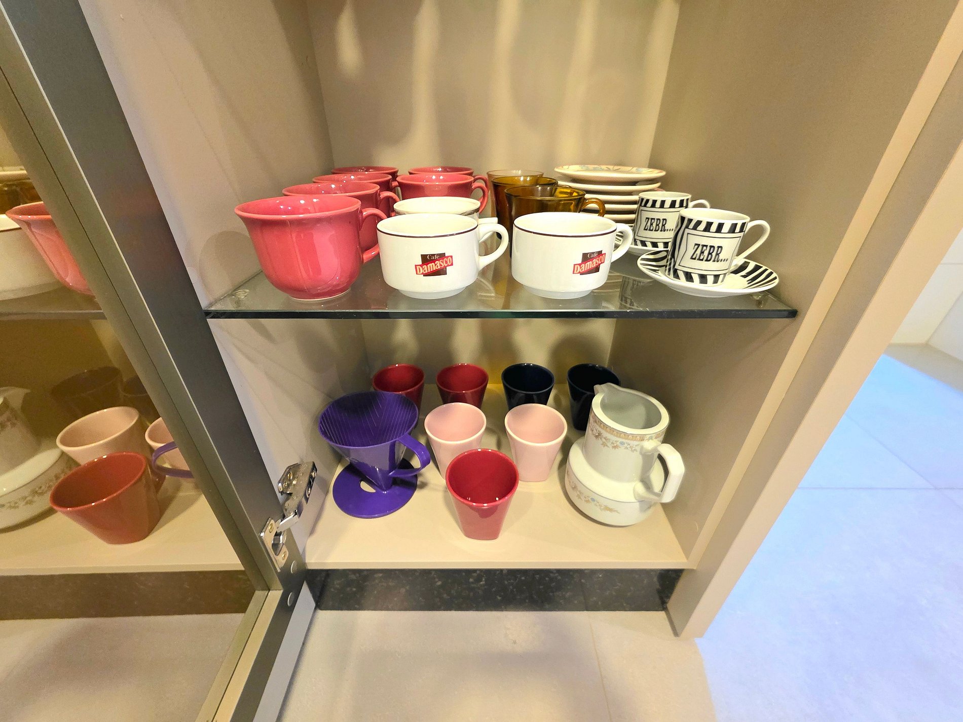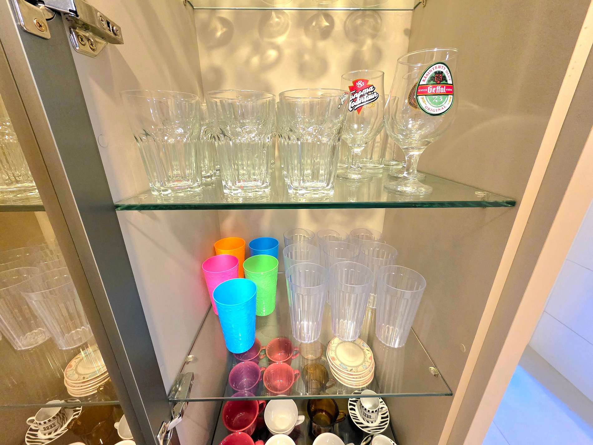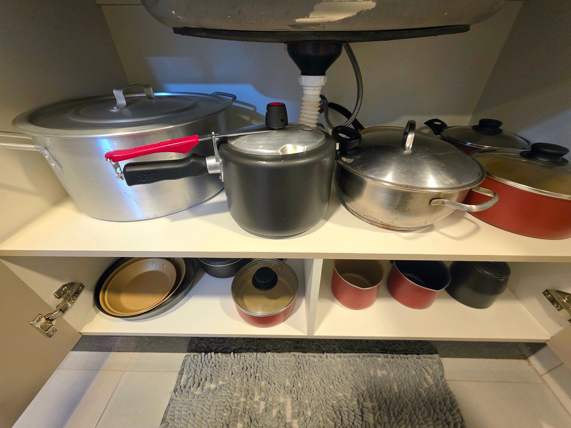 Cozinha completa com utensílios e louças para as refeições, microondas, forno, liquidificador, sanduicheira.