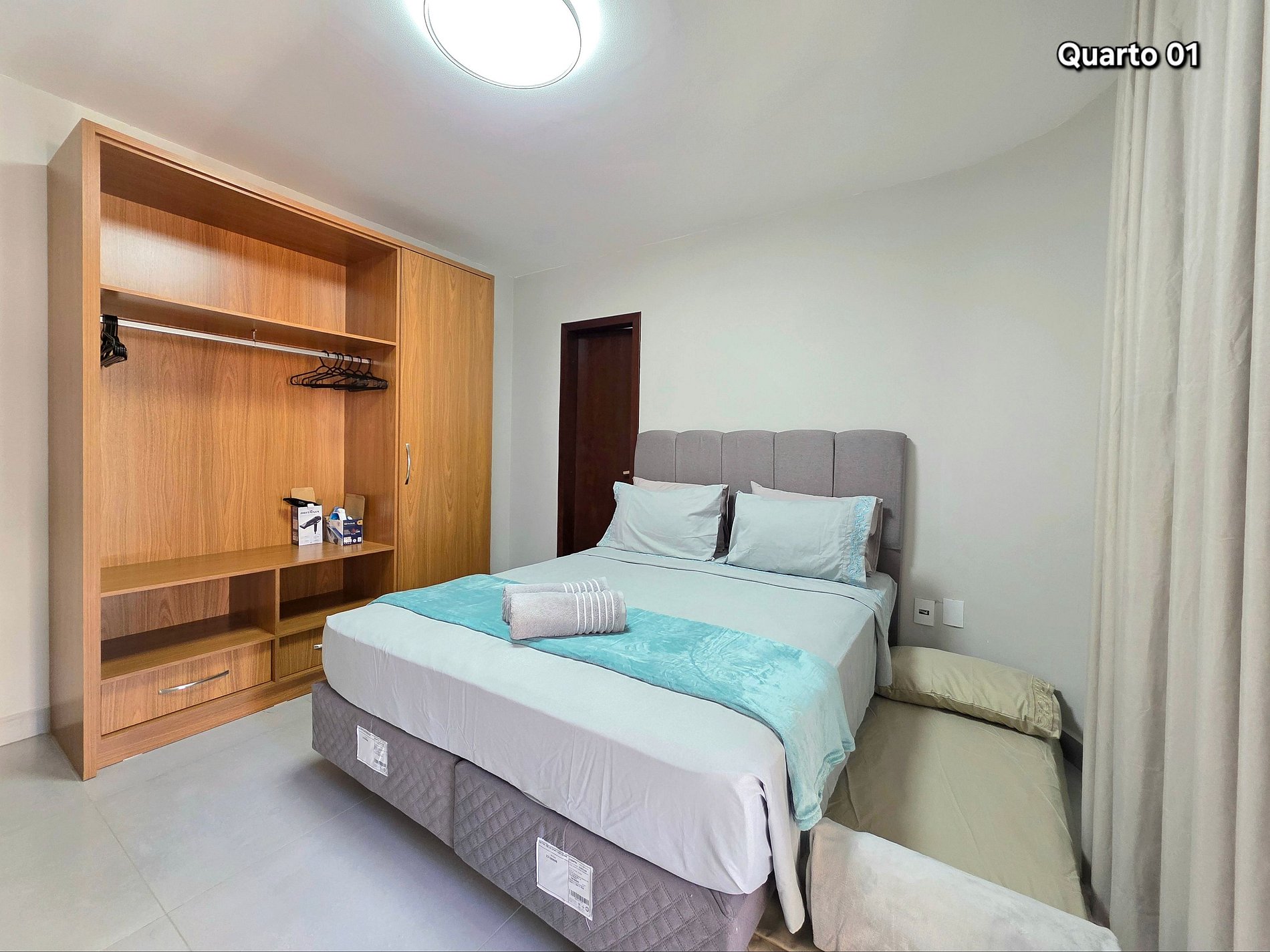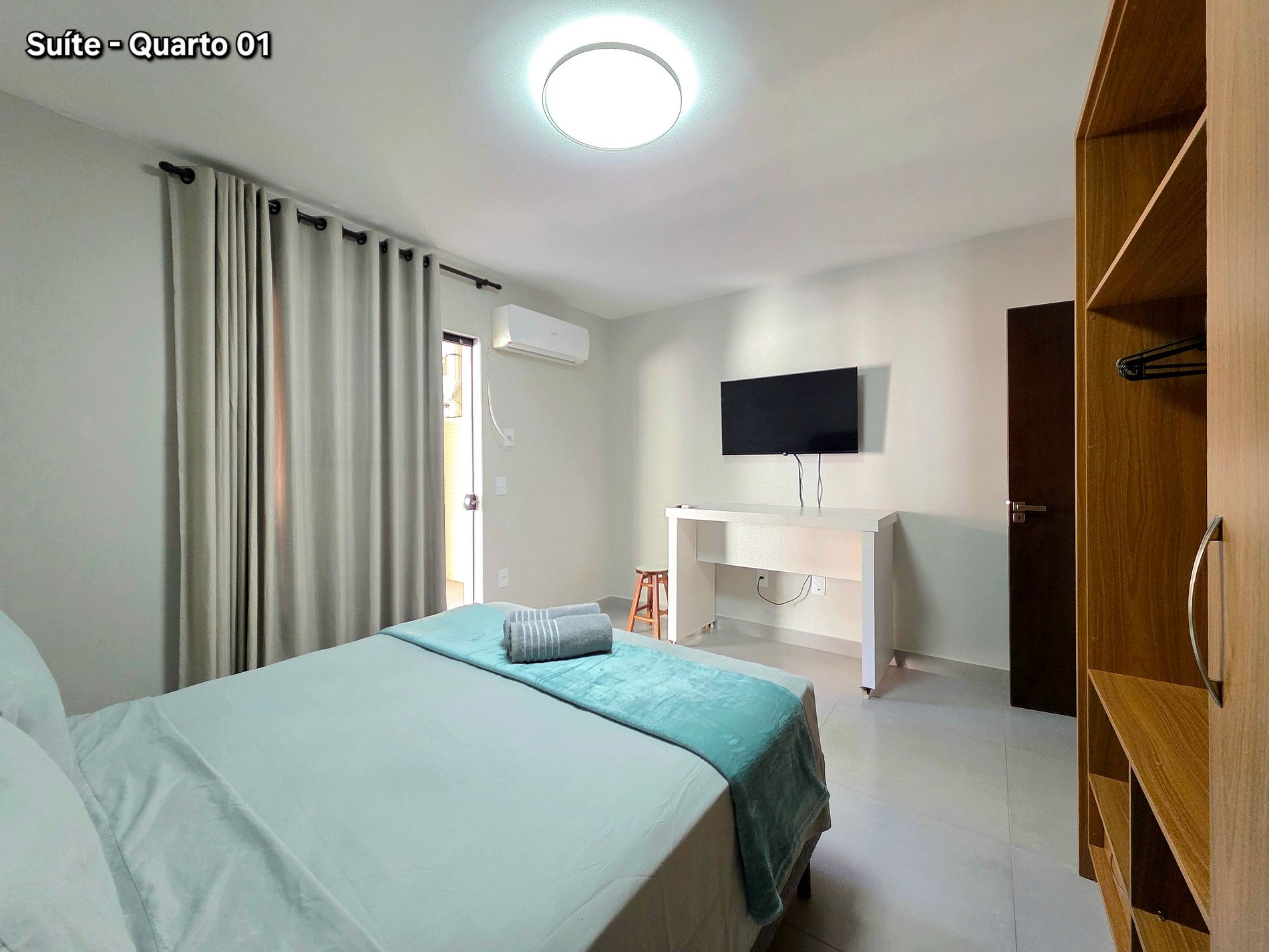 Quarto 01: 01 suíte com 01 cama de queensize + 01 cama de solteiro (com banheiro e ar condicionado)