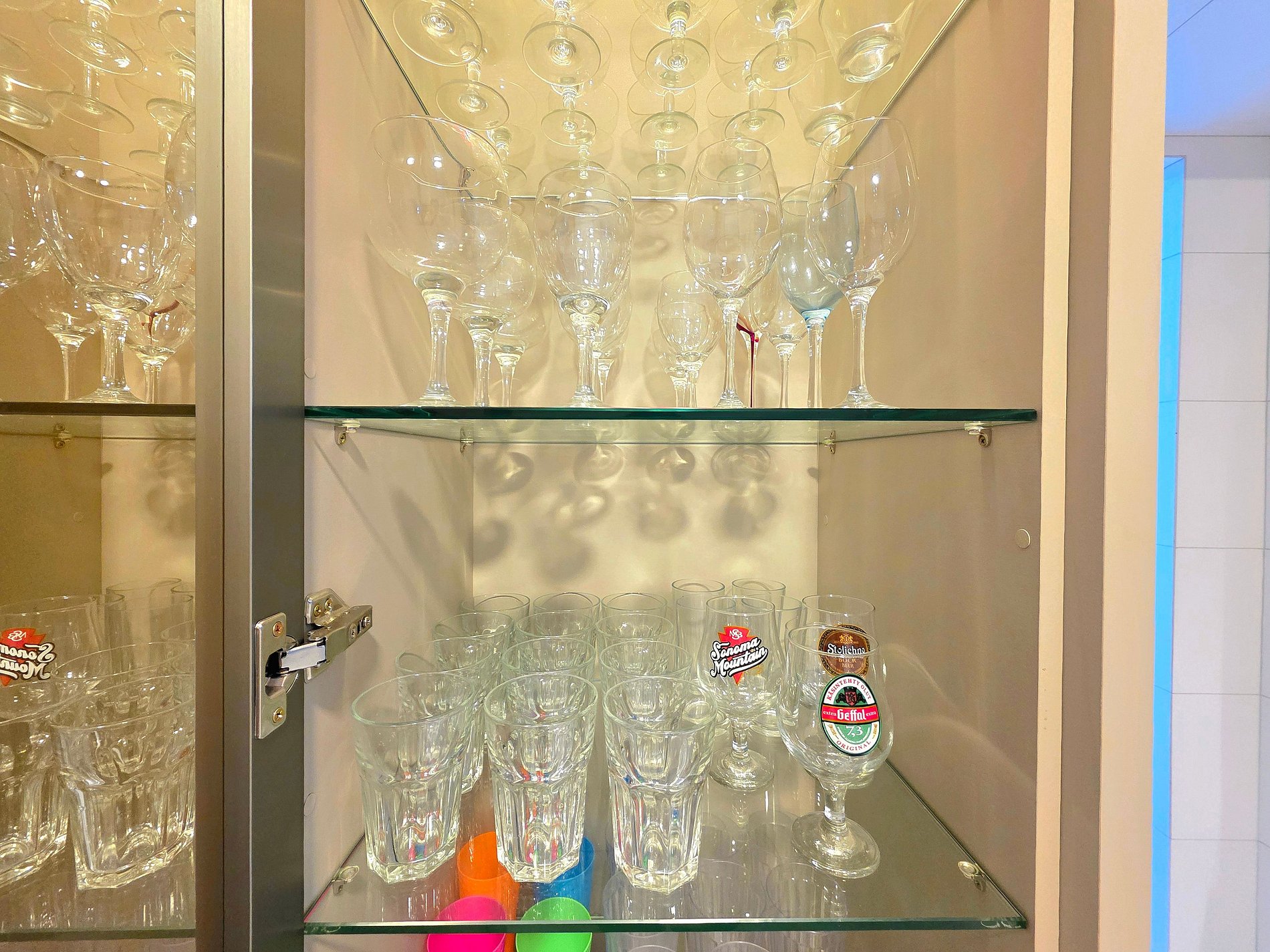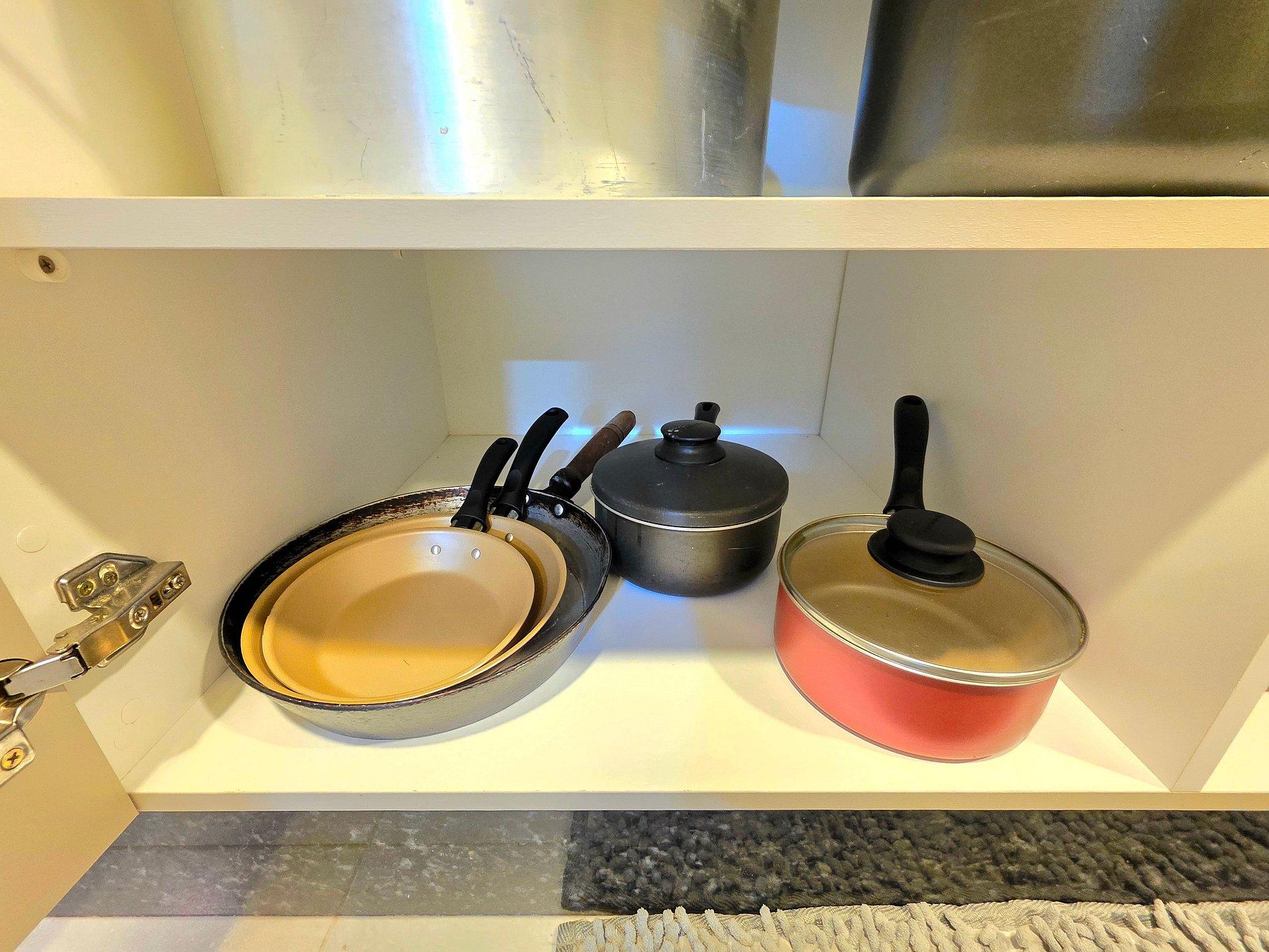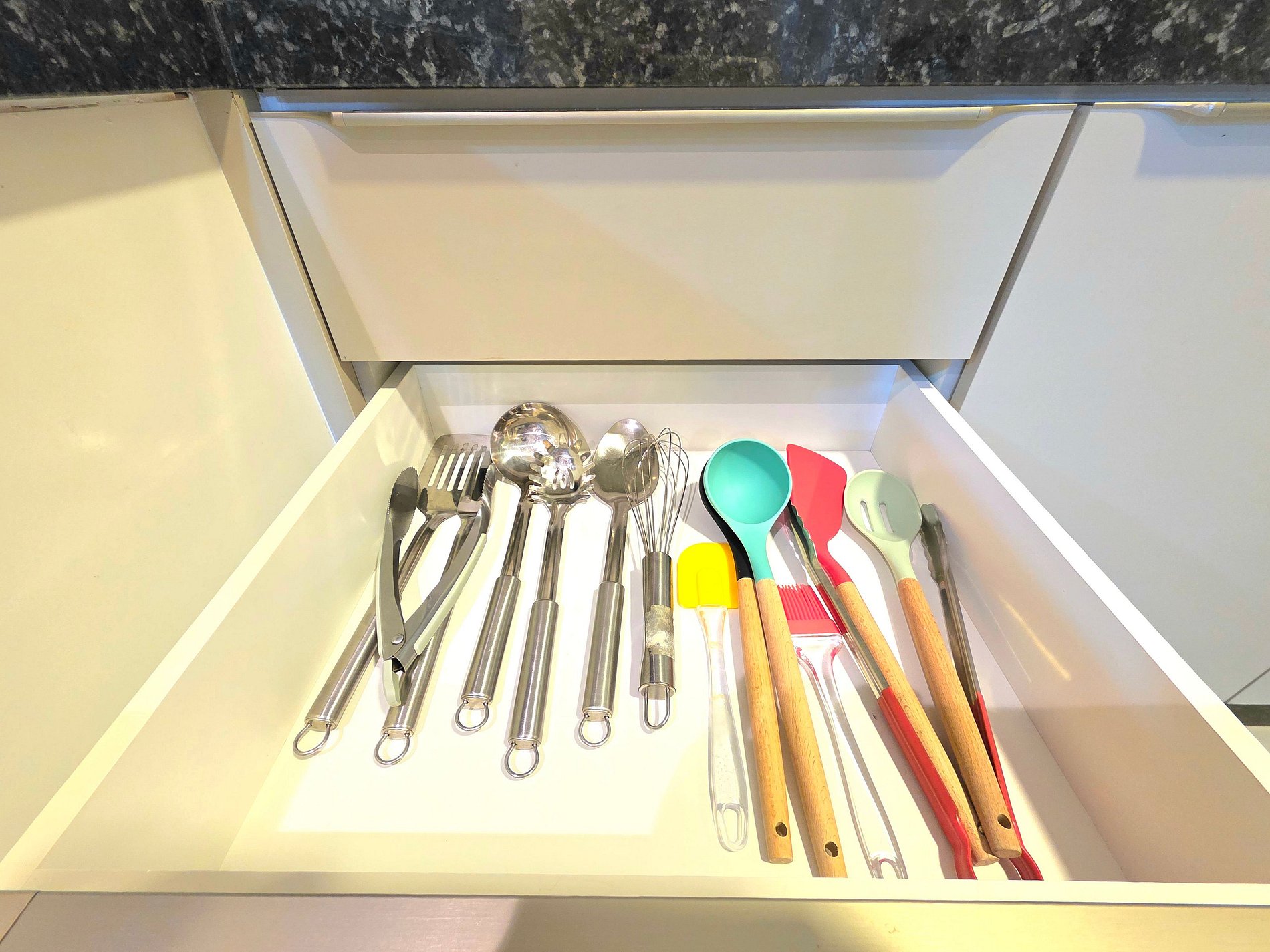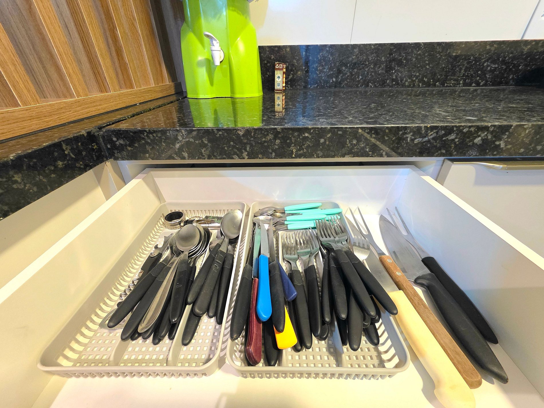 Cozinha completa com utensílios e louças para as refeições, microondas, forno, liquidificador, sanduicheira.
