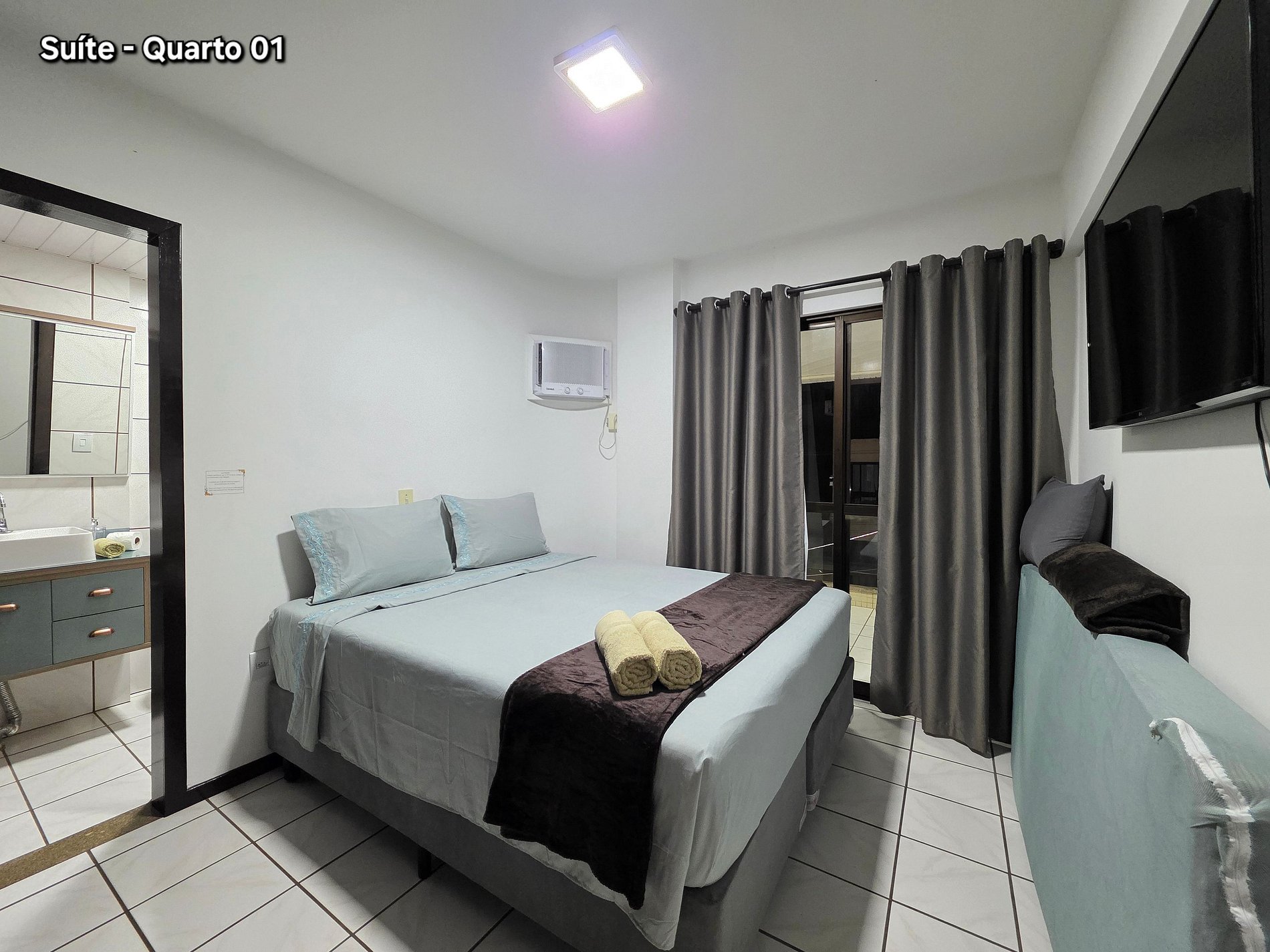 Quarto 01: suíte com 01 cama de queensize + 01 cama de solteiro (com banheiro e ar condicionado)