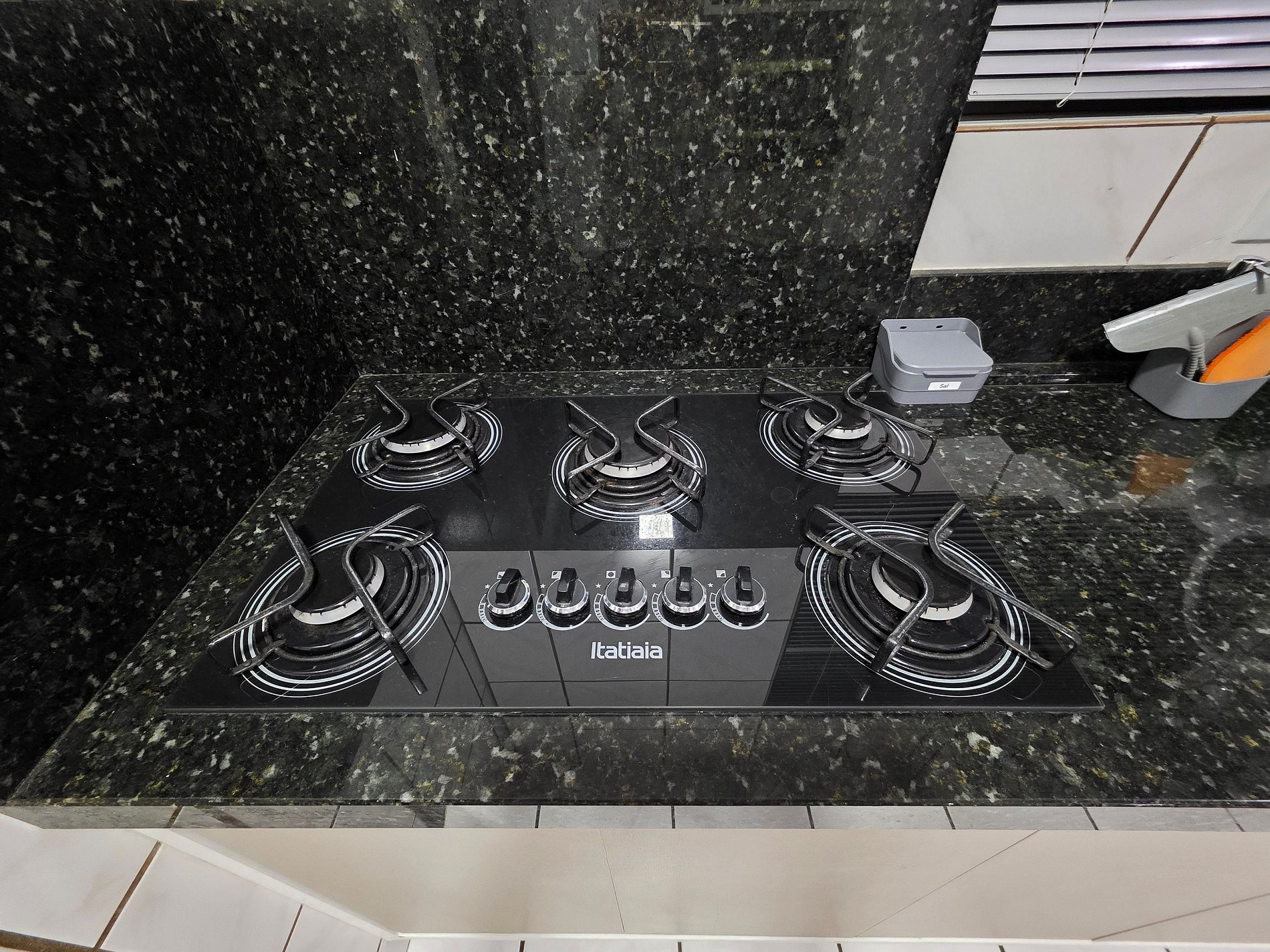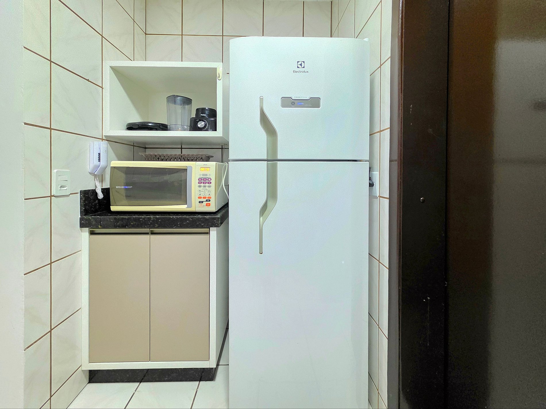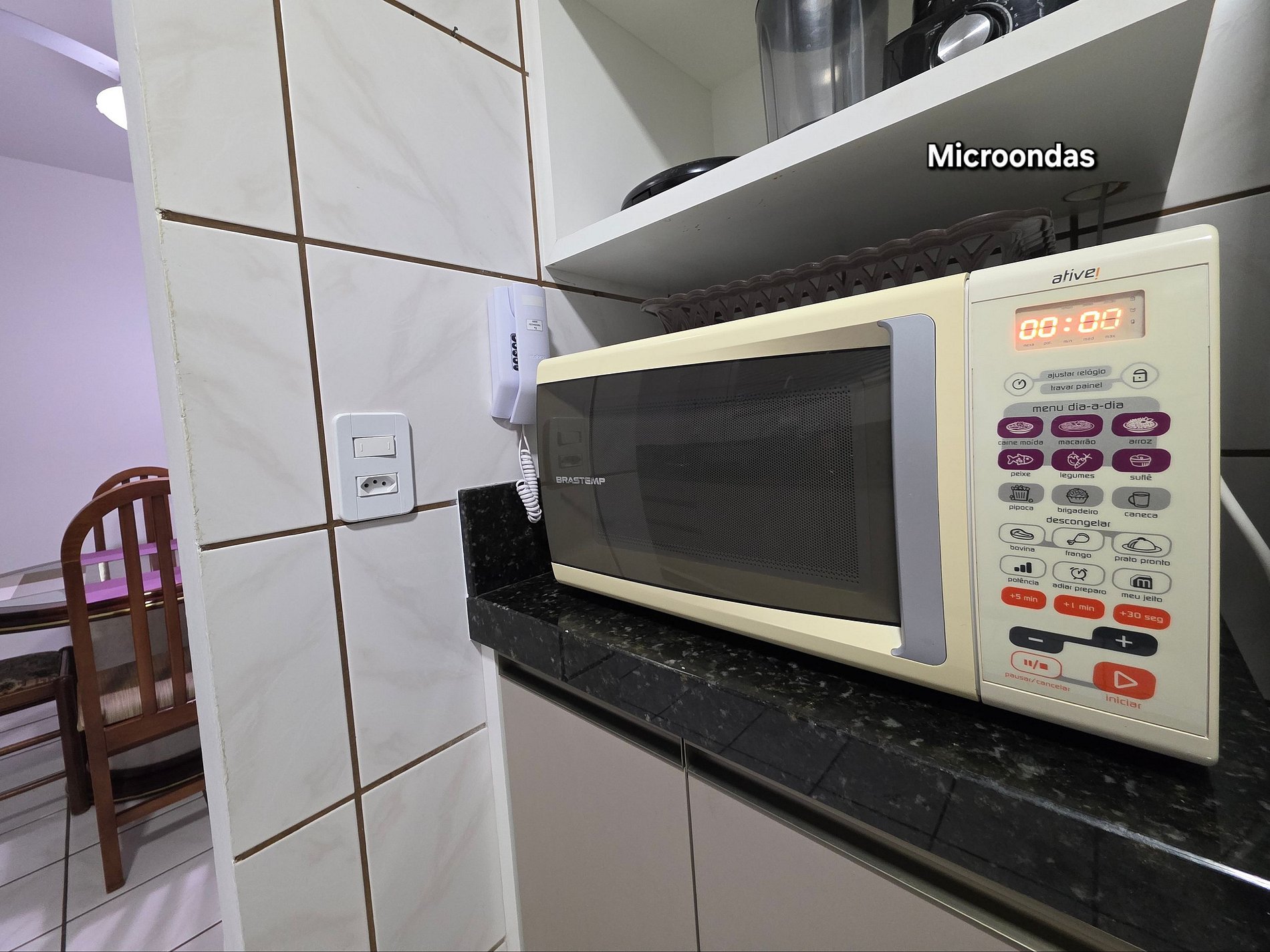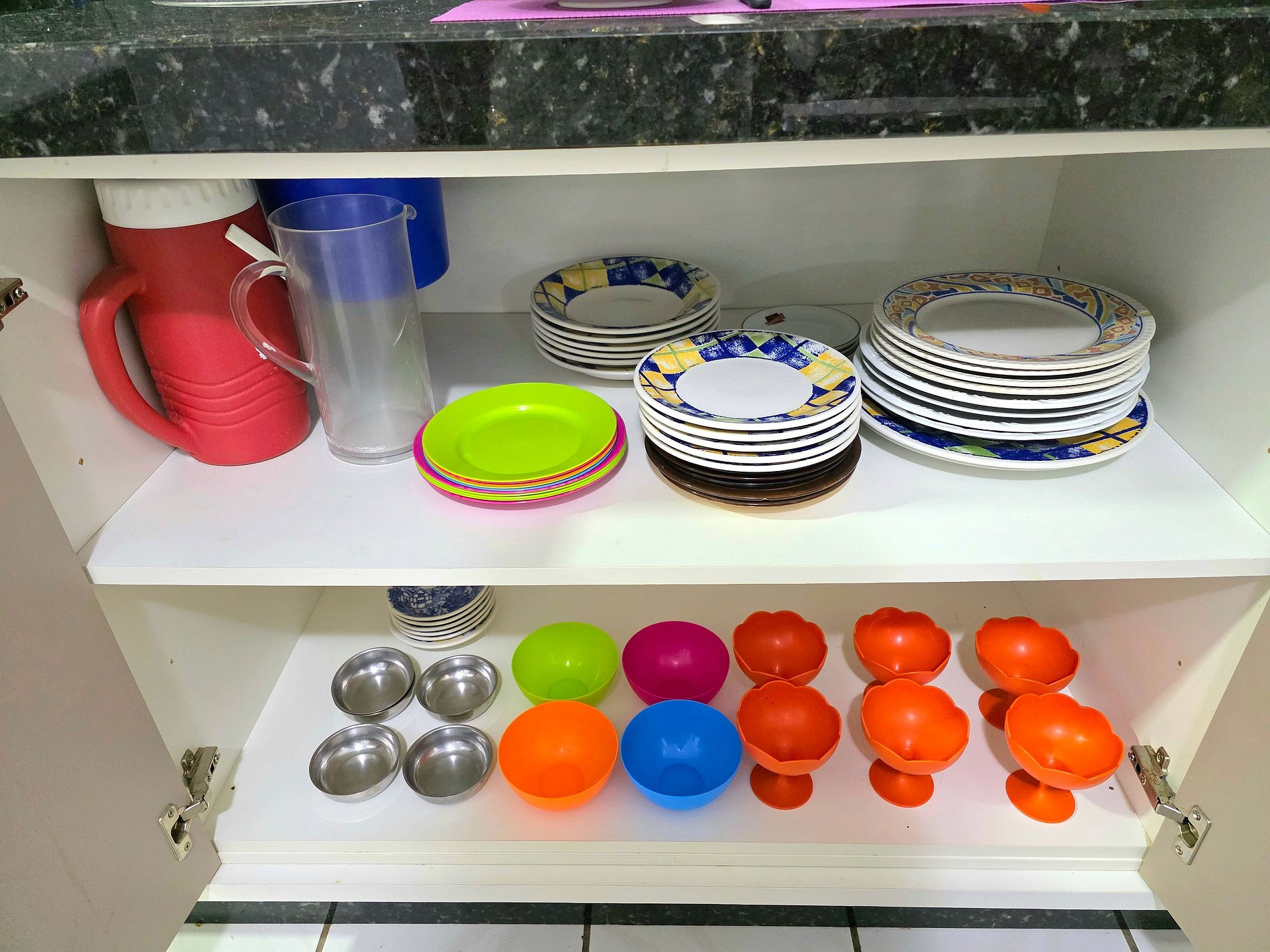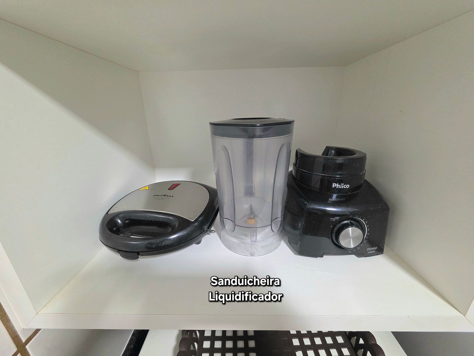 Cozinha completa com utensílios e louças para as refeições, microondas, forno, liquidificador, sanduicheira.