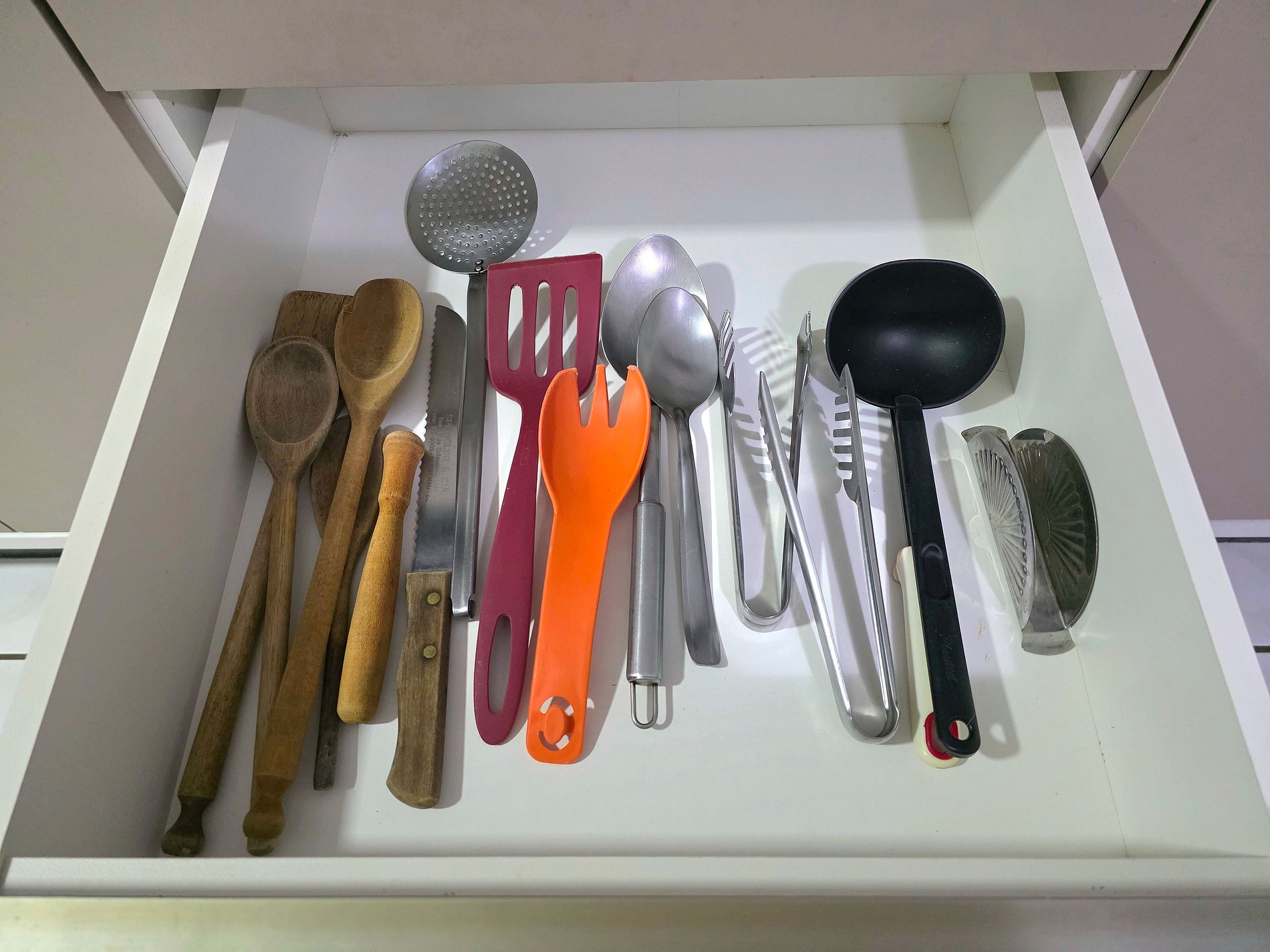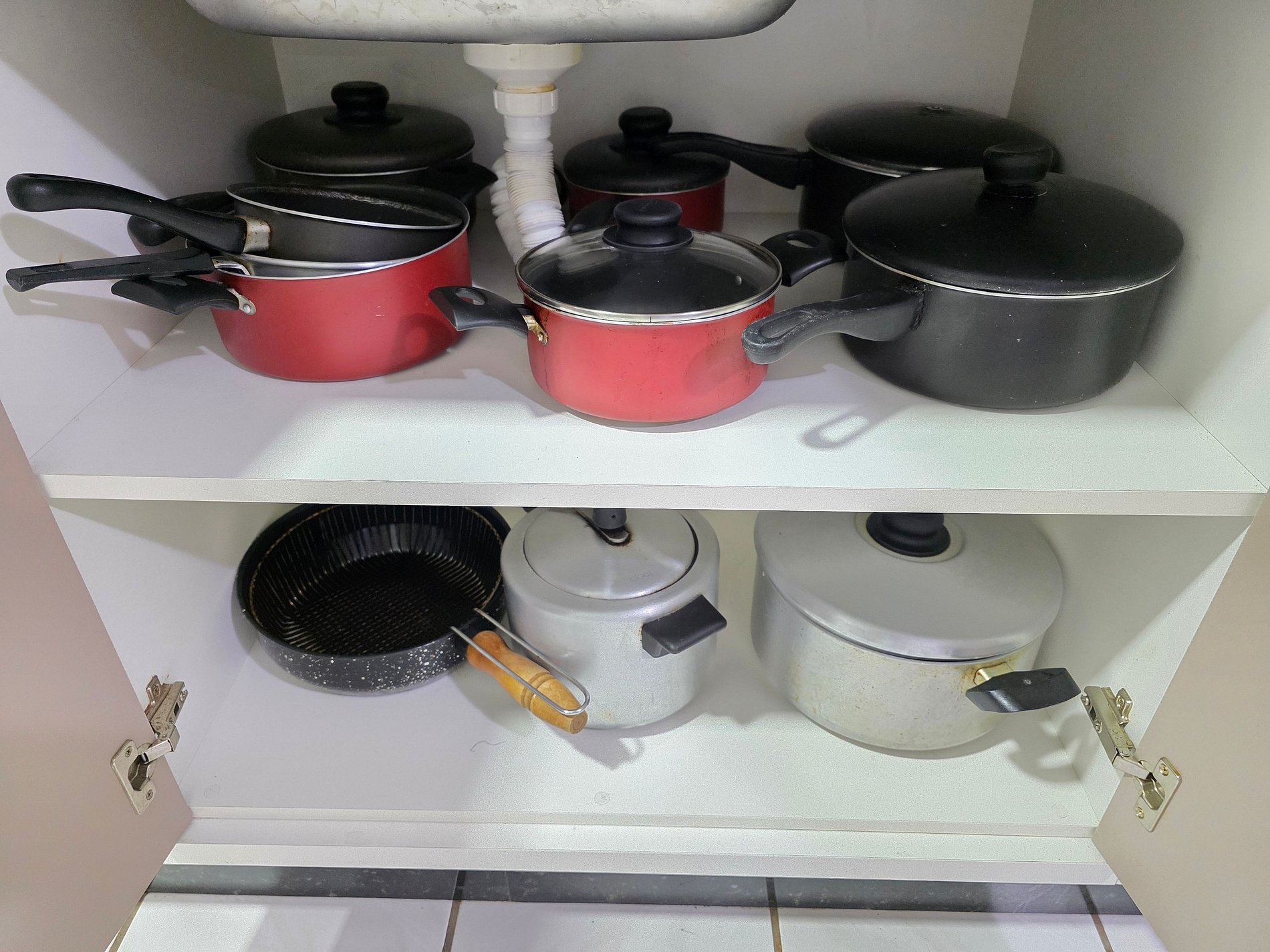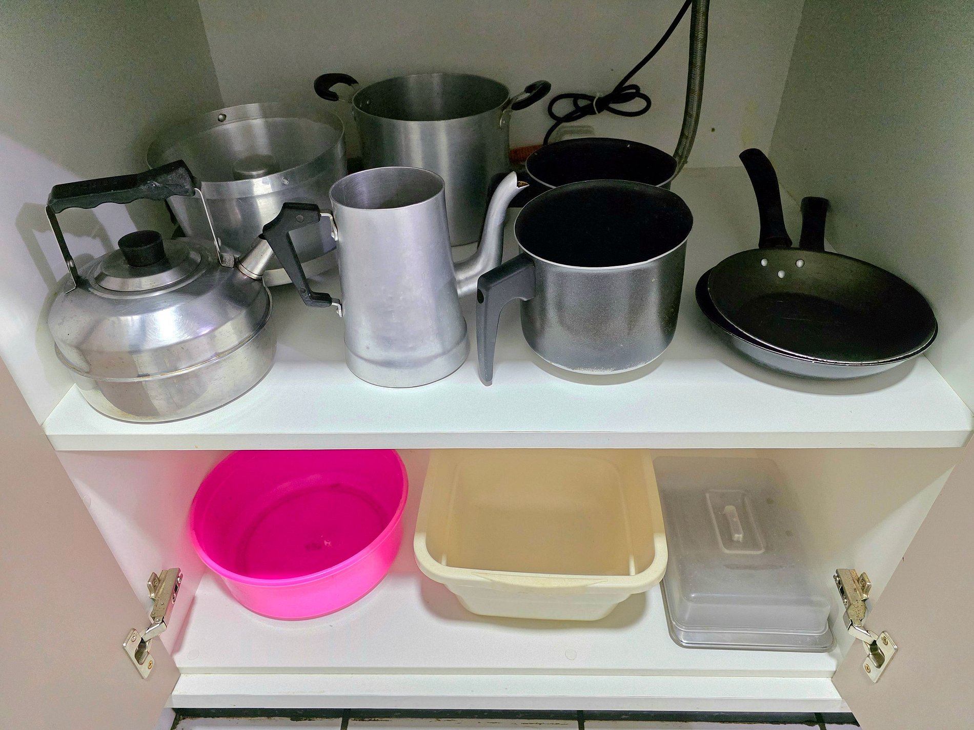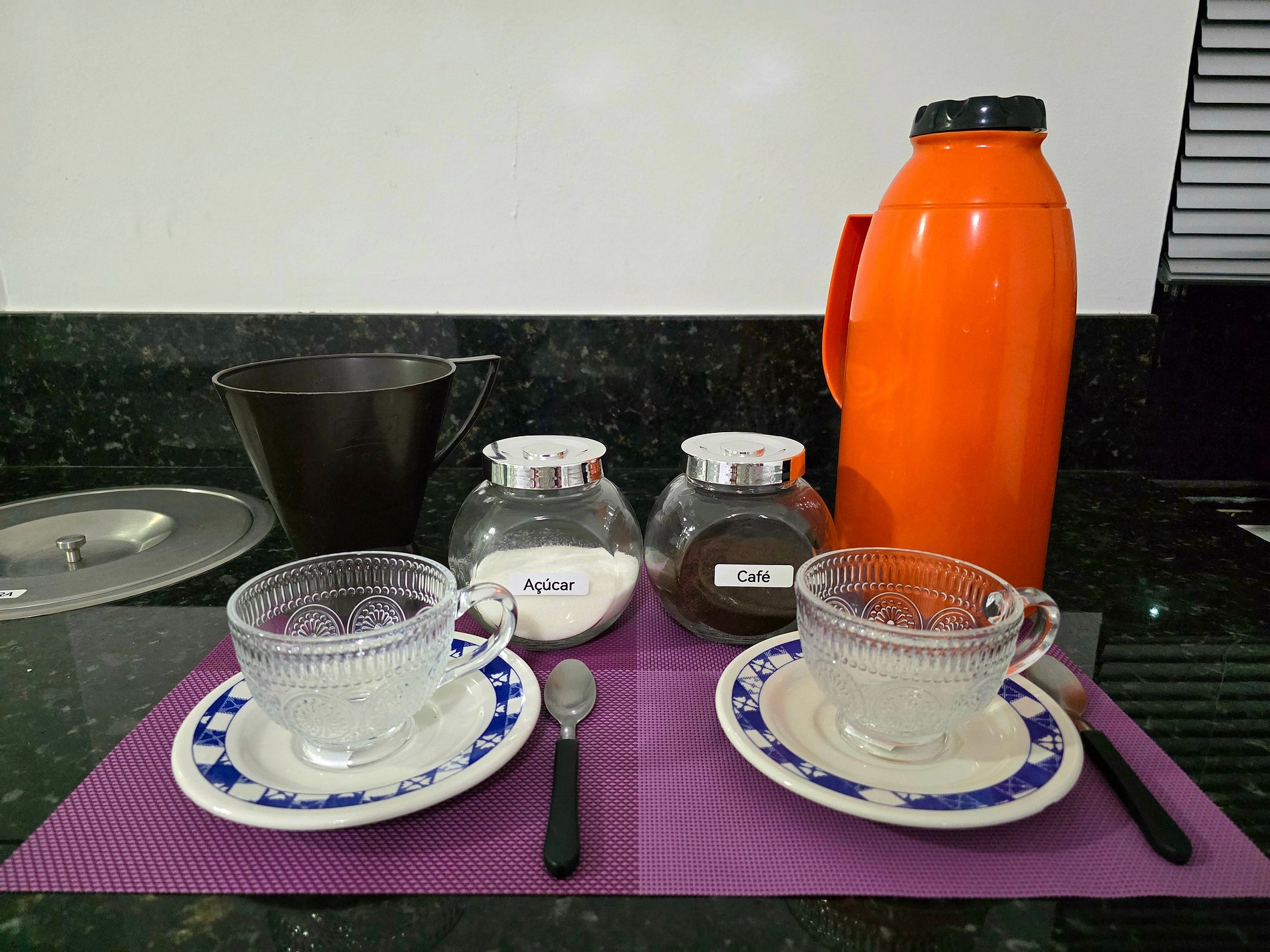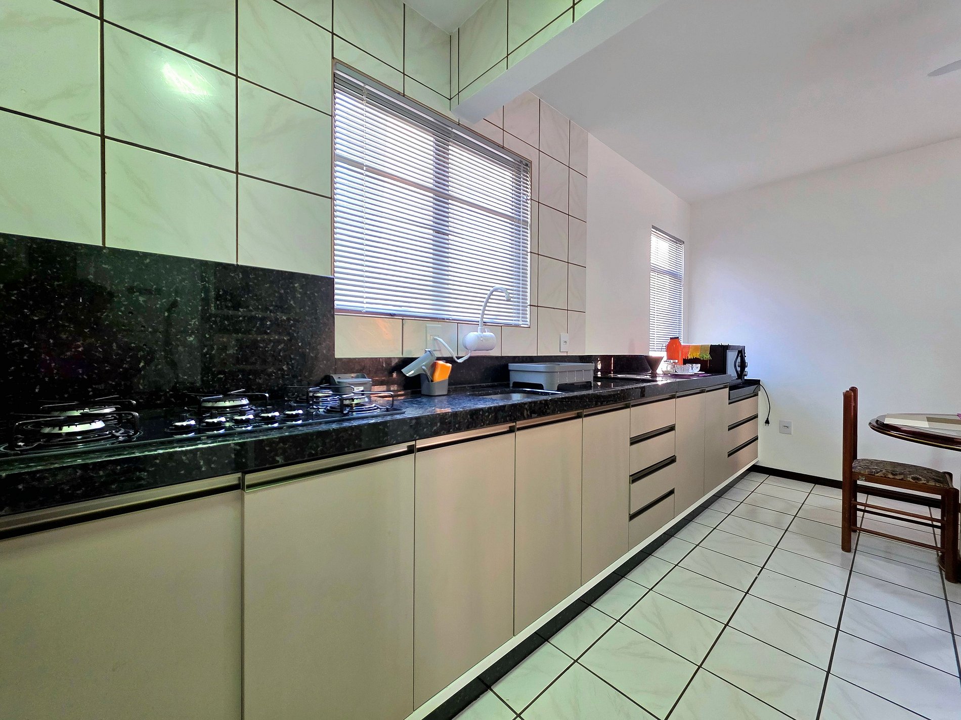 Cozinha completa com utensílios e louças para as refeições, microondas, forno, liquidificador, sanduicheira.