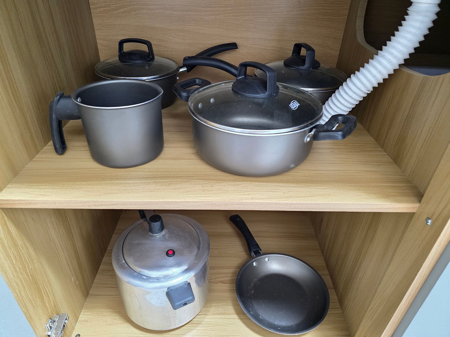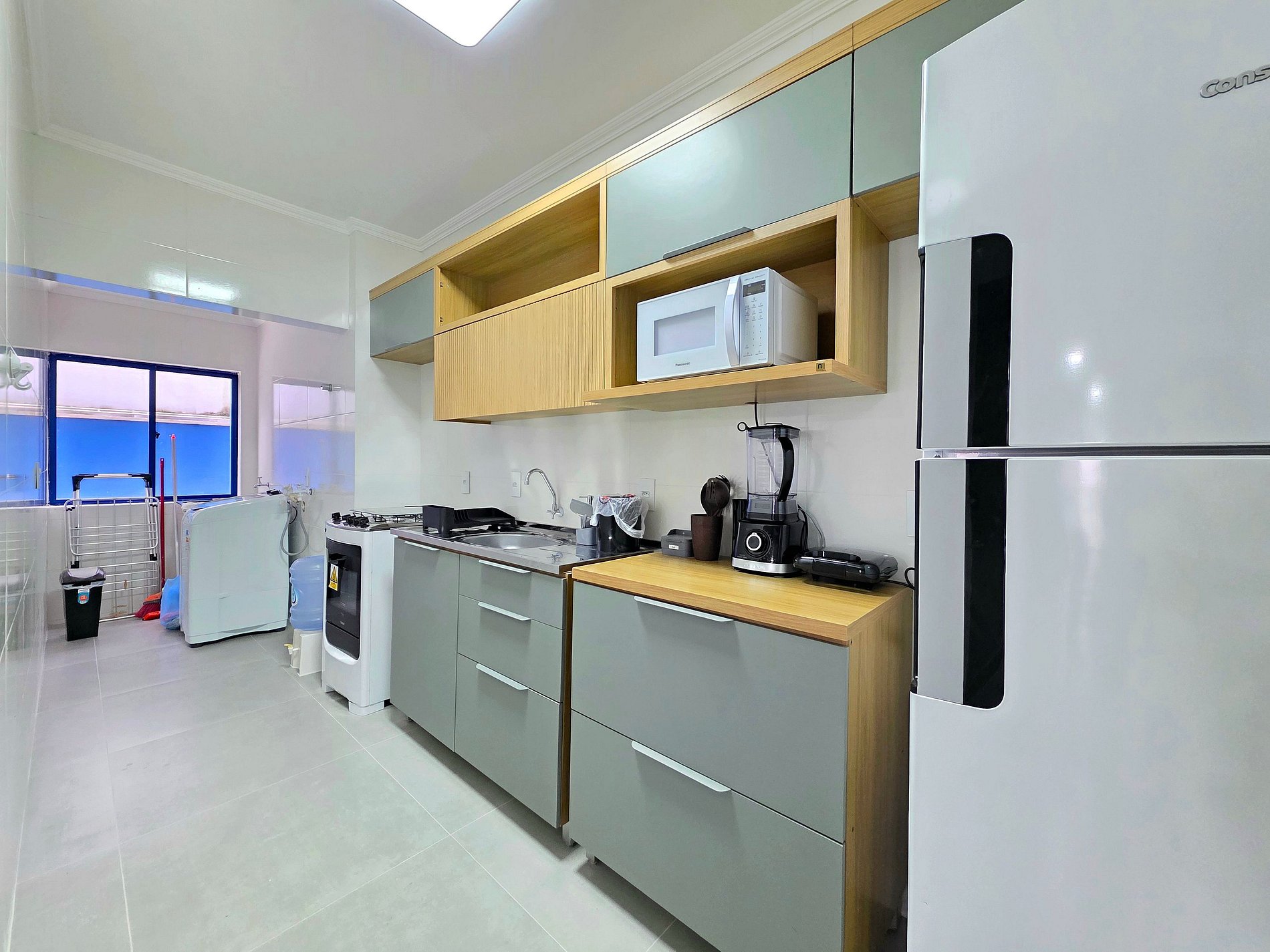 Cozinha completa com utensílios e louças para as refeições, microondas, forno, liquidificador, sanduicheira.