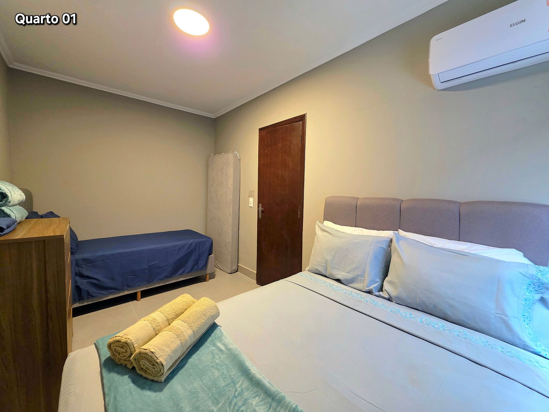 Quarto 01: 01 suíte com 01 cama de casal + 02 colchões avulso de solteiro (com banheiro e ar condicionado)