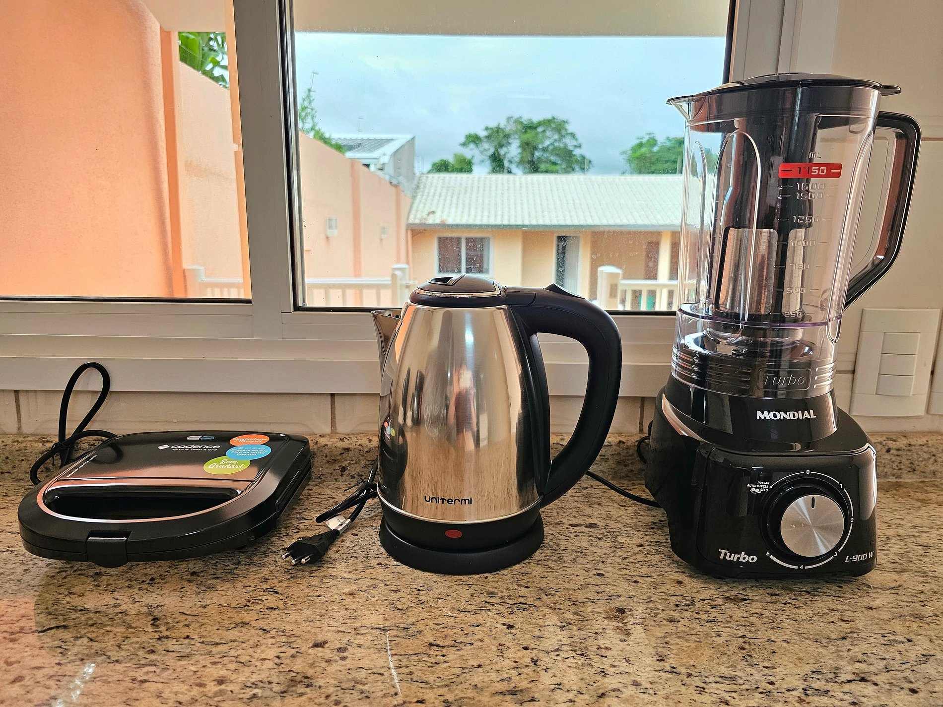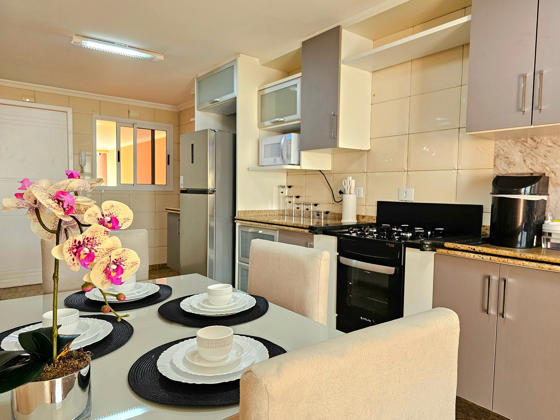 Cozinha completa com utensílios e louças para as refeições, microondas, forno, liquidificador e cafeteira elétrica.