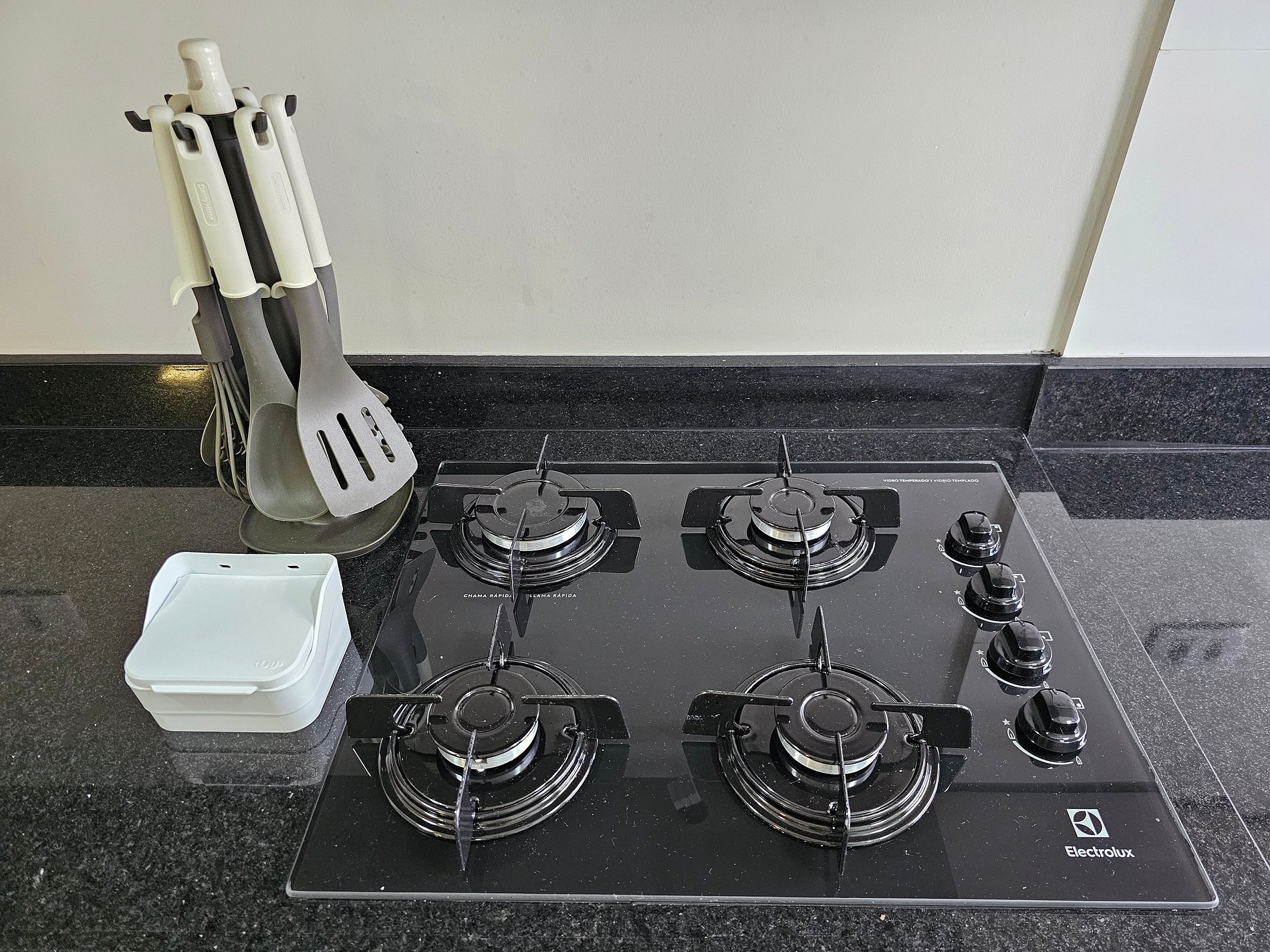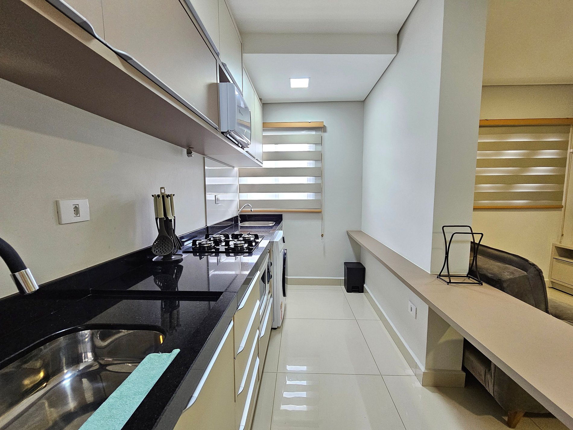 Cozinha completa com utensílios e louças para as refeições, microondas, forno, liquidificador, sanduicheira, cafeteira elétrica.