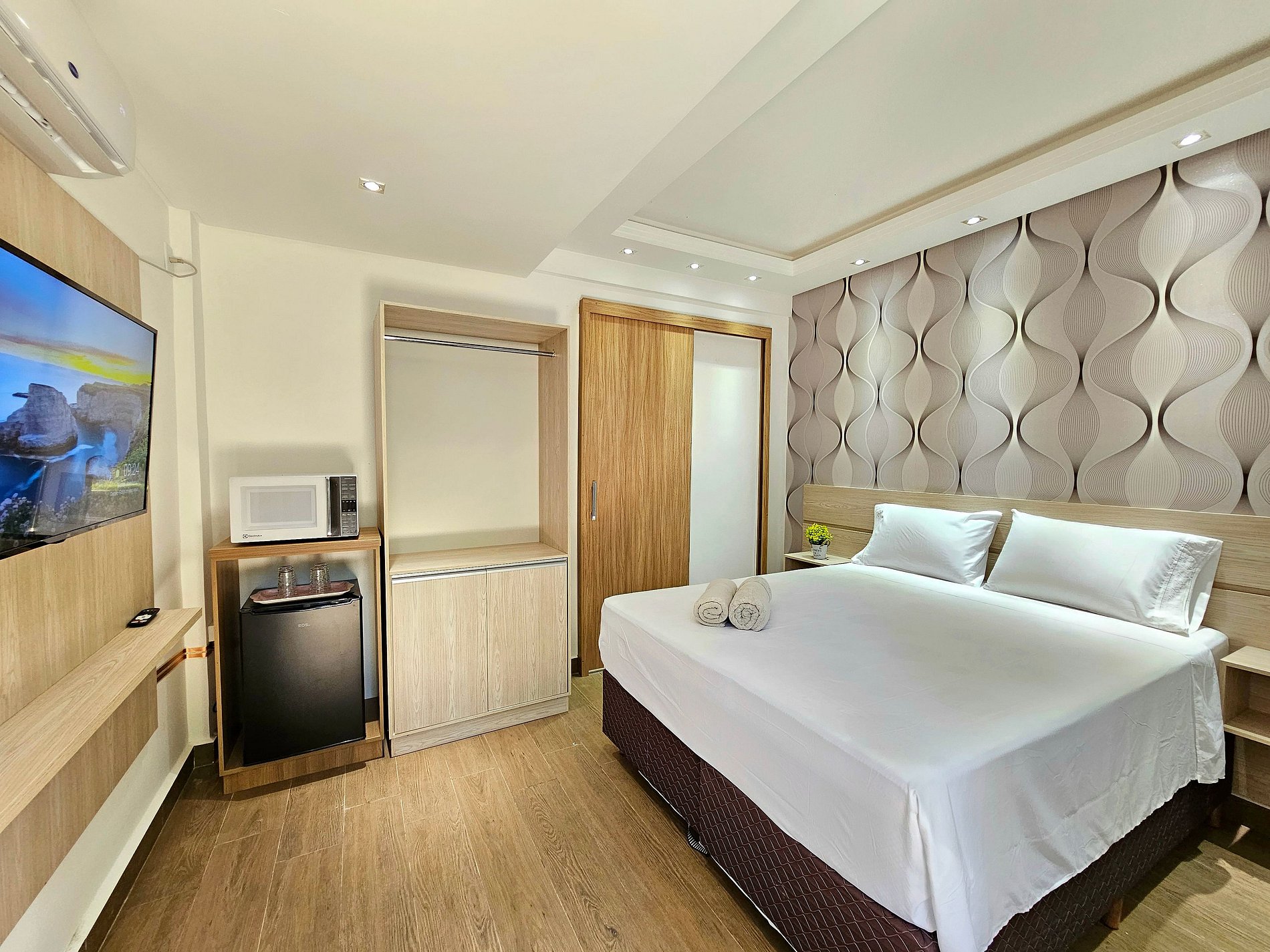 Studios novos no centro de Foz do Iguaçu, para até 4 pessoas - Cada apartamento é um espaço com 2 ambientes conectados e o banheiro privado. A poucos metros da principal avenida de restaurantes de Foz. 15 minutos dos principais atrativos como Cataratas e Paraguai. Seu PET é muito bem-vindo. Incluso roupa de cama e toalhas de banho. Ambiente climatizado com SmartTV, microondas e frigobar. Incluso WIFI e garagem. Somos anfitriões comprometidos para que você tenha uma excelente estadia.