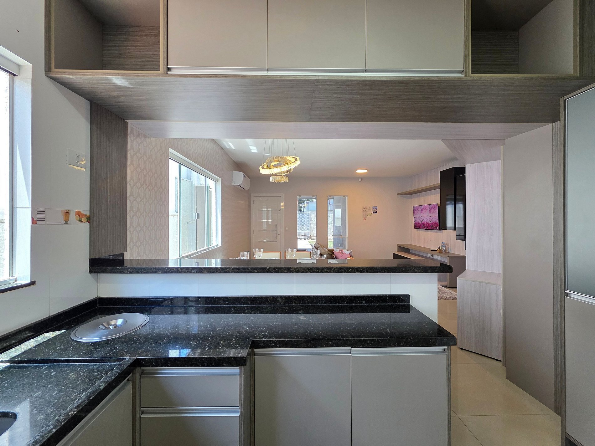 Sala com smart TV e ar condicionado.