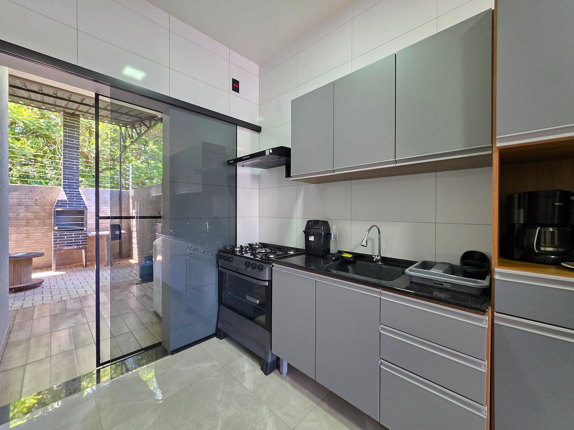 Cozinha completa com utensílios e louças para as refeições, microondas, liquidificador, sanduicheira e cafeteira elétrica.