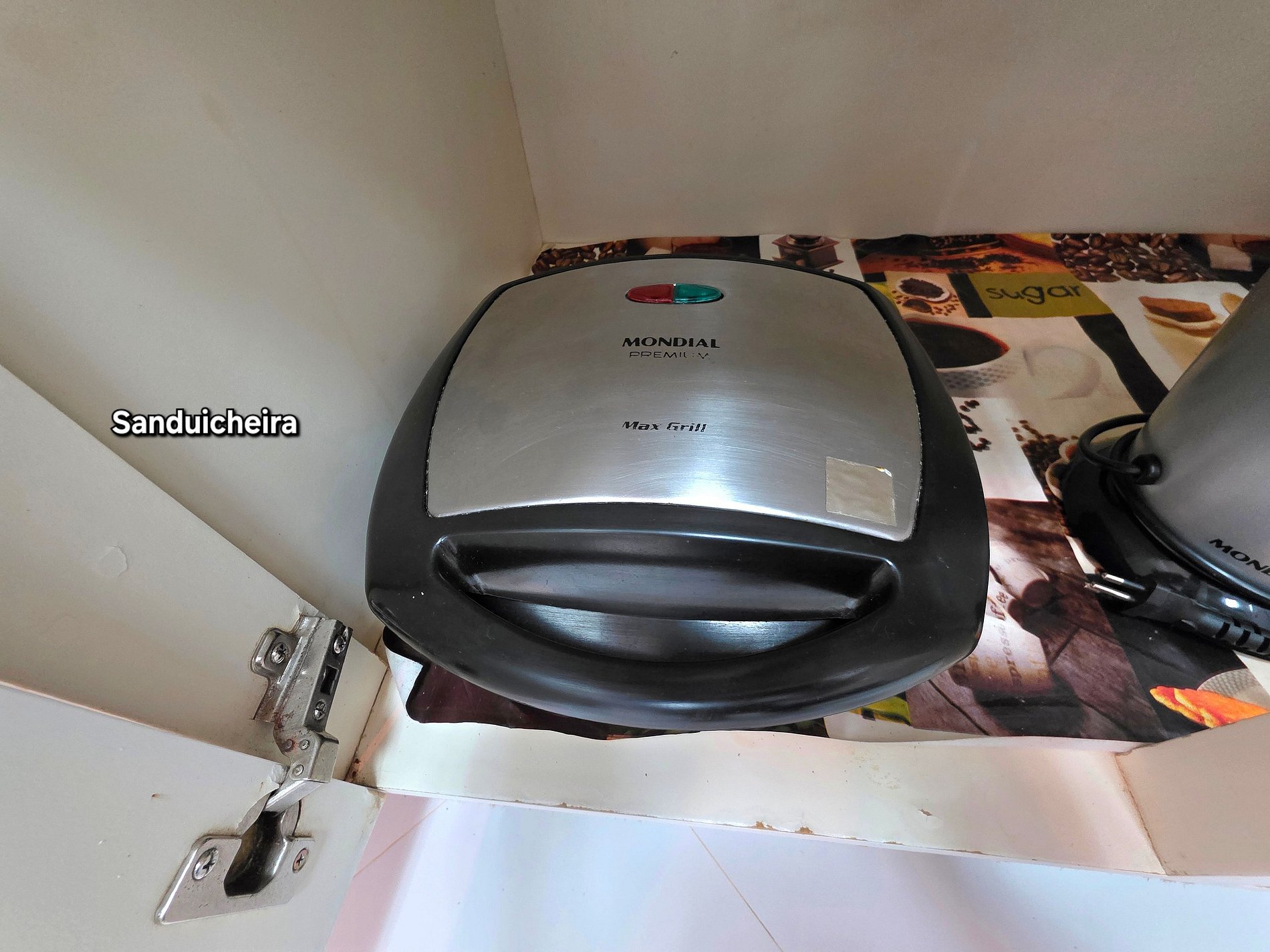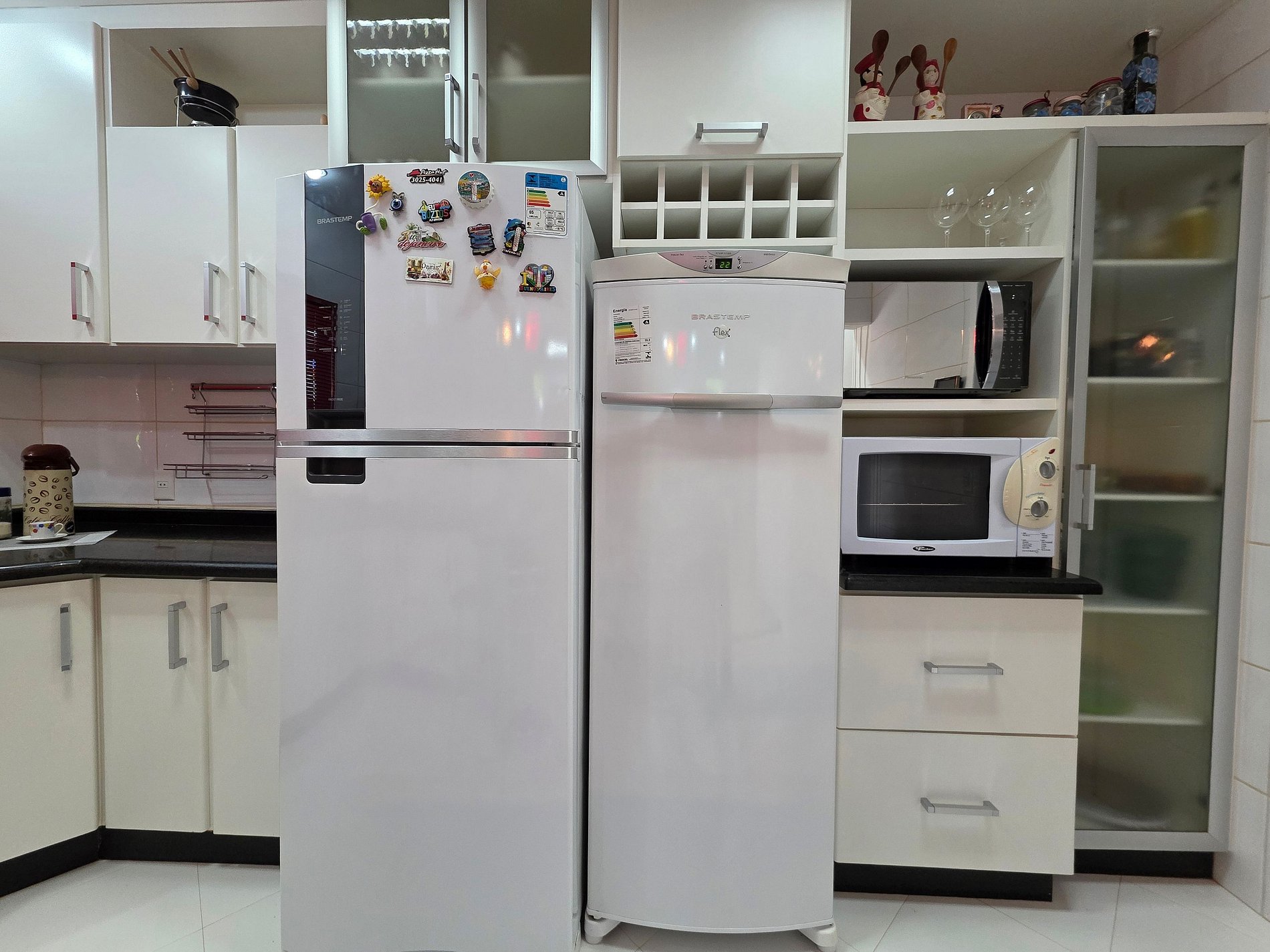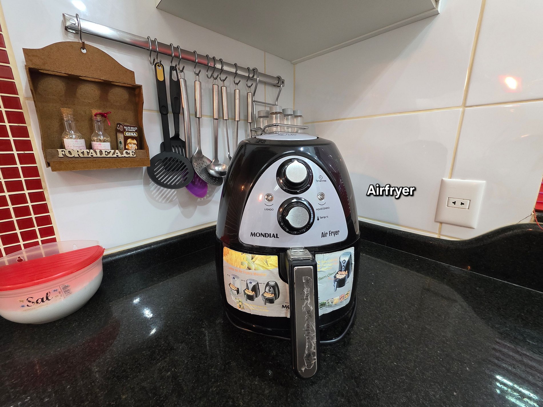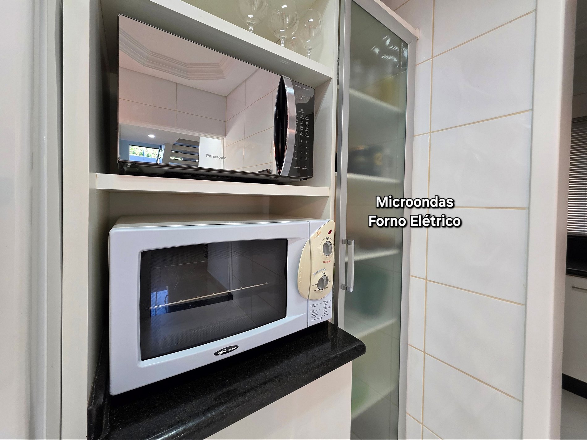 Cozinha completa com utensílios e louças para as refeições, microondas, forno, liquidificador, airfryer.