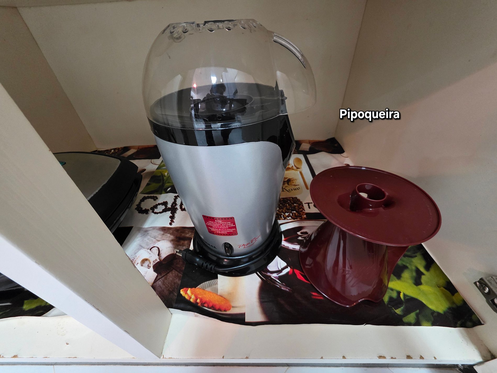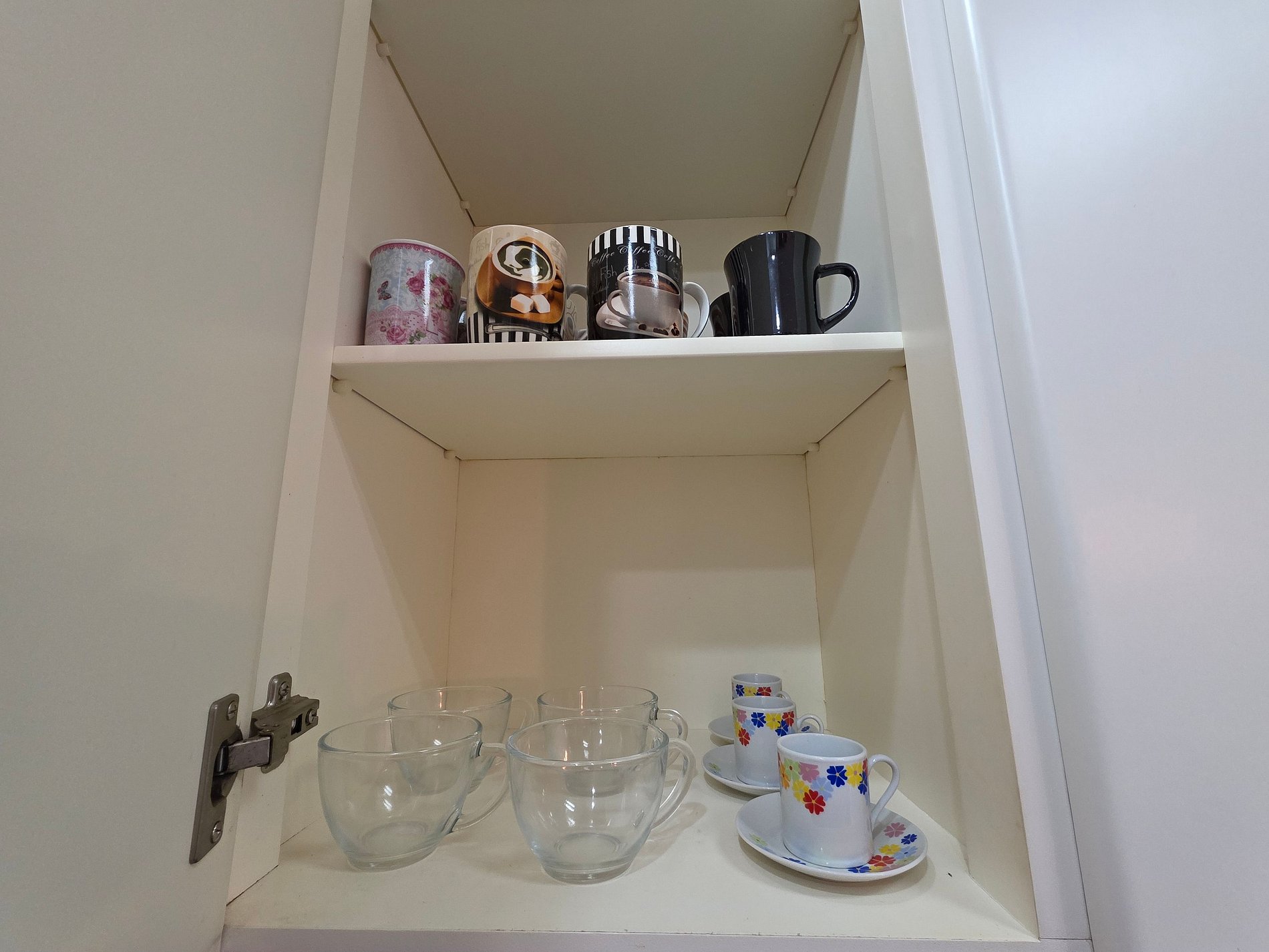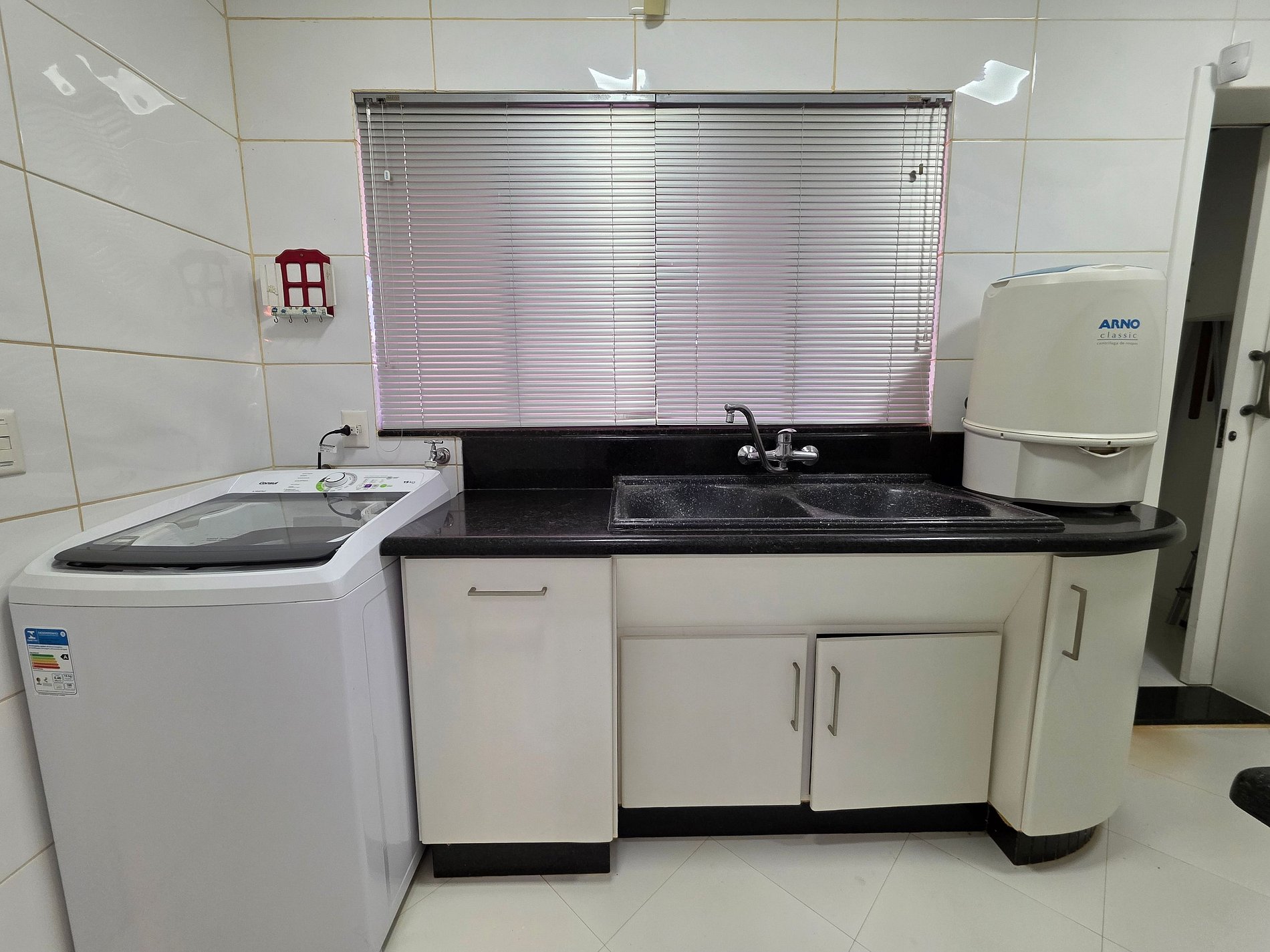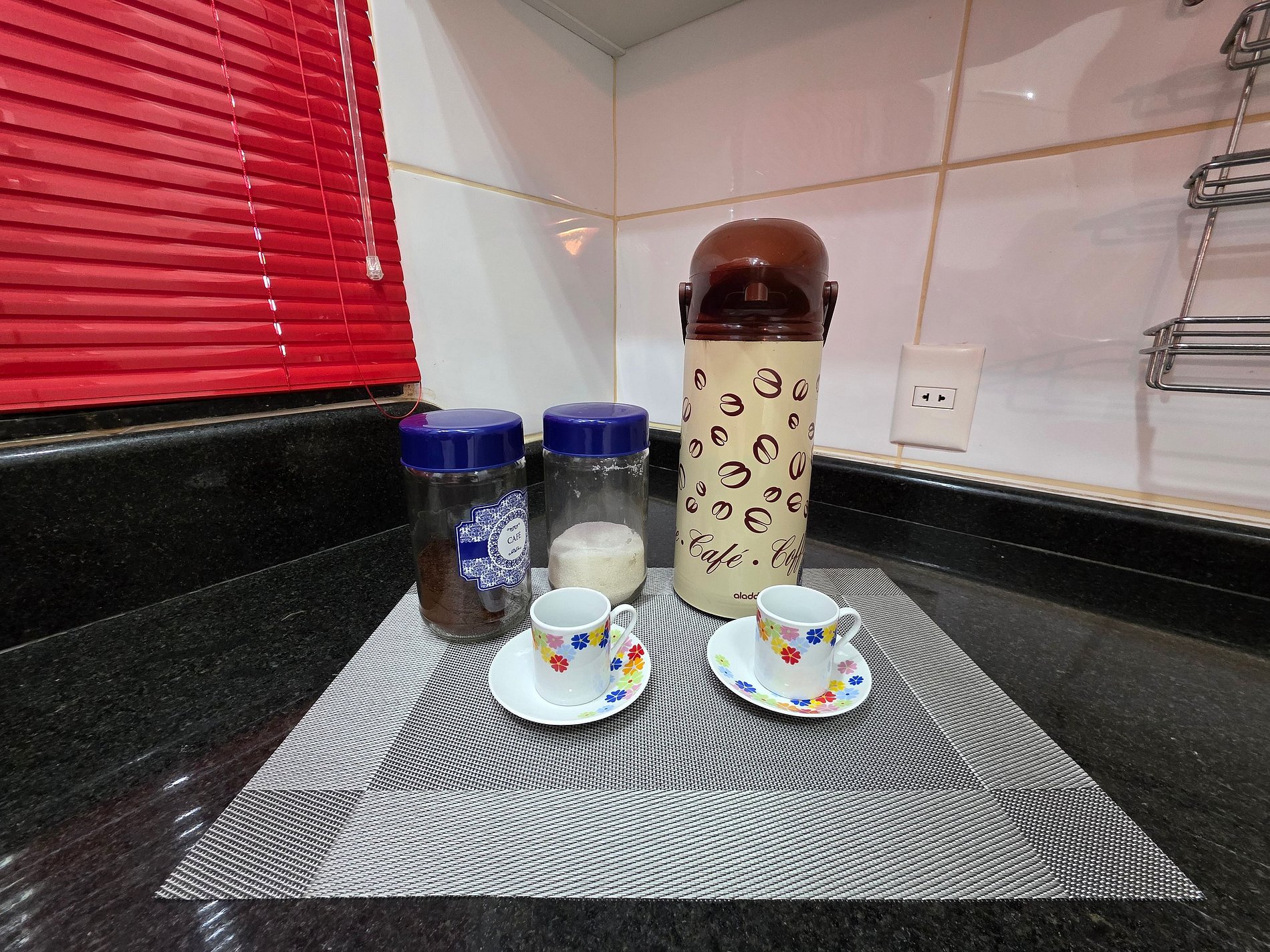 Cozinha completa com utensílios e louças para as refeições, microondas, forno, liquidificador, airfryer.