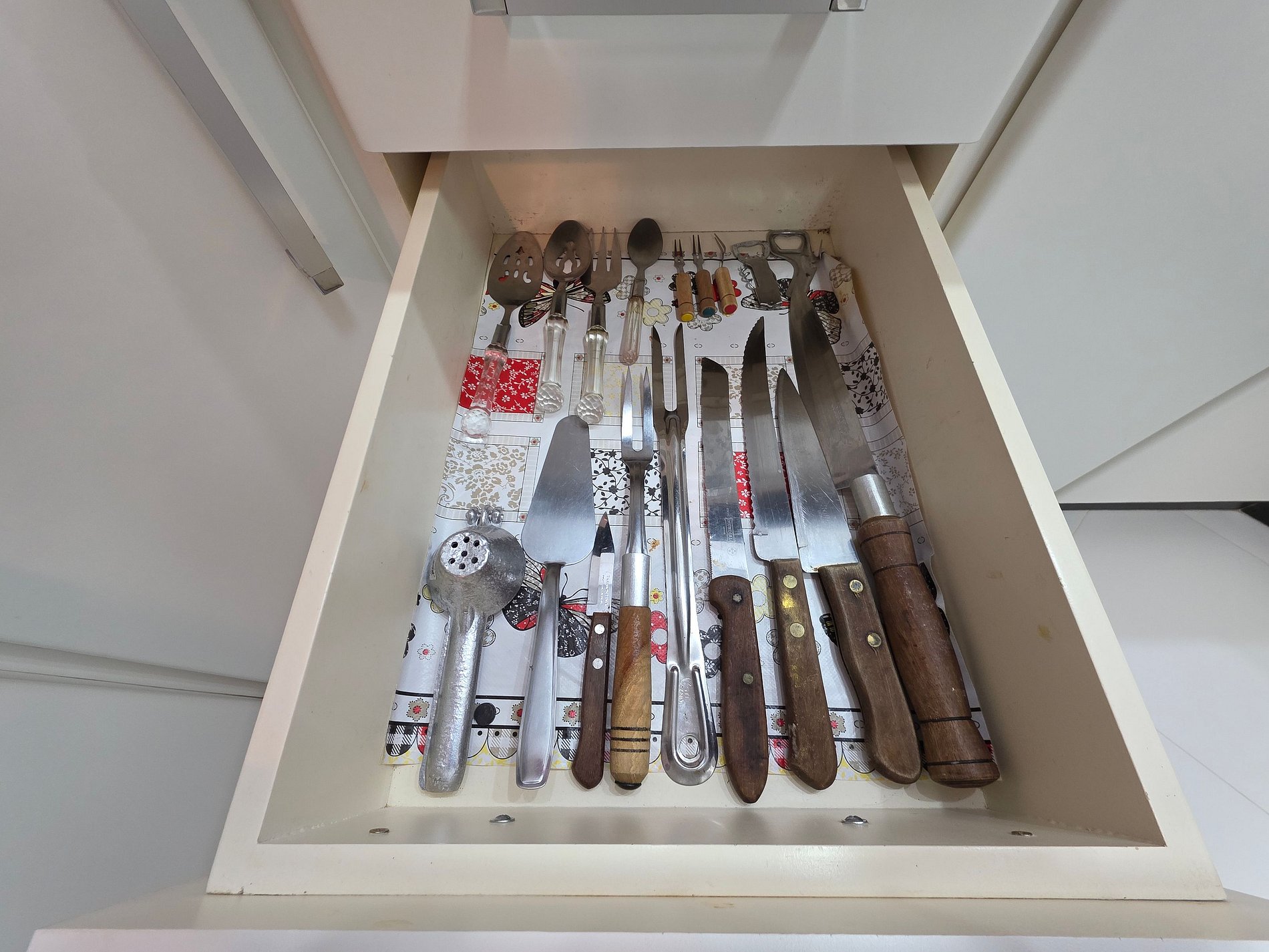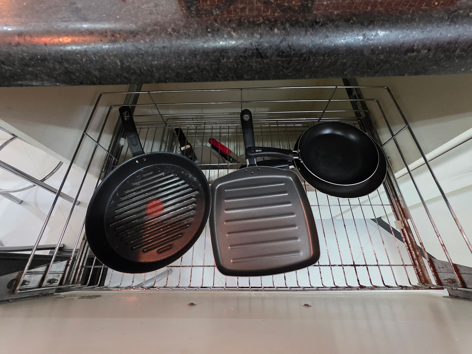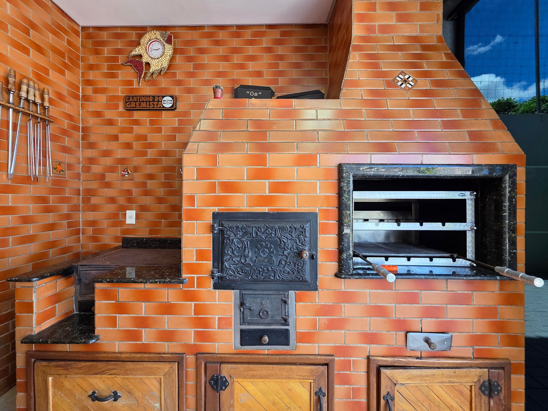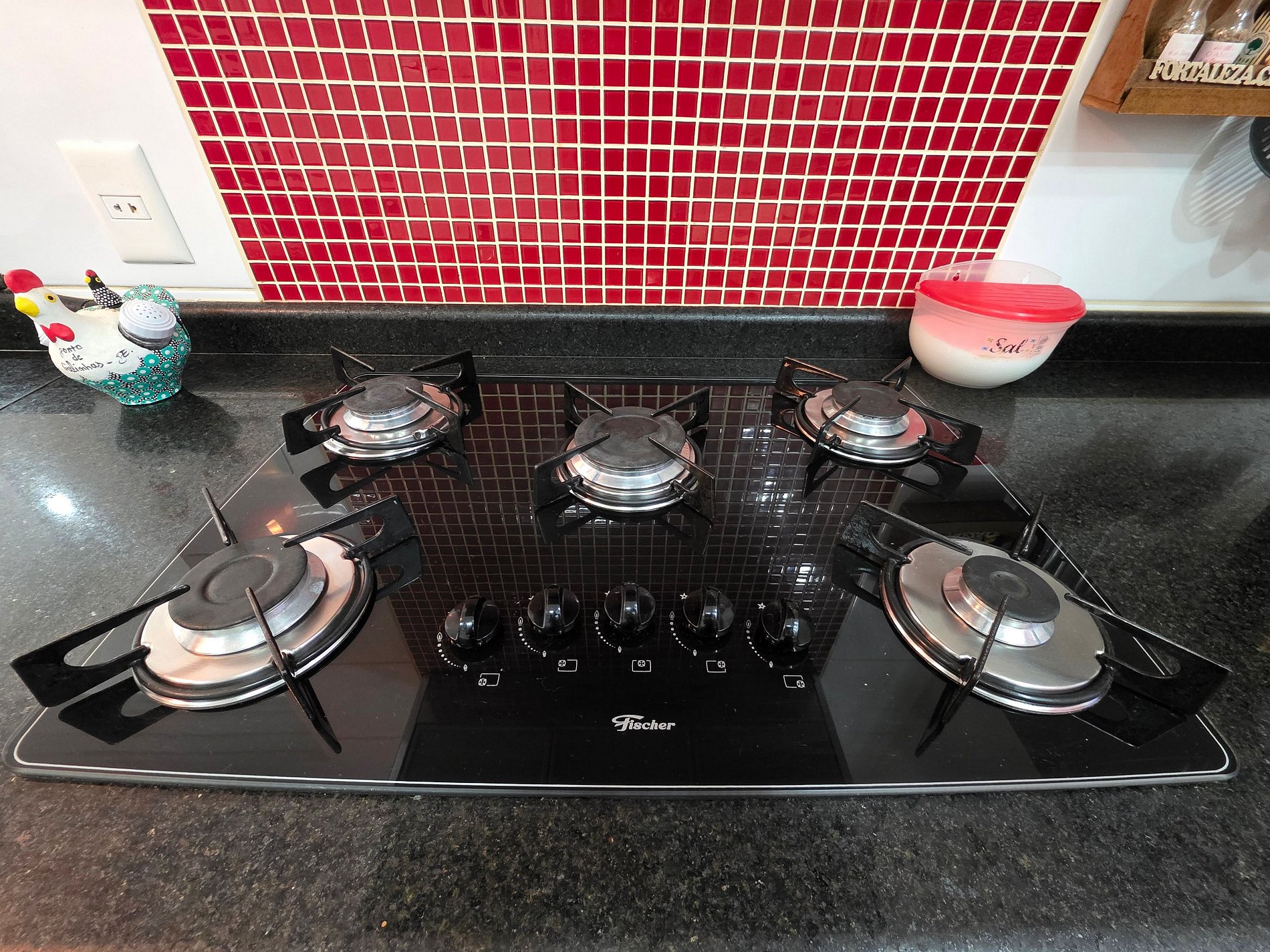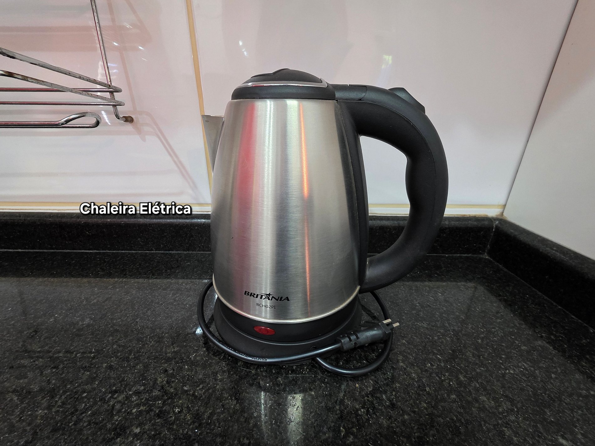 Cozinha completa com utensílios e louças para as refeições, microondas, forno, liquidificador, airfryer.