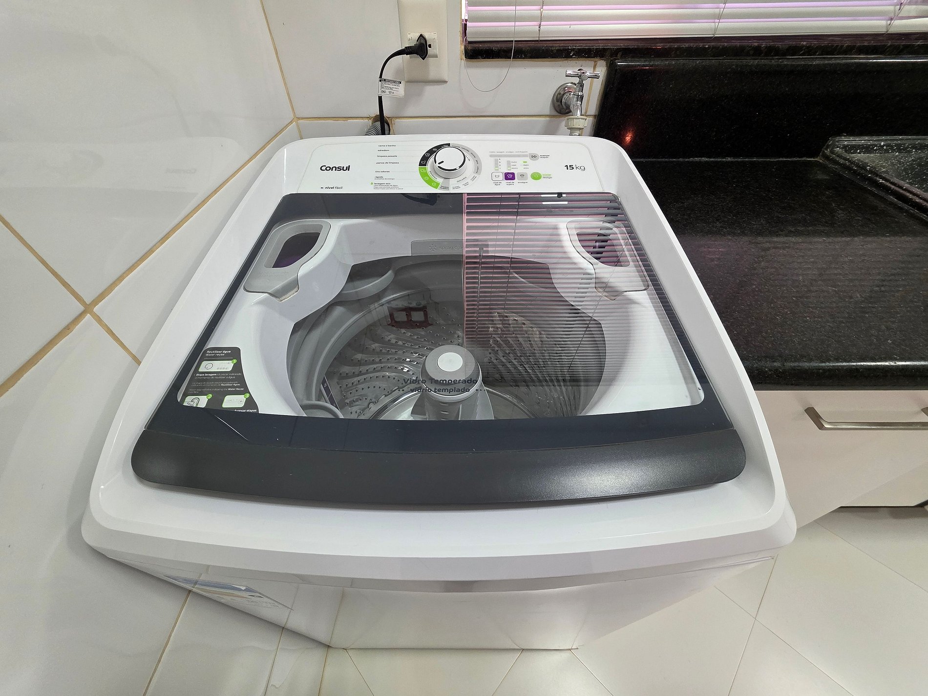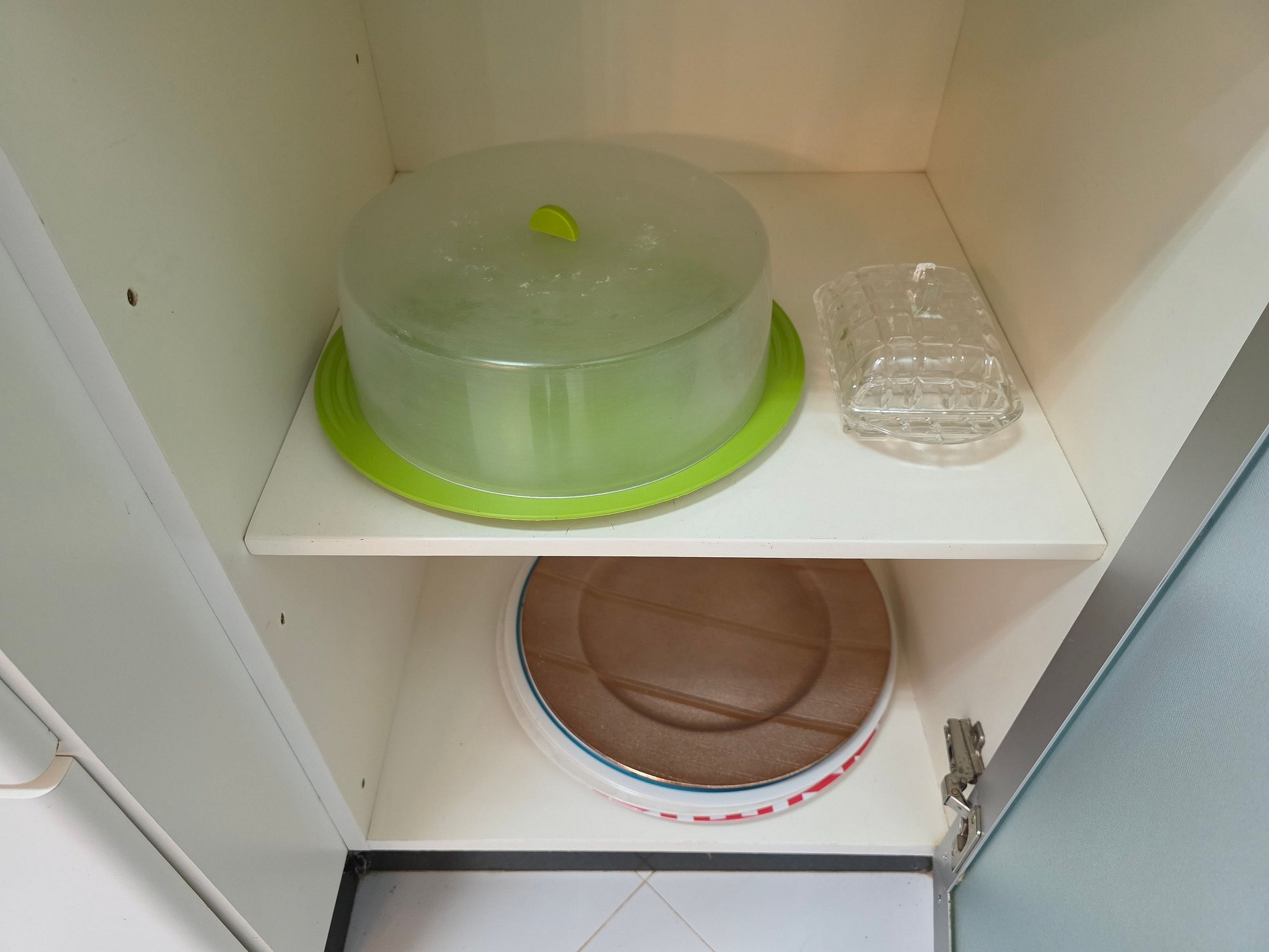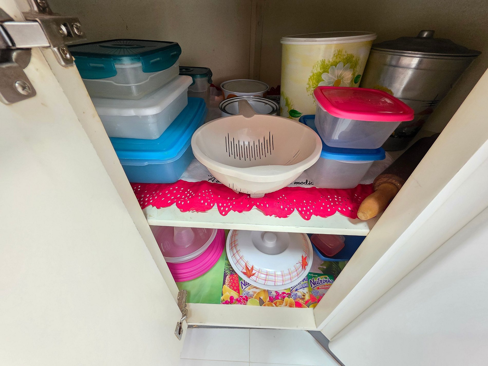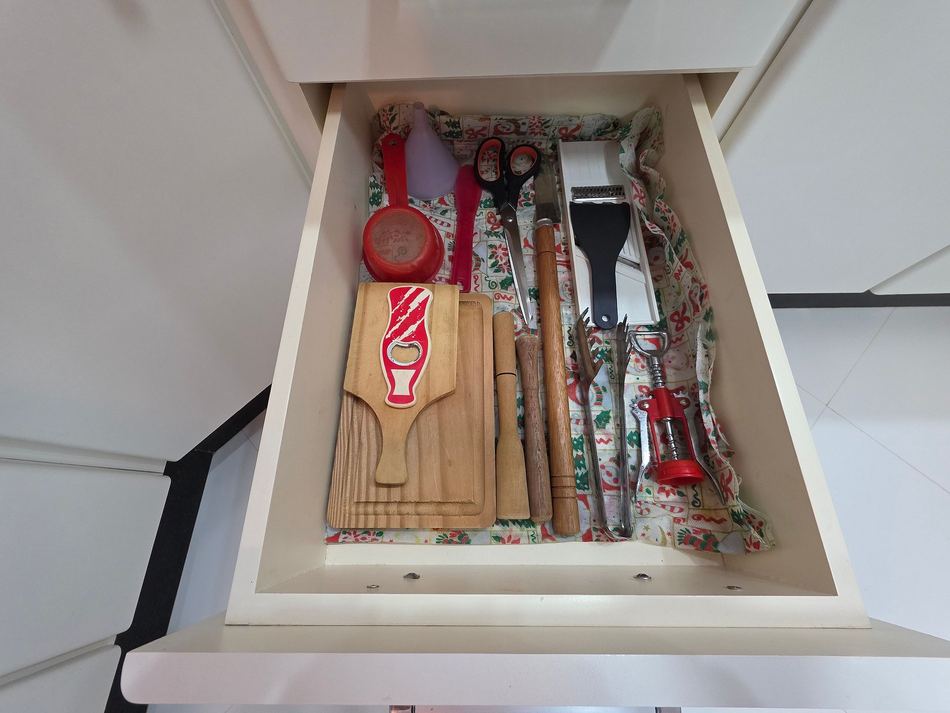 Cozinha completa com utensílios e louças para as refeições, microondas, forno, liquidificador, airfryer.