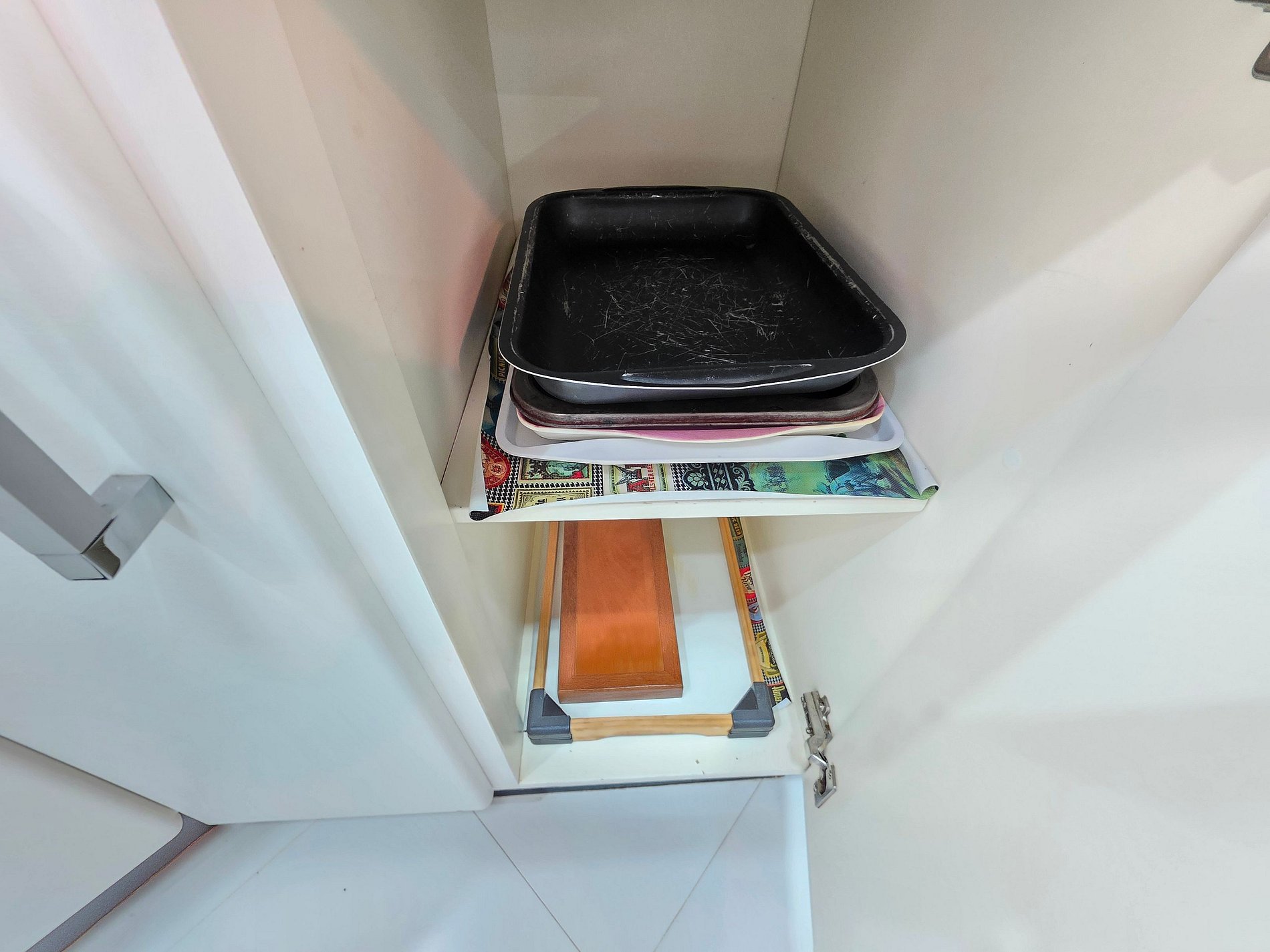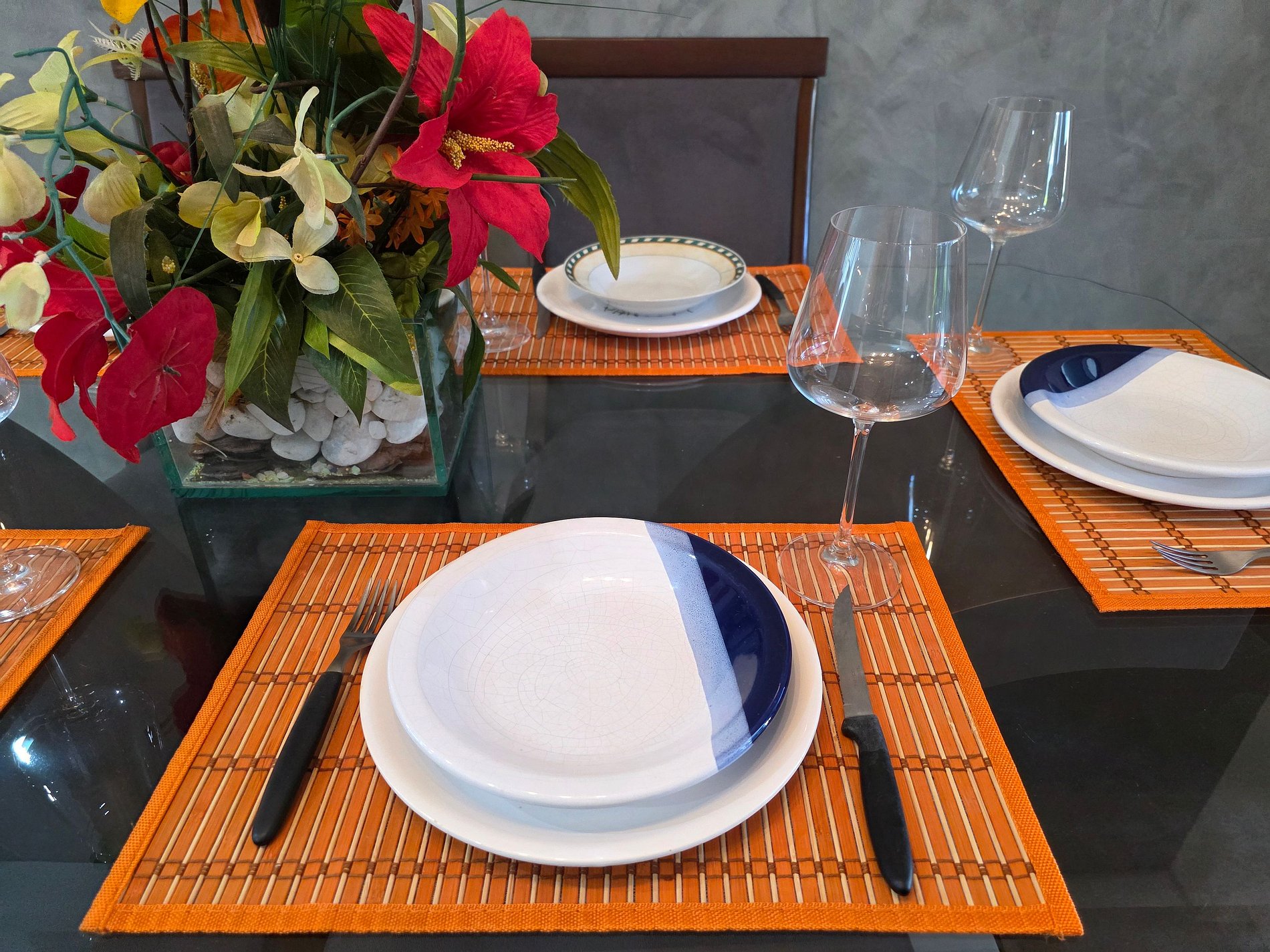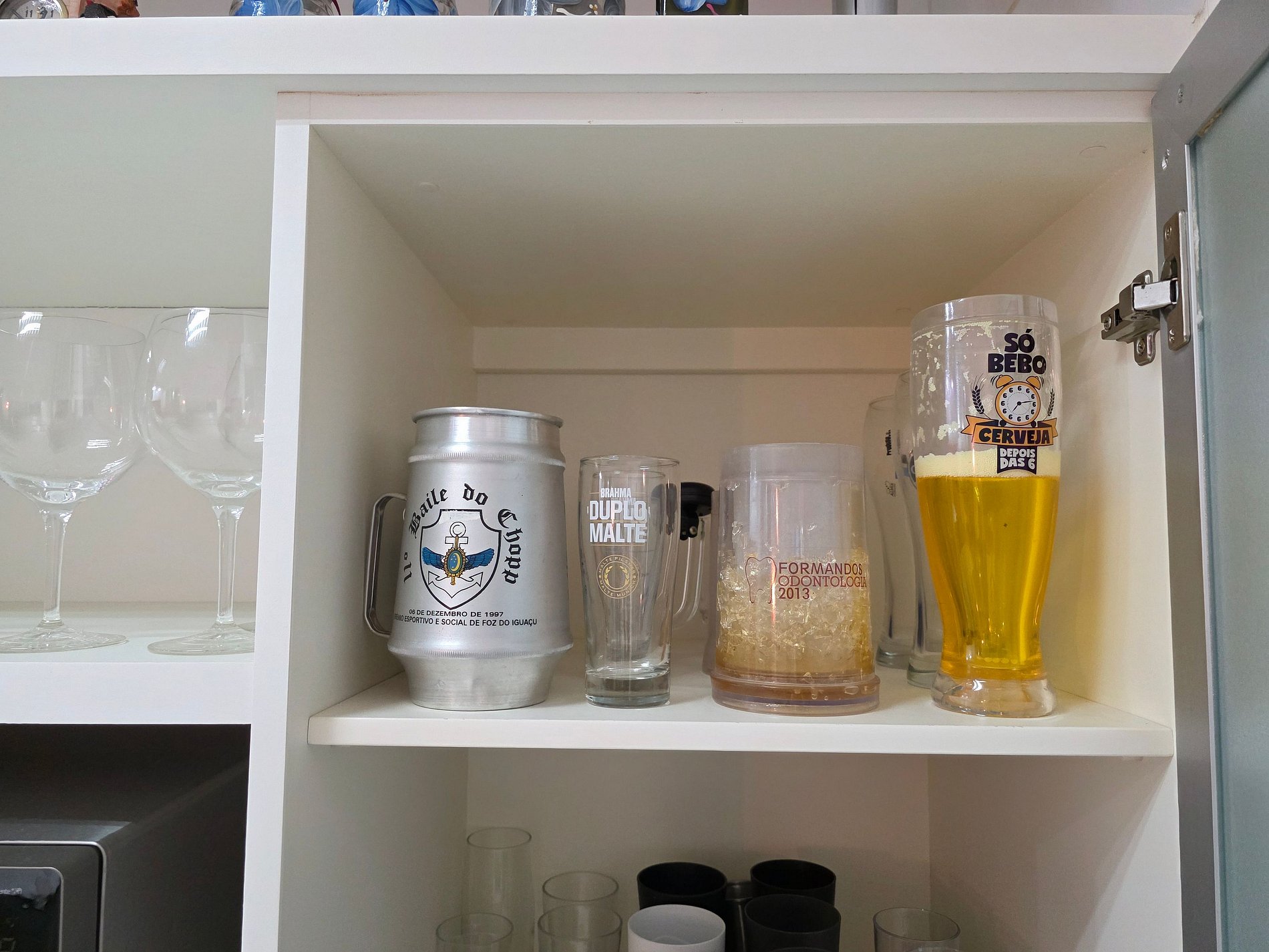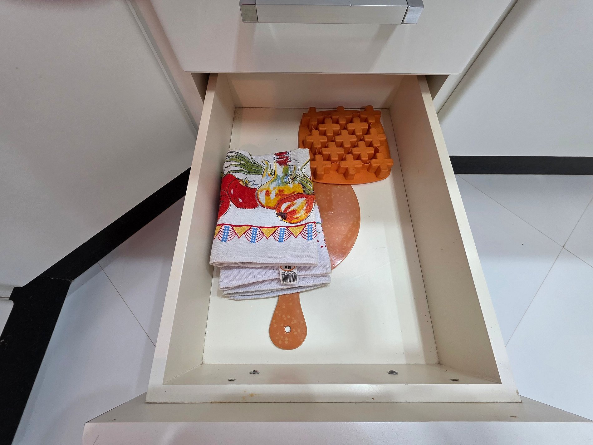 Cozinha completa com utensílios e louças para as refeições, microondas, forno, liquidificador, airfryer.
