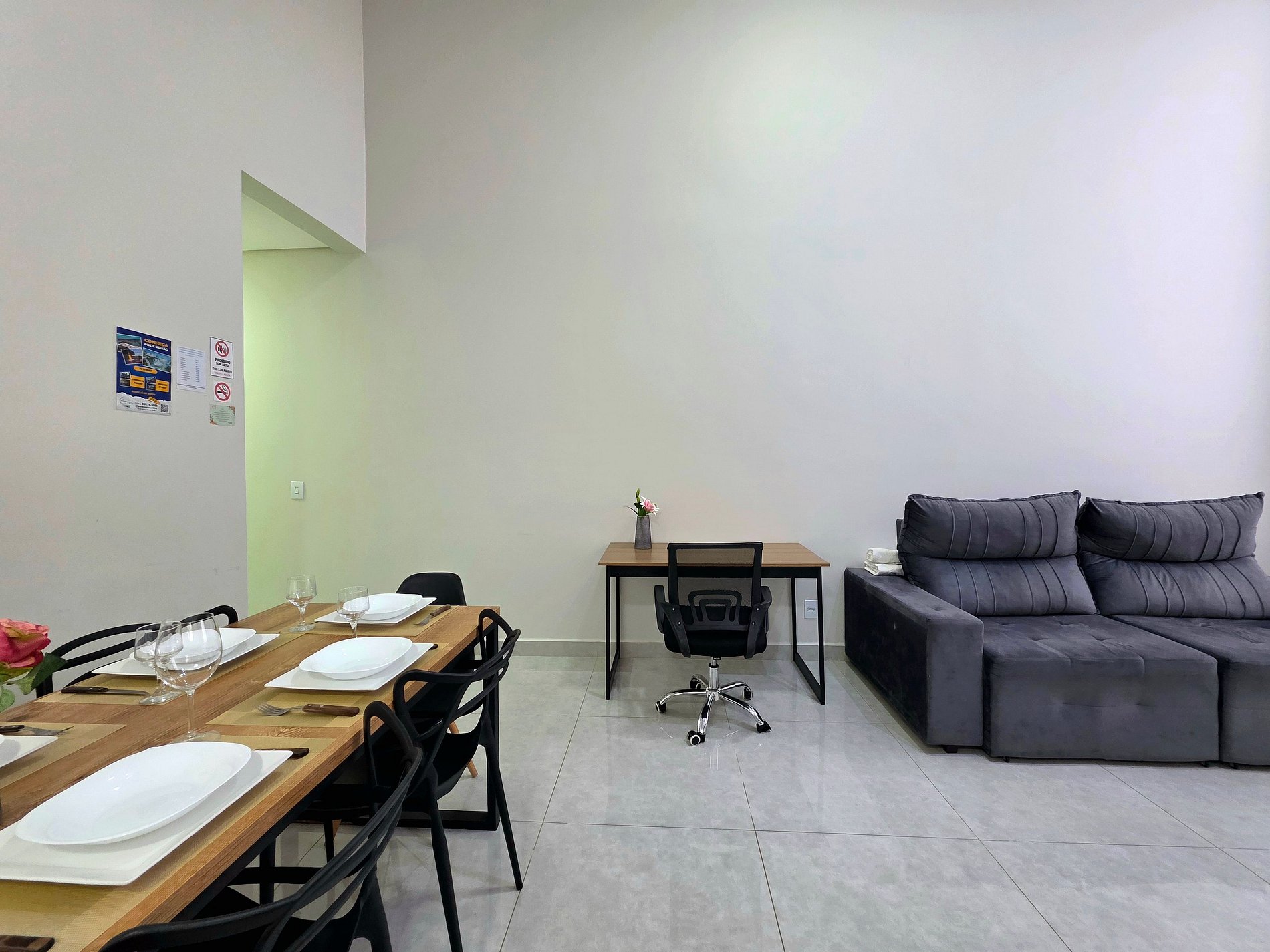 Sala de estar com o sofá cama e smartTV (sofá cama quando 8 hospedes, deixamos a roupa de cama e travesseiros)