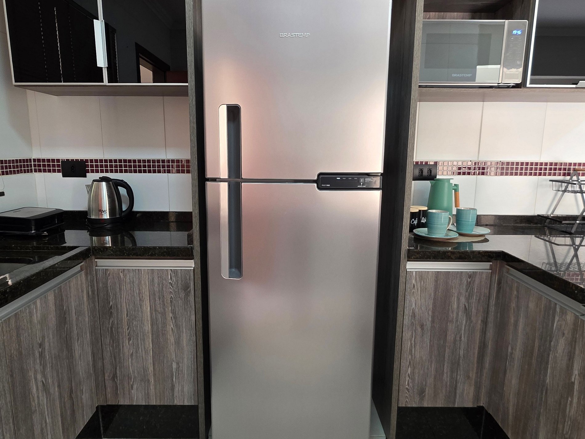 Cozinha completa com utensílios e louças para as refeições, fogão, microondas, sanduicheira, liquidificador.