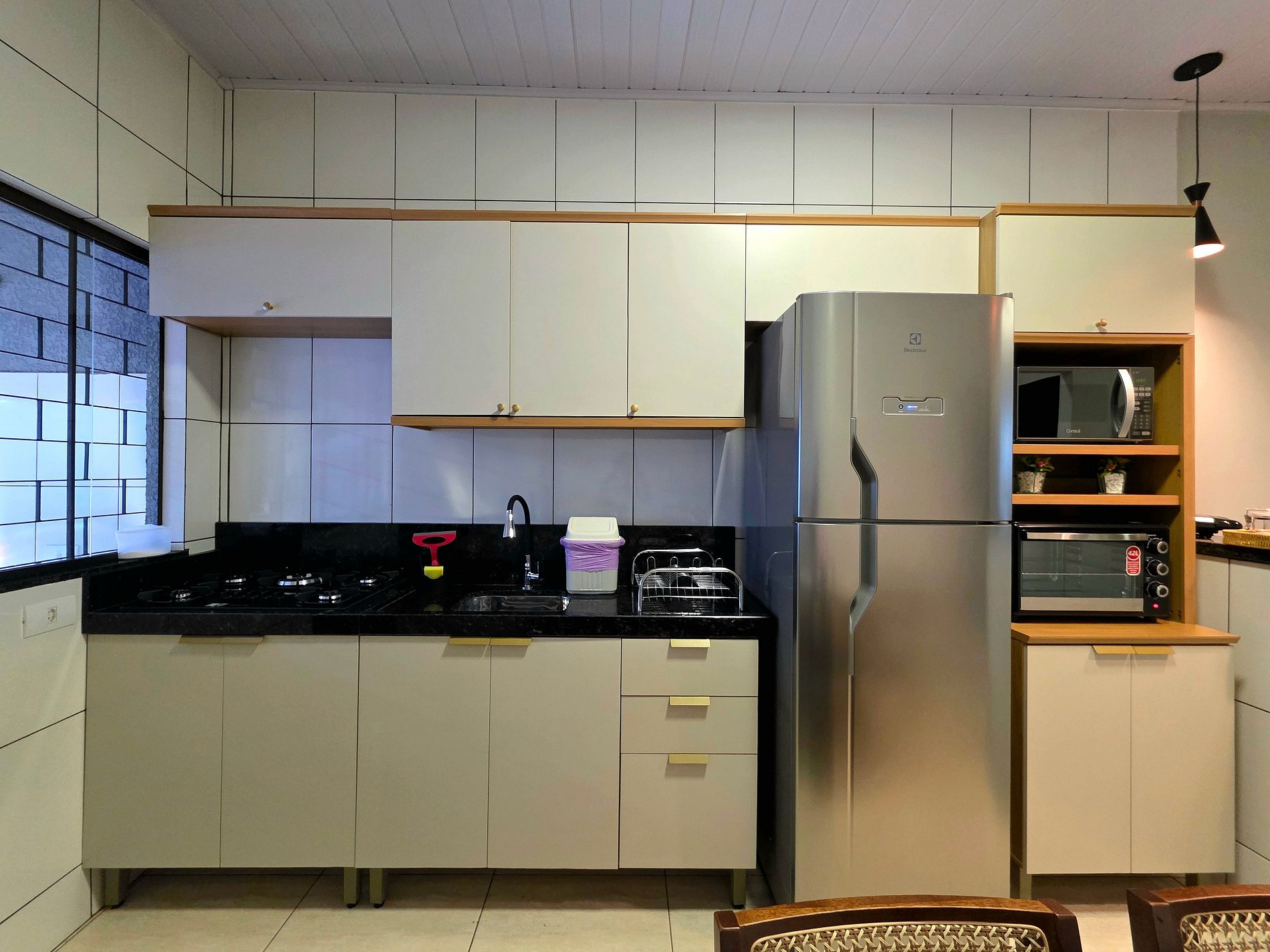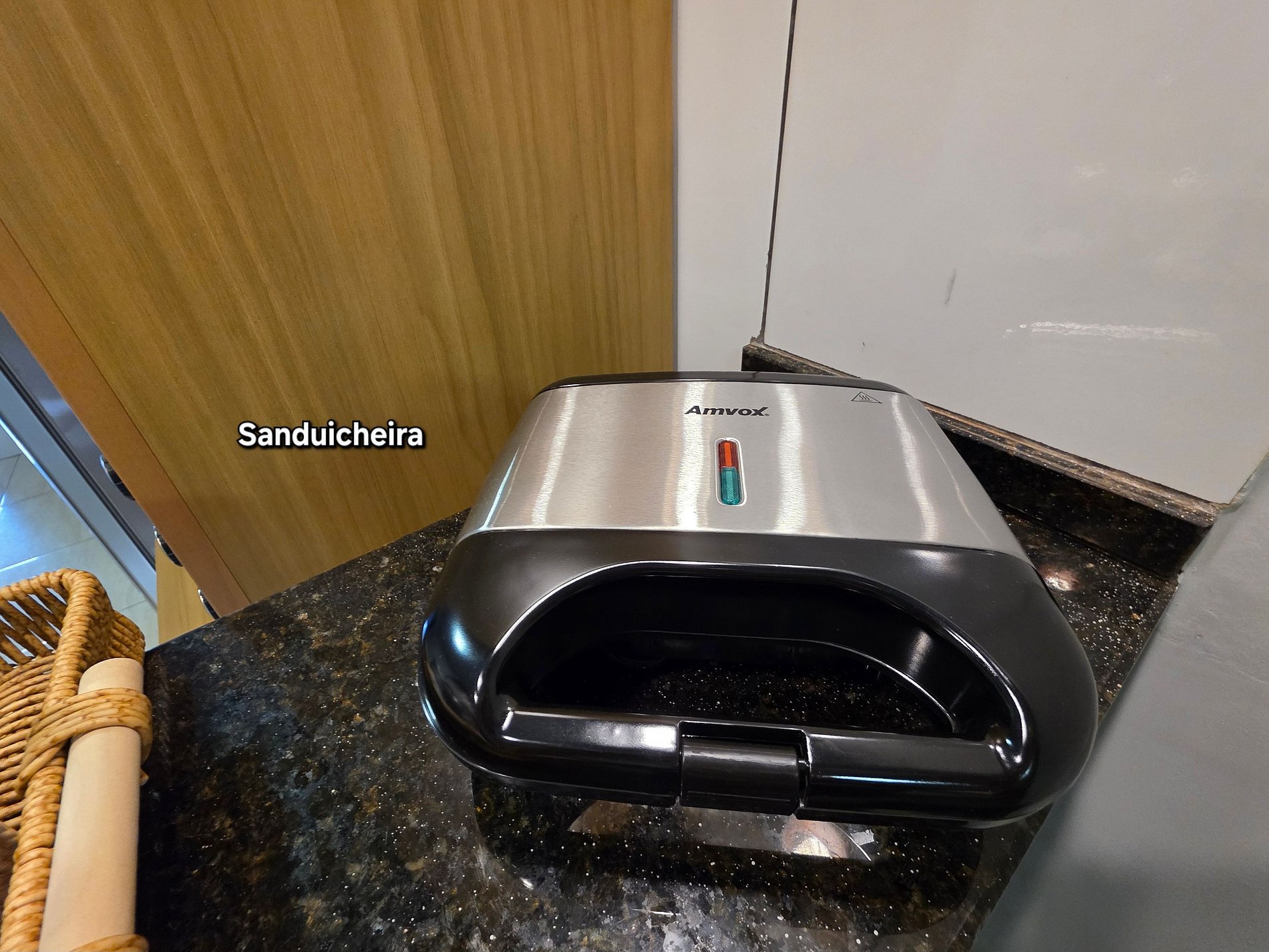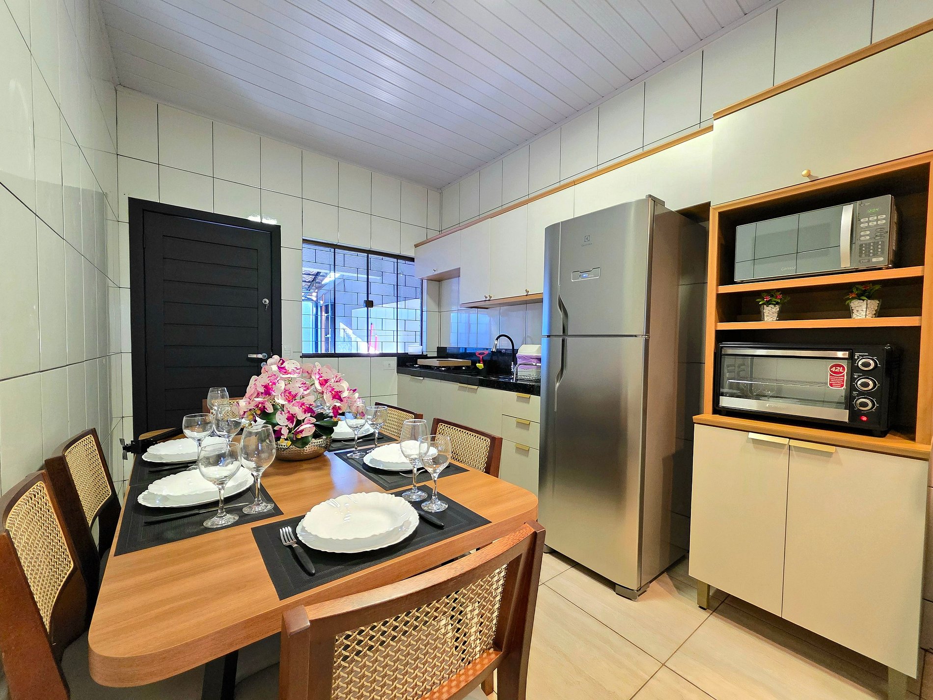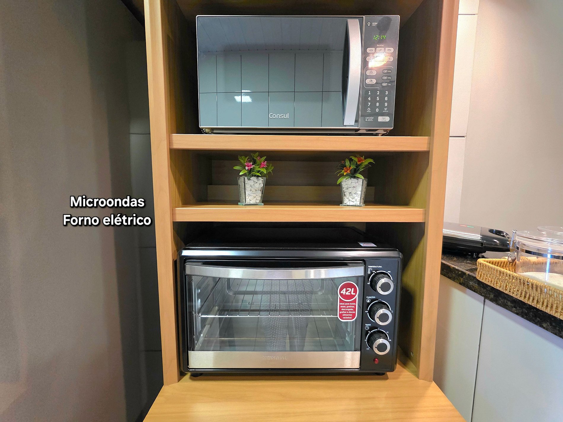 Cozinha completa com utensílios e louças para as refeições, microondas, forno, liquidificador e sanduicheira.