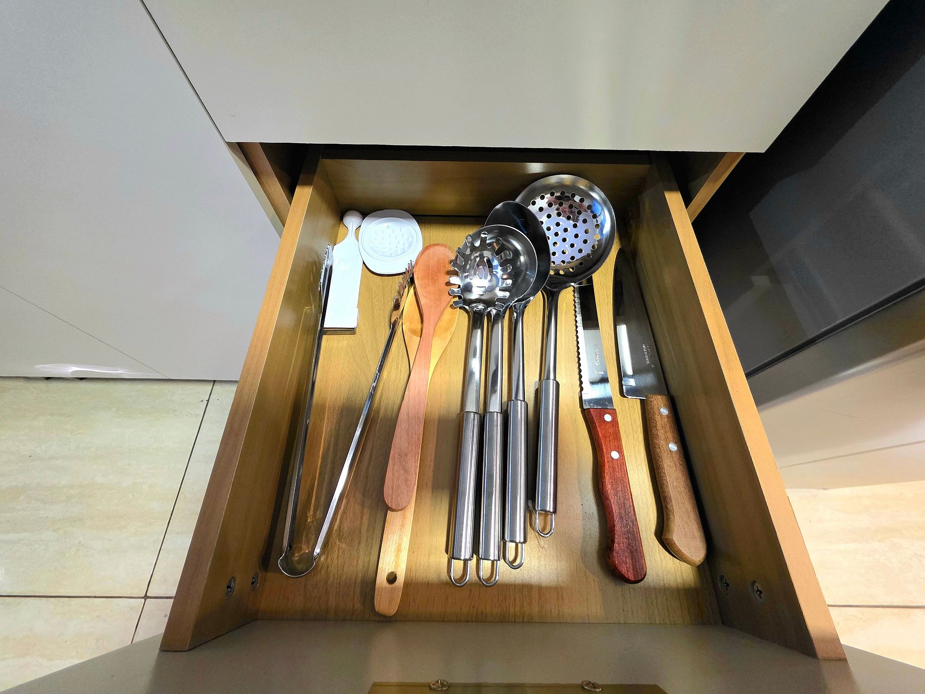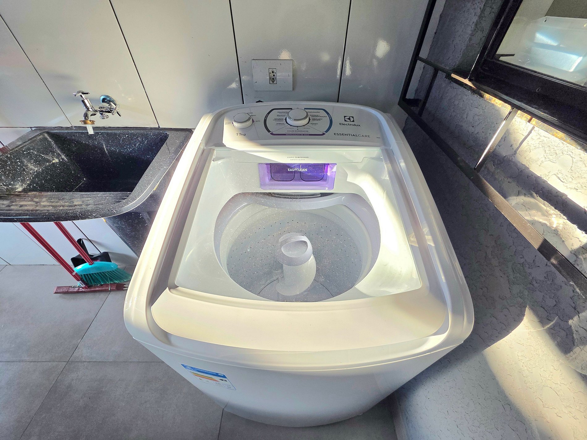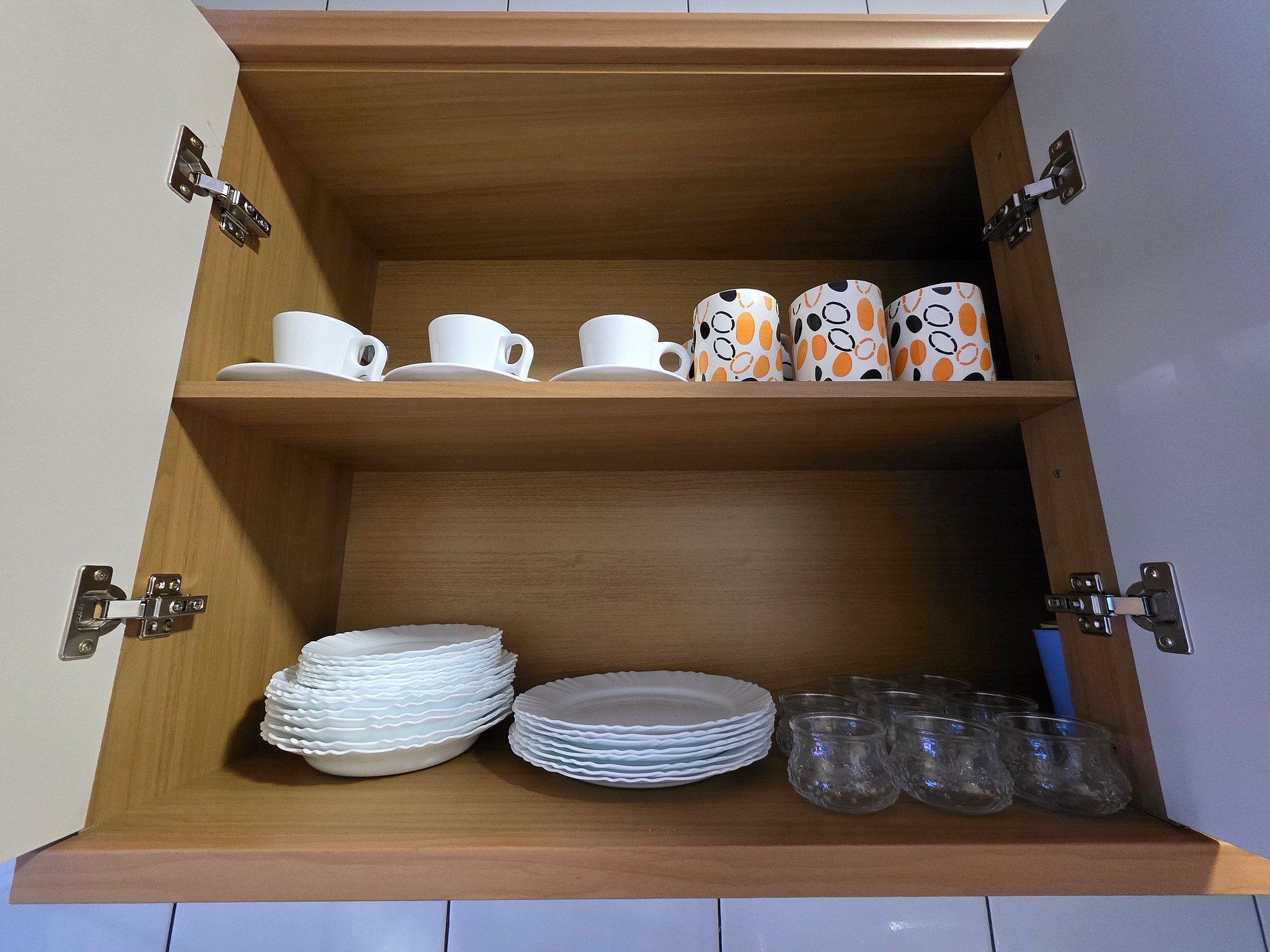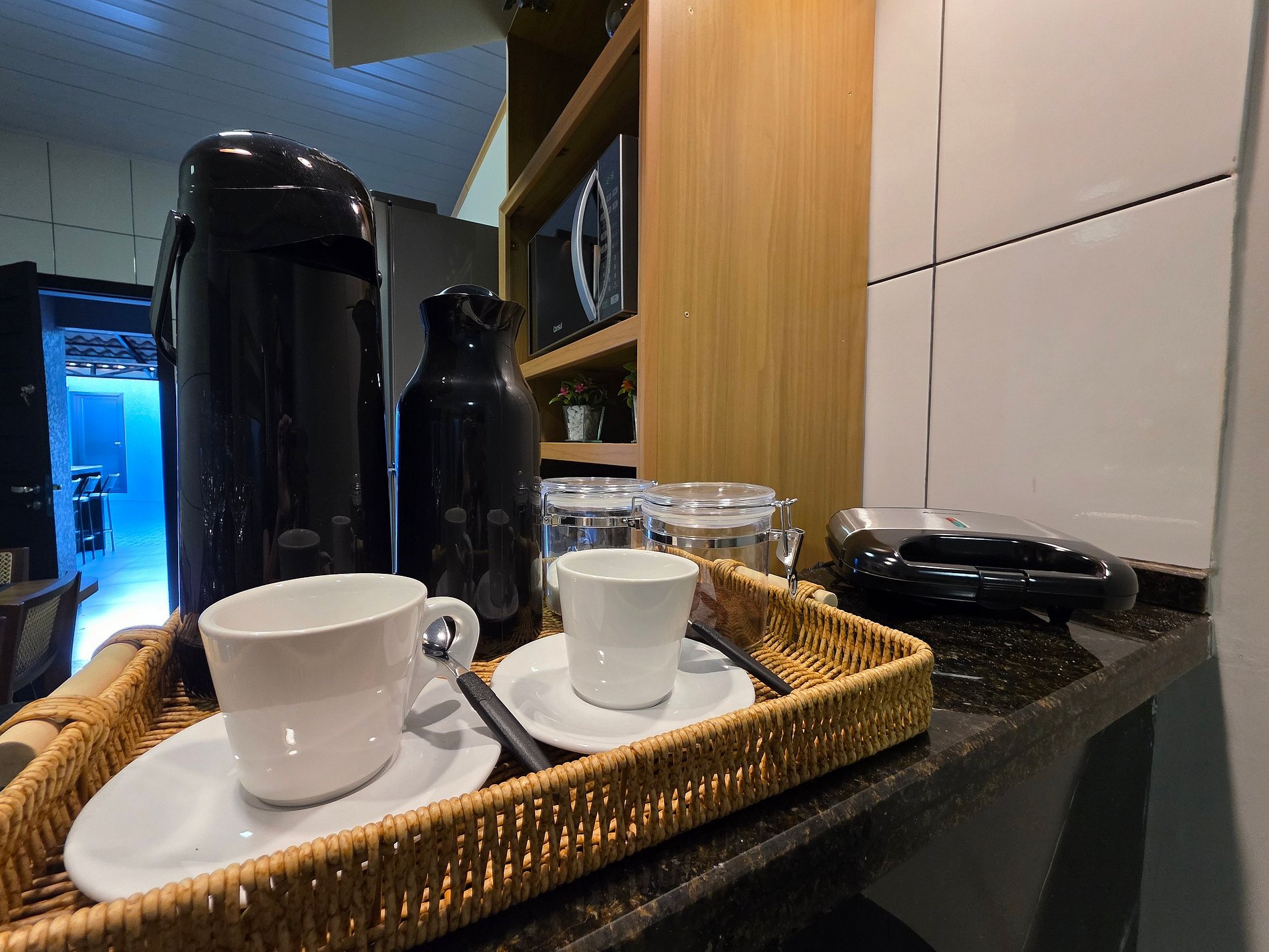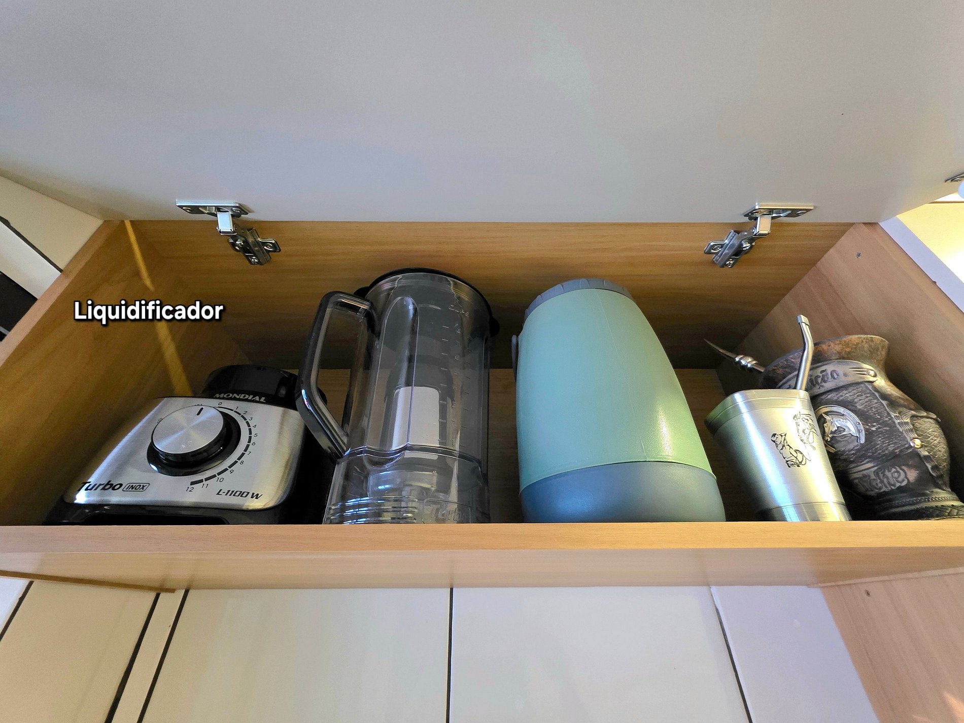 Cozinha completa com utensílios e louças para as refeições, microondas, forno, liquidificador e sanduicheira.