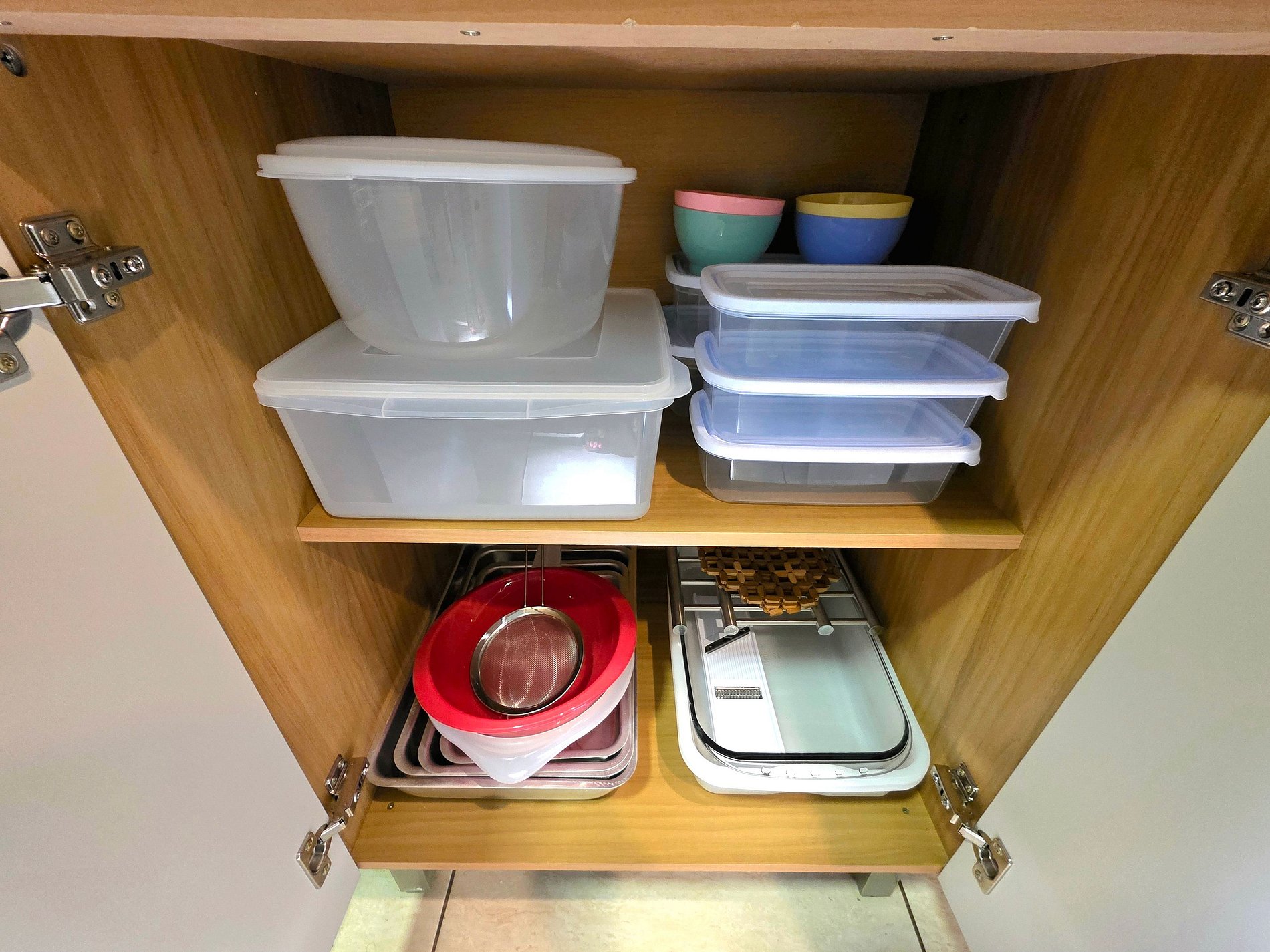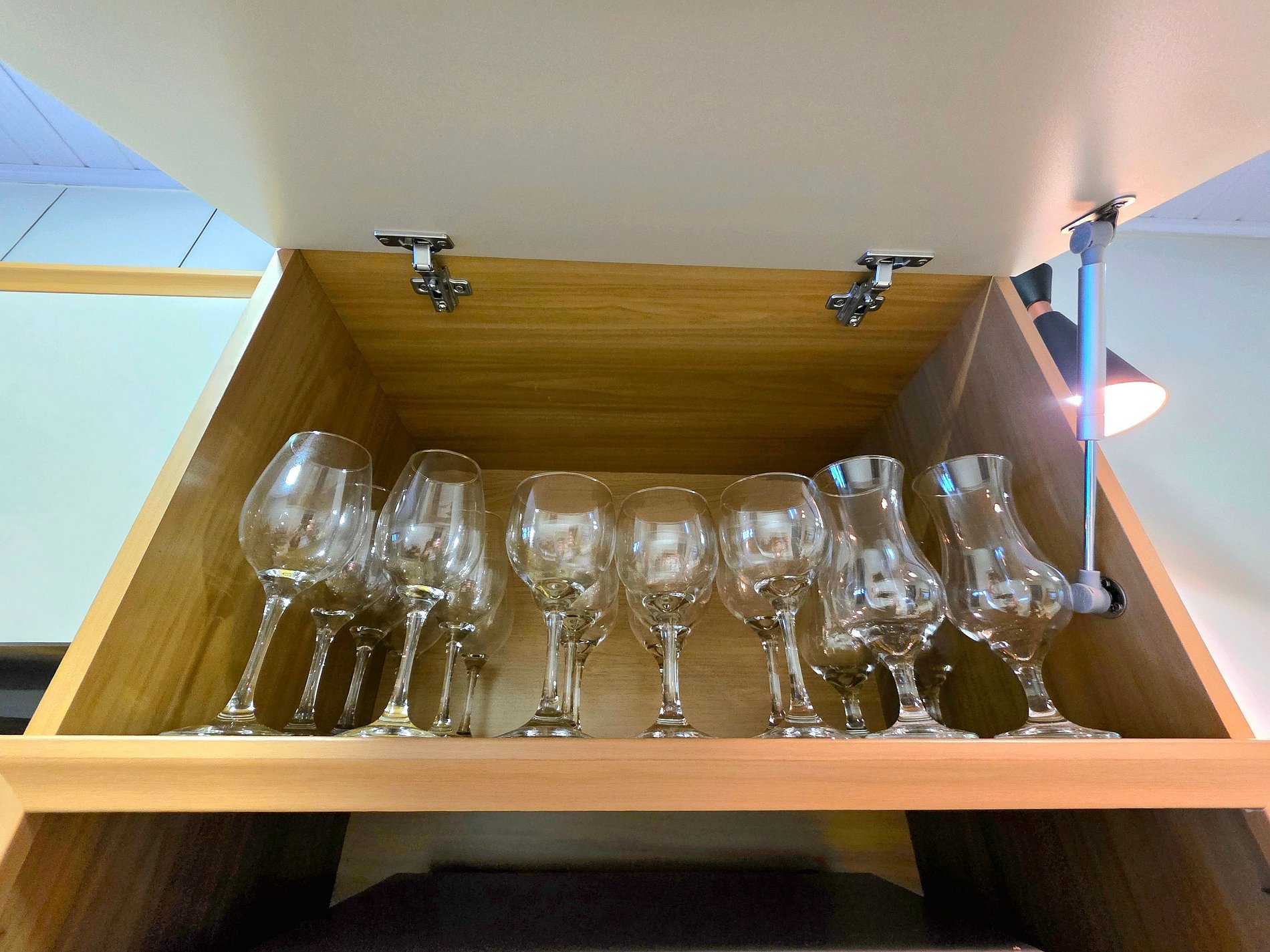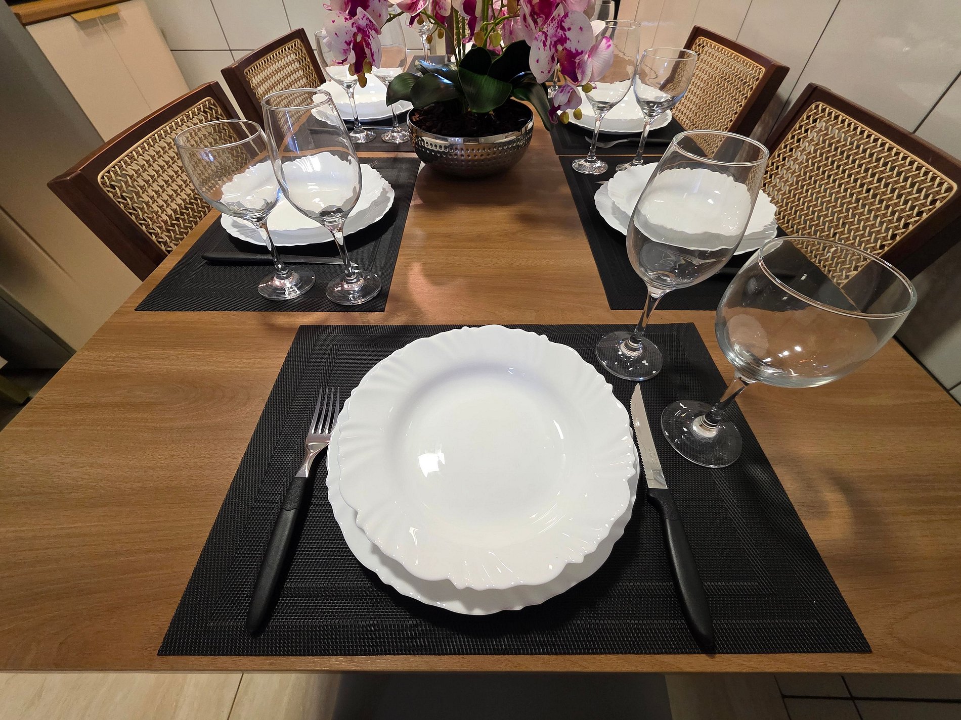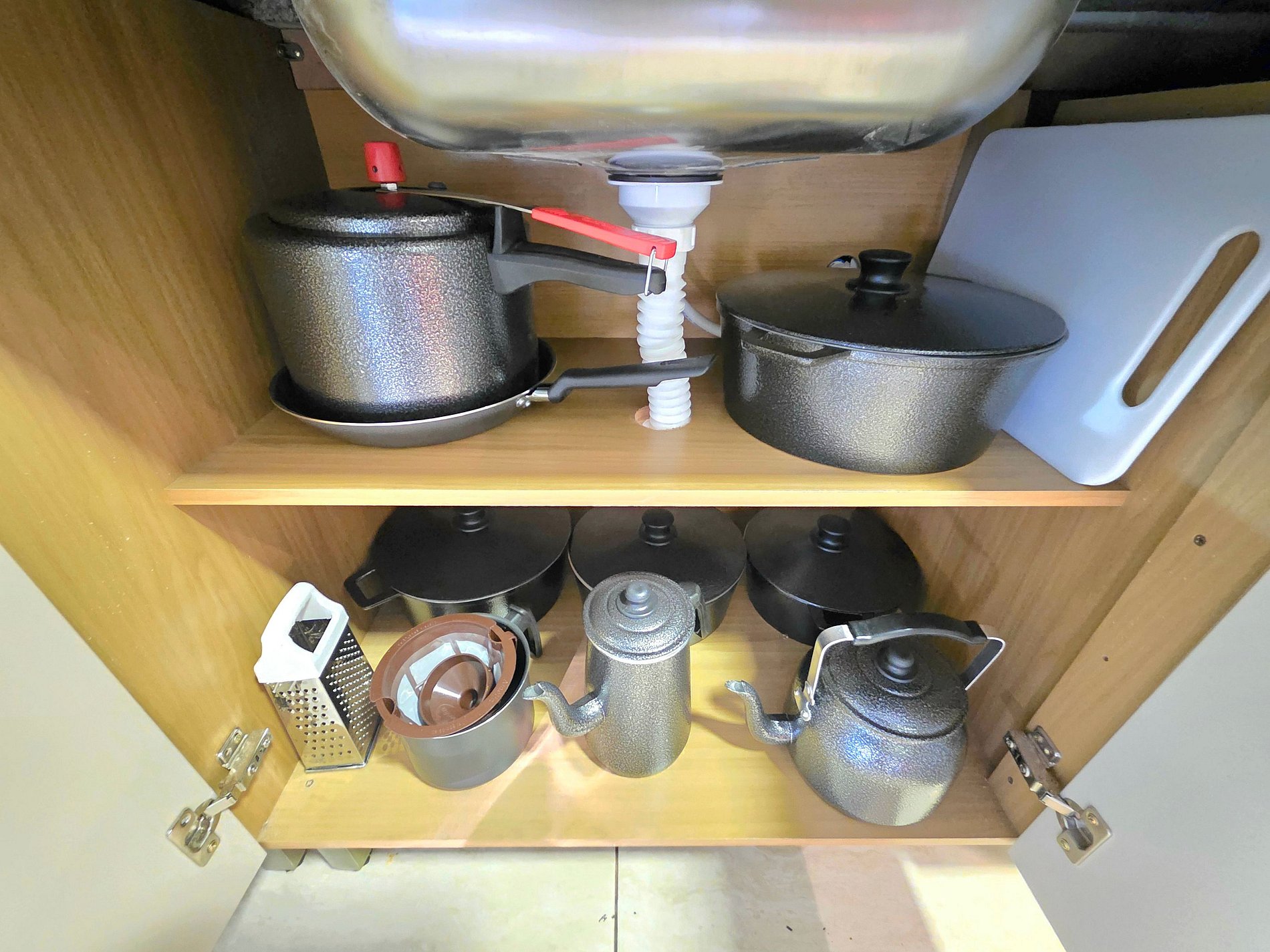 Cozinha completa com utensílios e louças para as refeições, microondas, forno, liquidificador e sanduicheira.