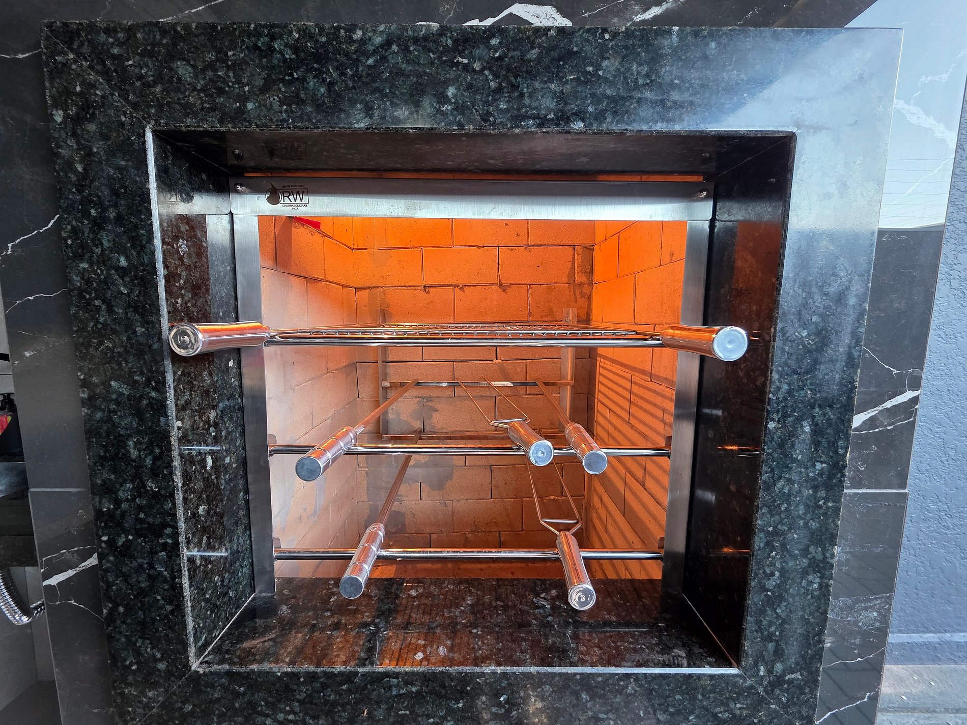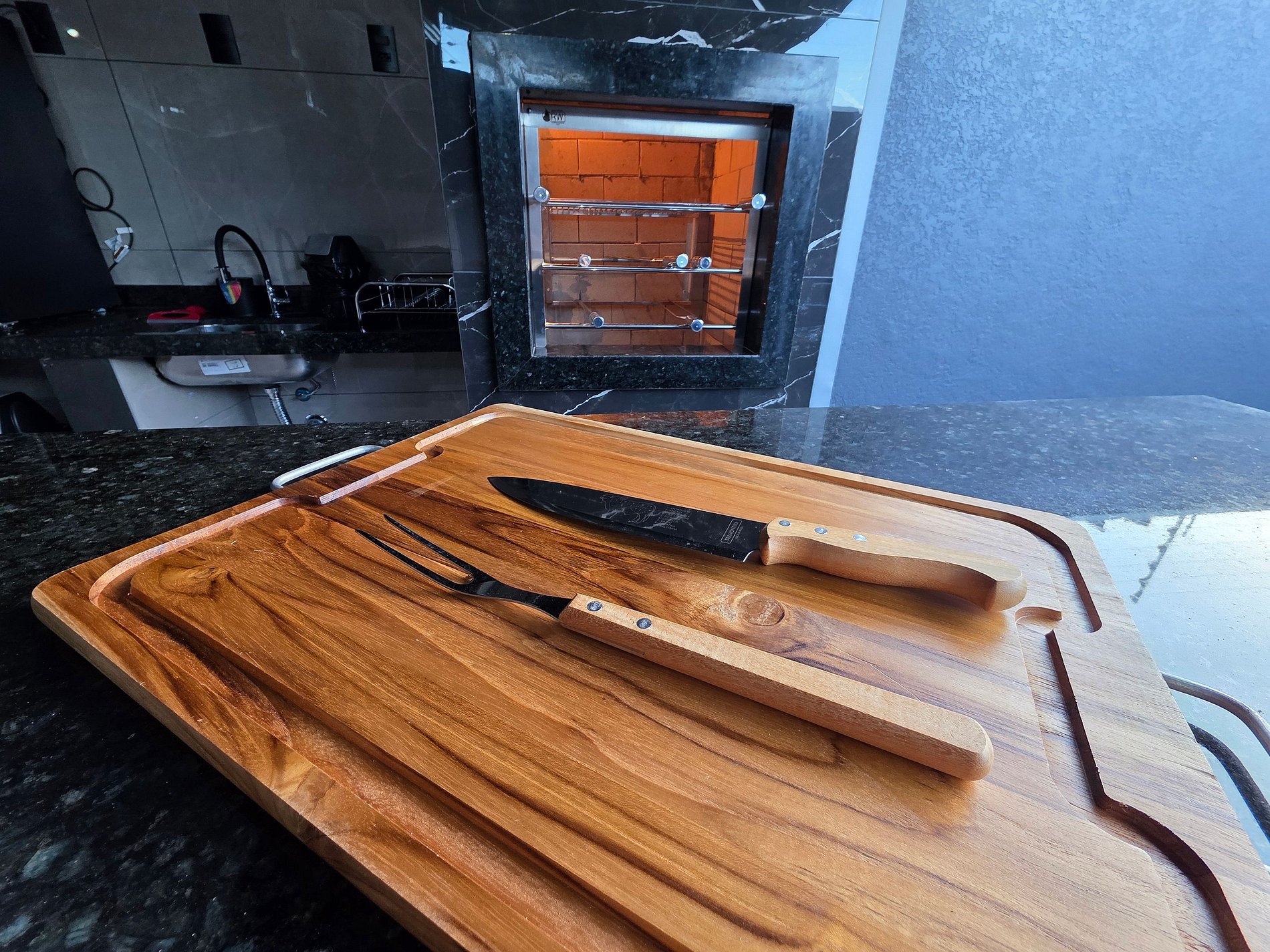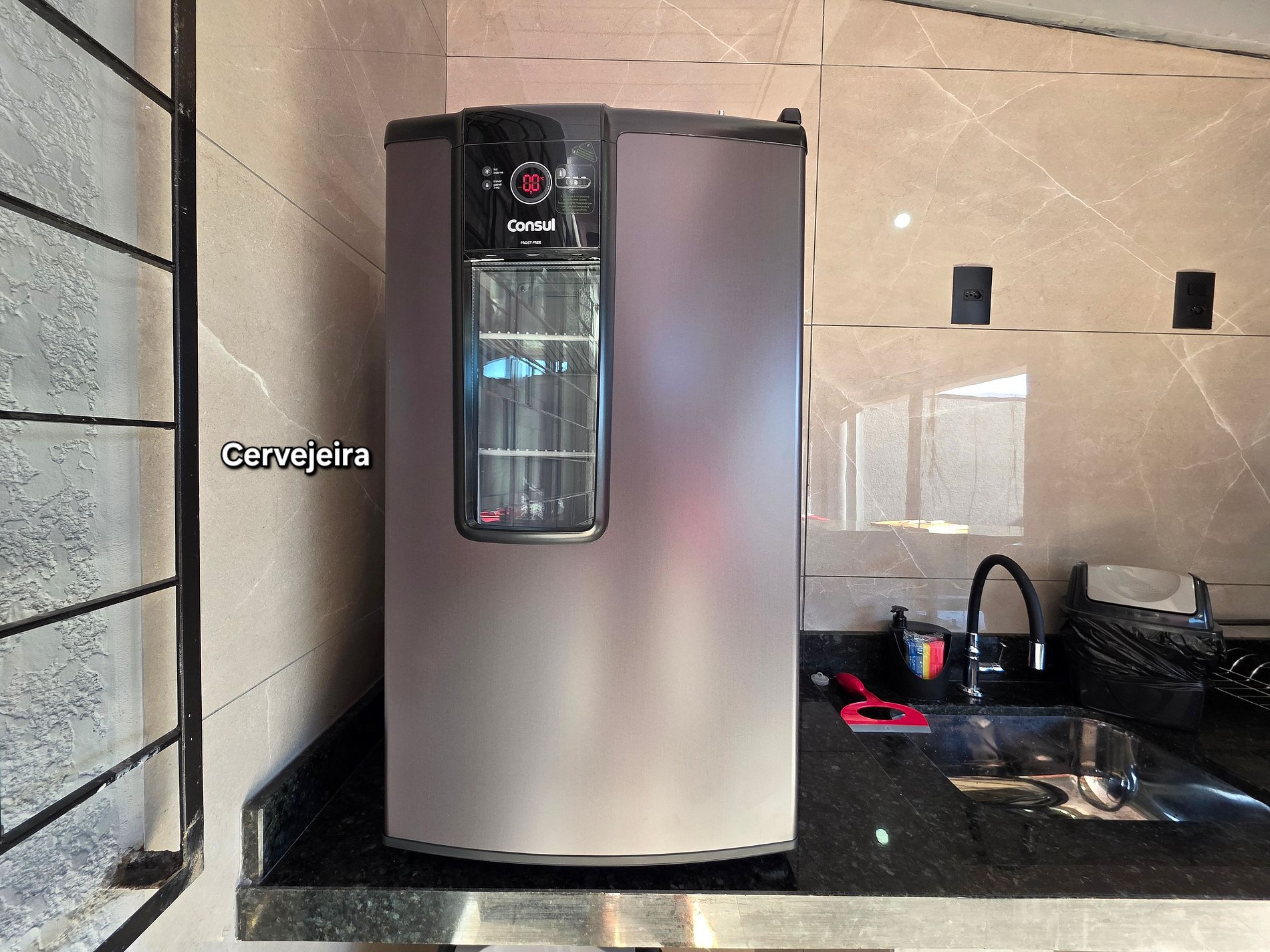 Area gourmet: Churrasqueira com grelha e espetos, mesa de sinuca e cervejeira.