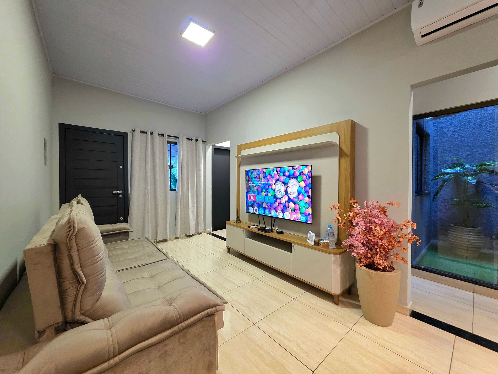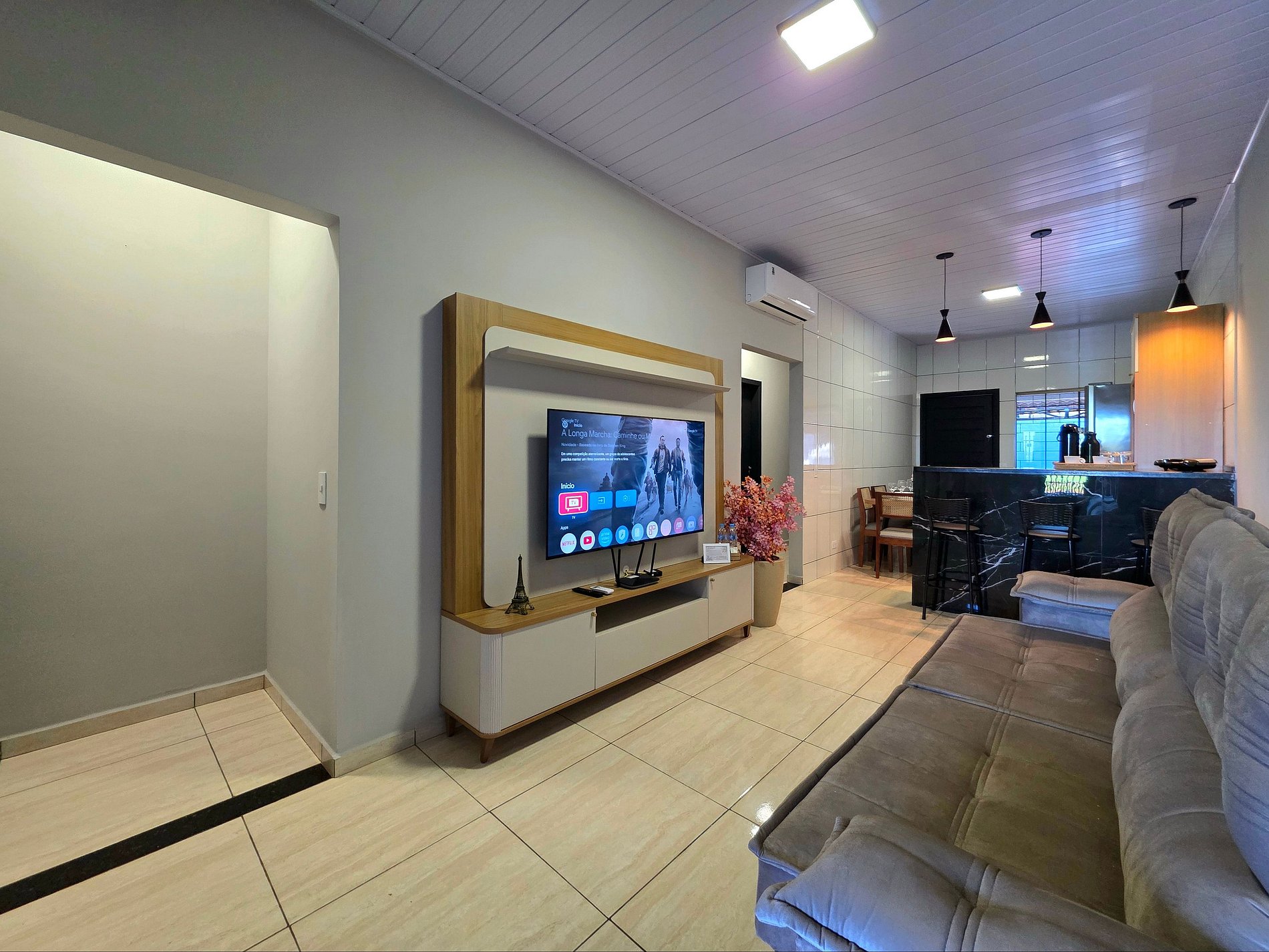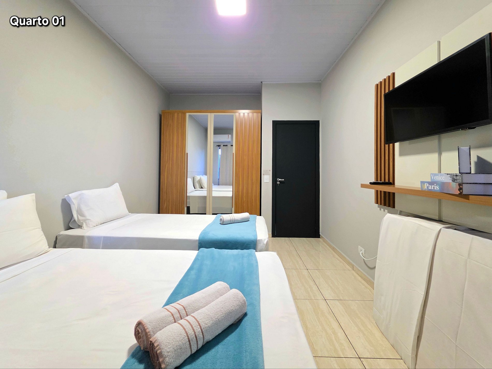 Quarto 01: 01 cama de casal + 01 de solteiro c/ SmartTV e ar condicionado (mais 2 colchões de solteiro avulso, deixamos roupas de cama e toalhas de banho para eles - total 4 pessoas nesse quarto)