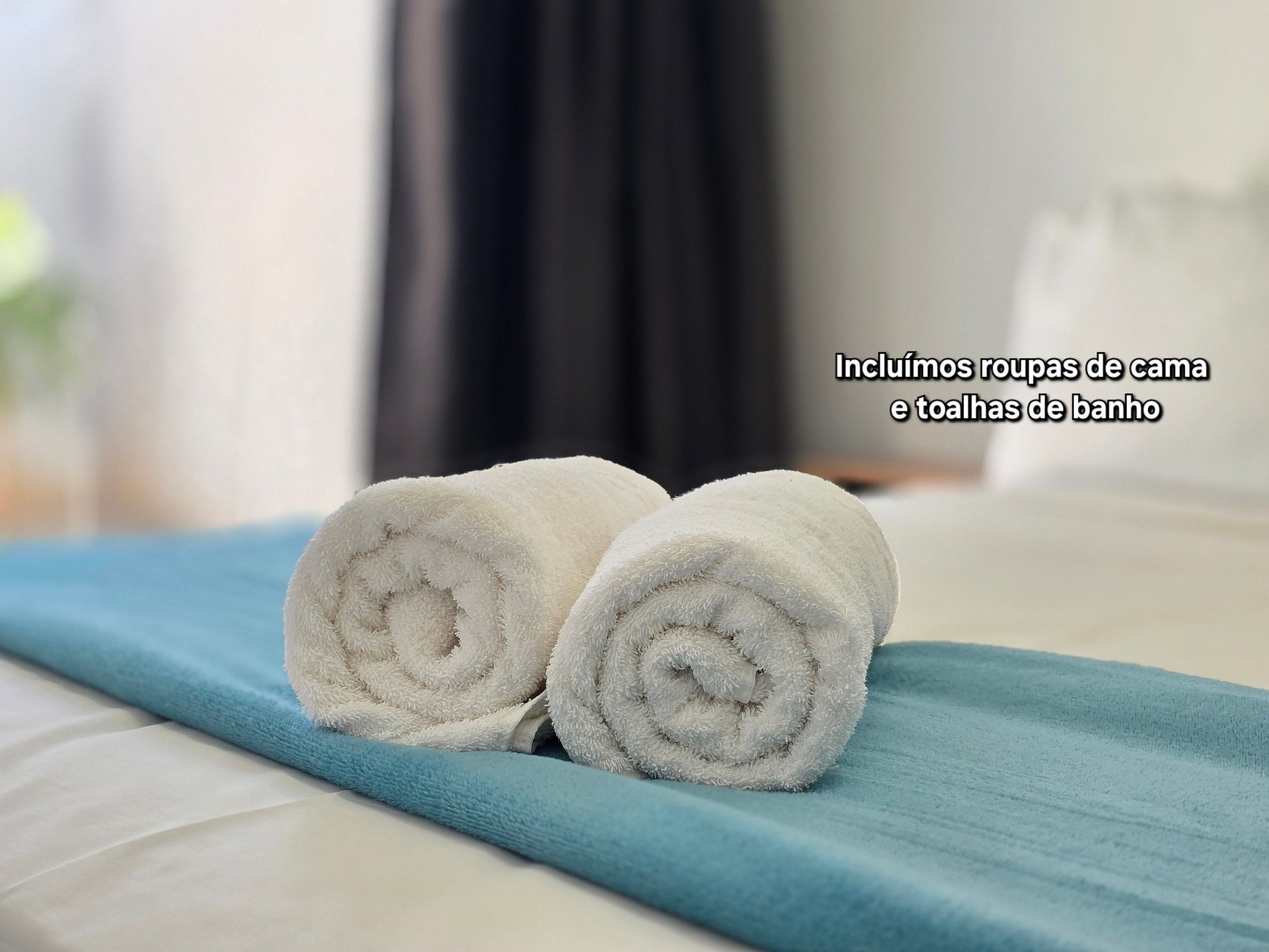 Toalhas de banho (01 por hospede, independente da quantidade de diárias) e 01 de rosto por banheiro