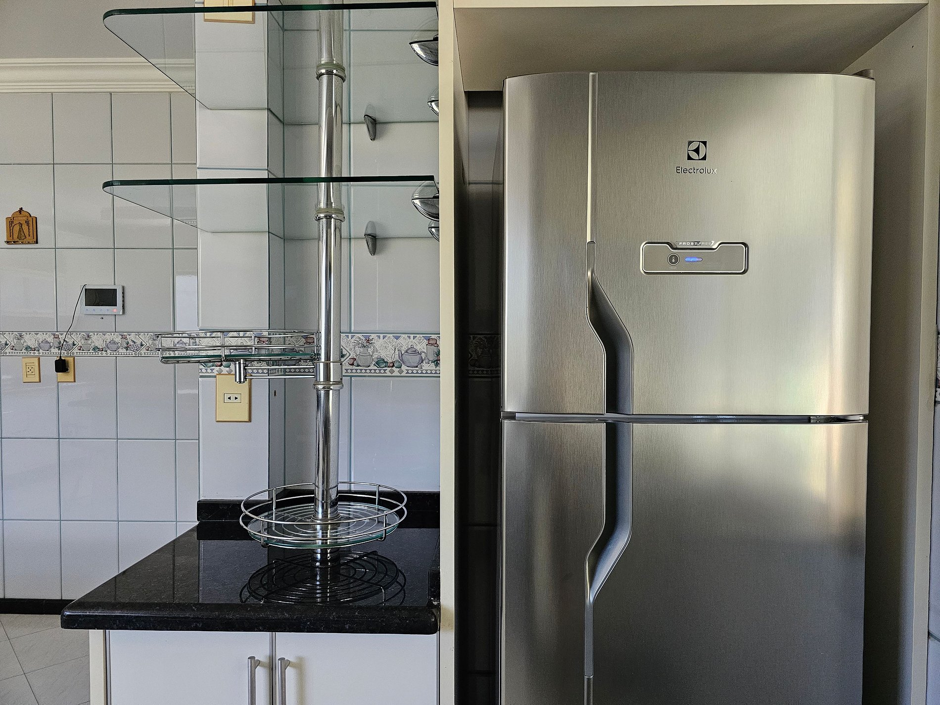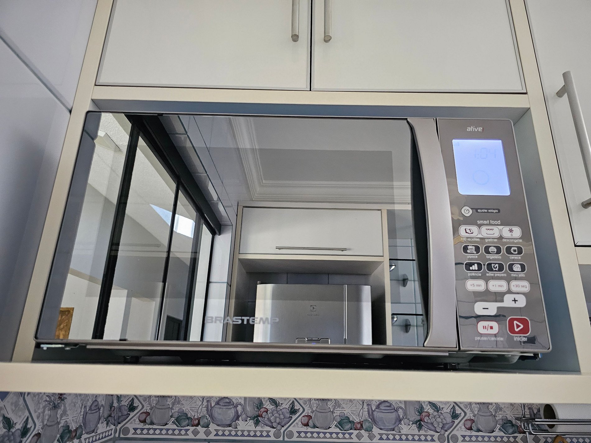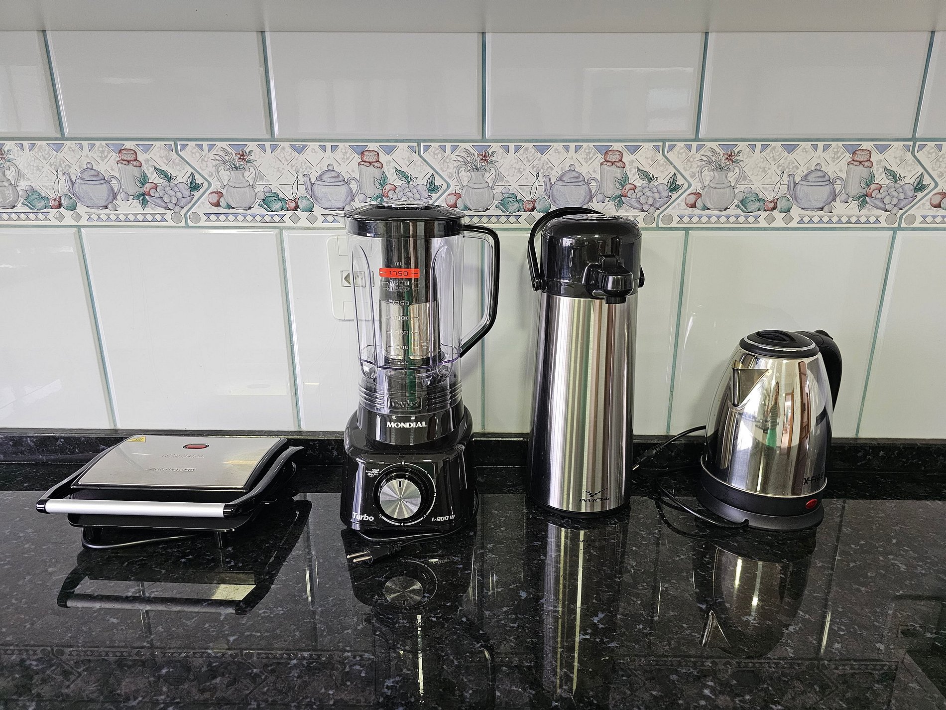 Cozinha completa com utensílios e louças para as refeições, microondas, forno, liquidificador e cafeteira elétrica.