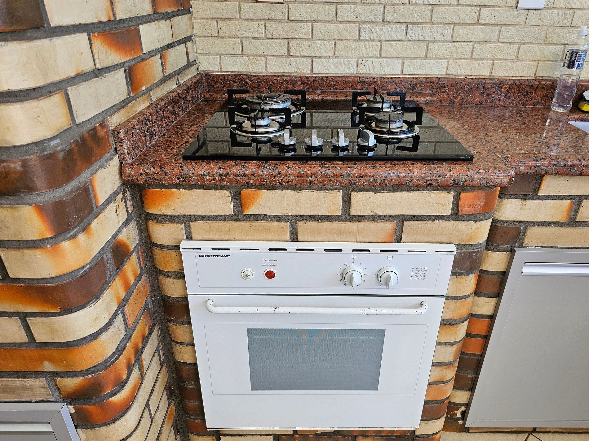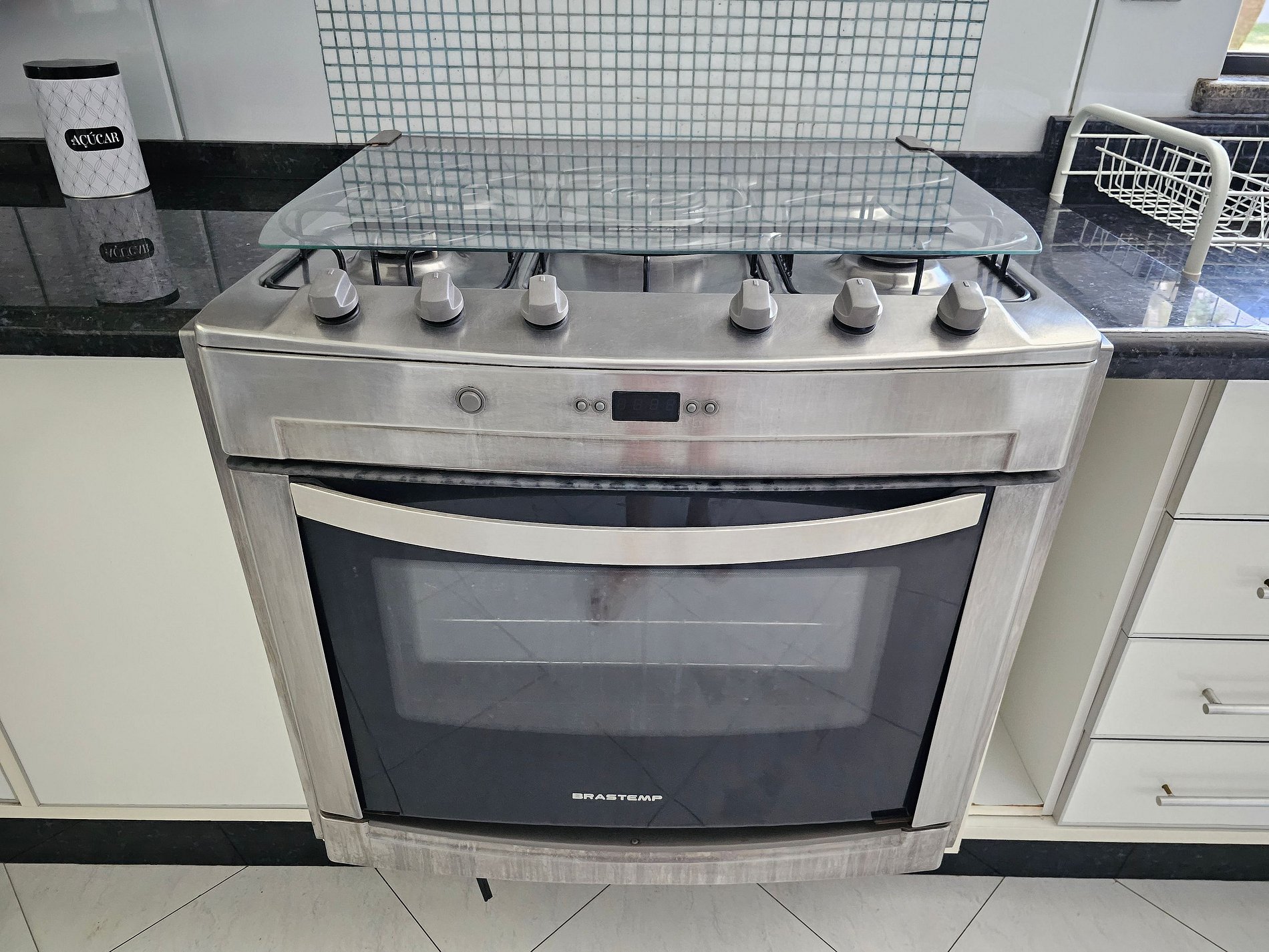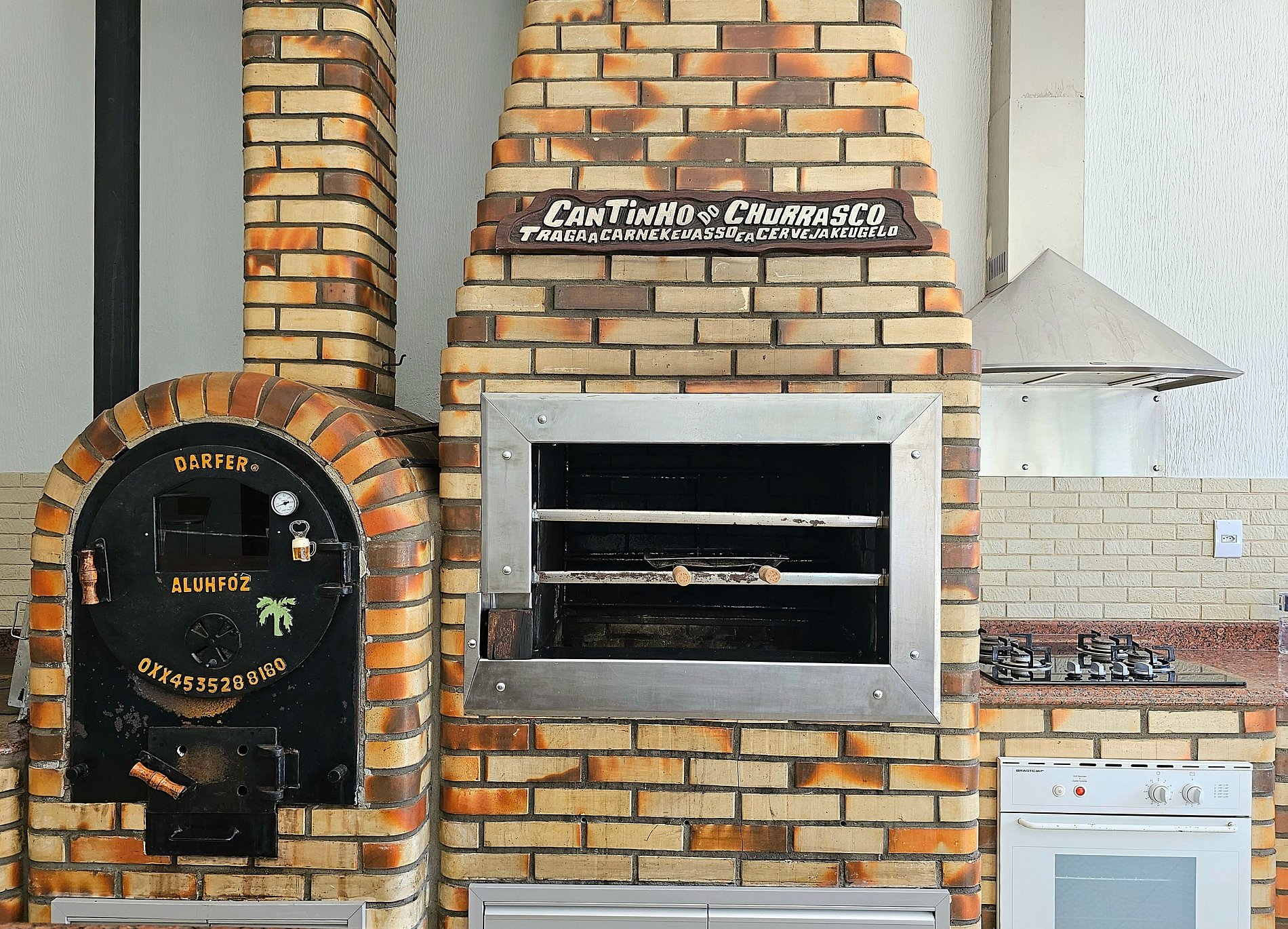 Cozinha completa com utensílios e louças para as refeições, microondas, forno, liquidificador e cafeteira elétrica.