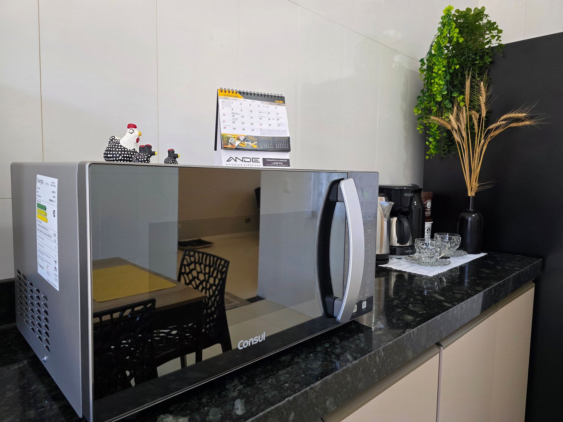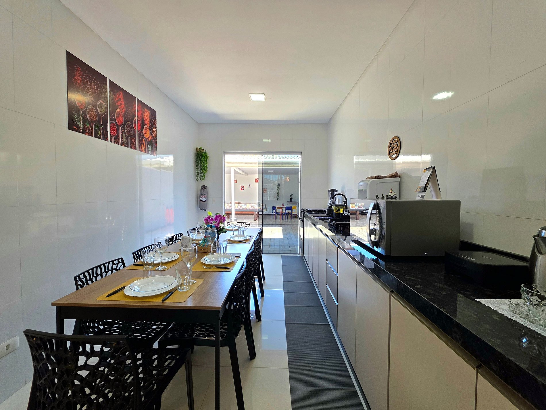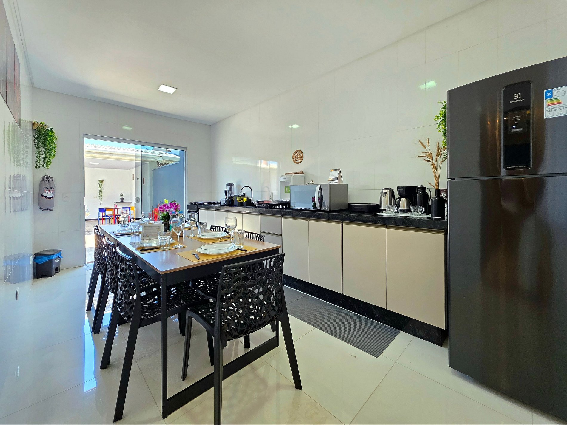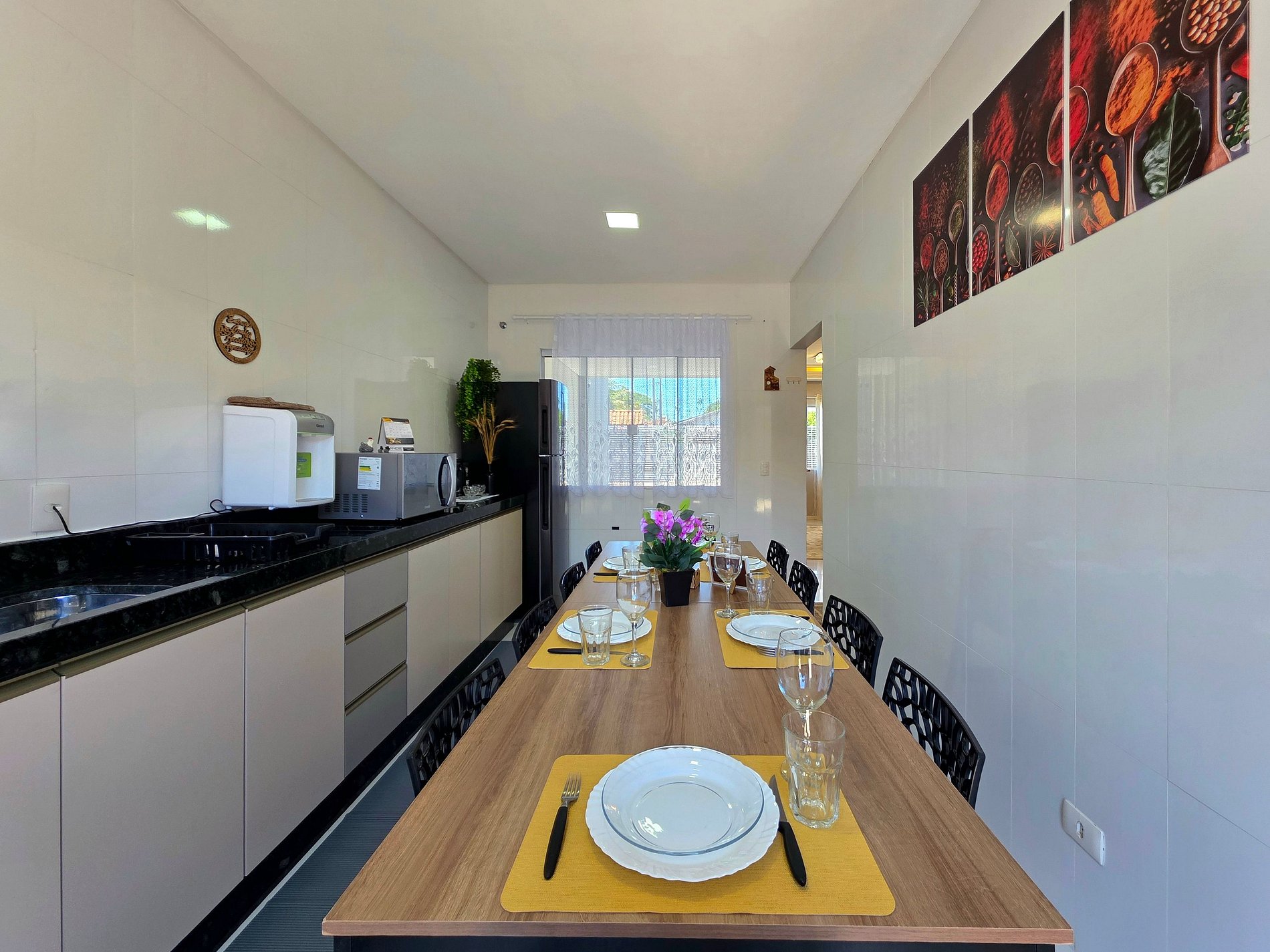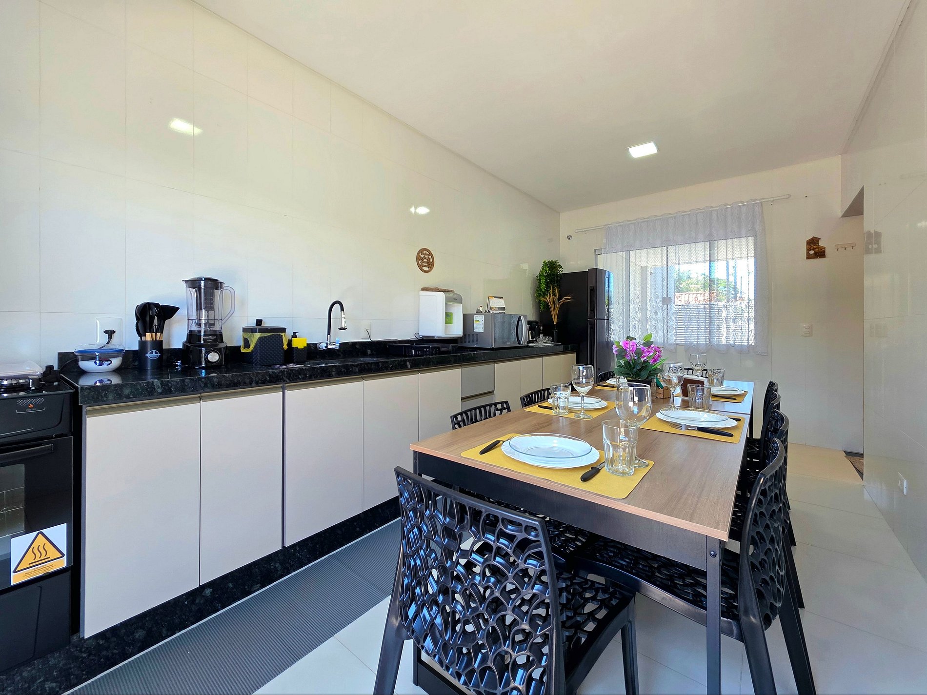* Cozinha: Cozinha completa com utensílios e louças para refeições. Equipamentos disponíveis: micro-ondas, liquidificador, sanduicheira e cafeteira elétrica.