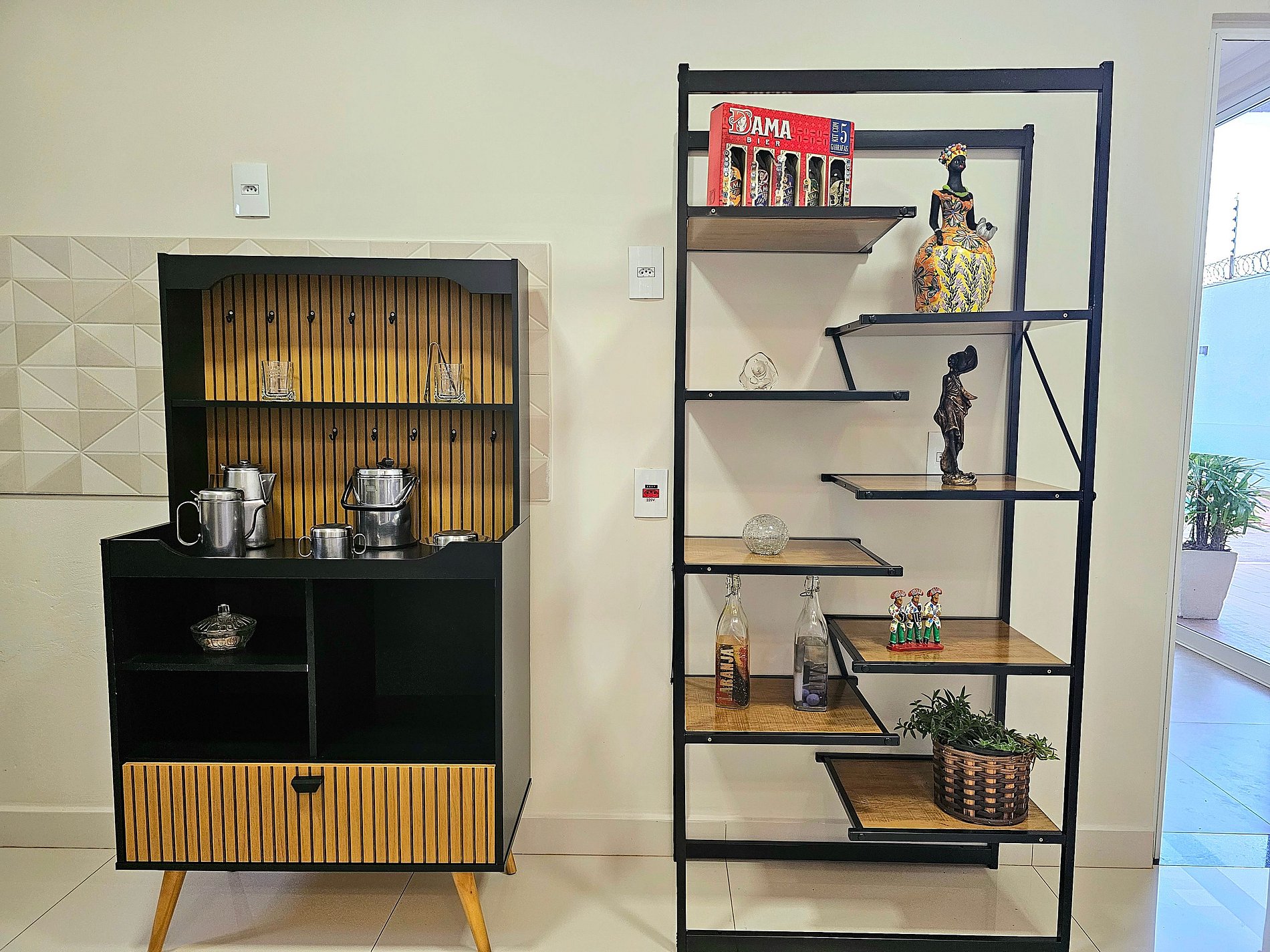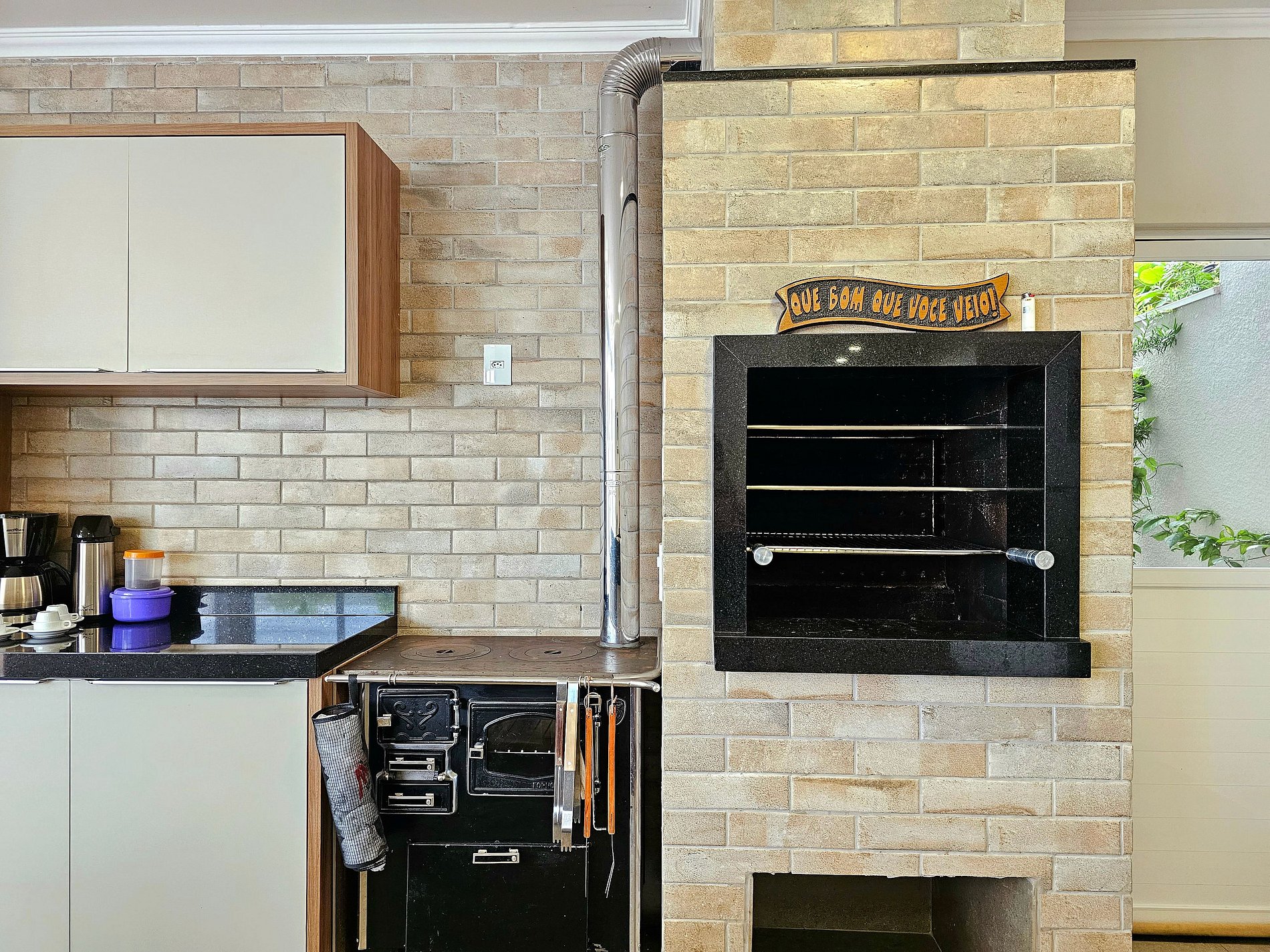 Area gourmet com piscina, equipada com utensilios e louças para as refeições, fogão, microondas, liquidificador, sanduicheira, torradeira, cafeteira.