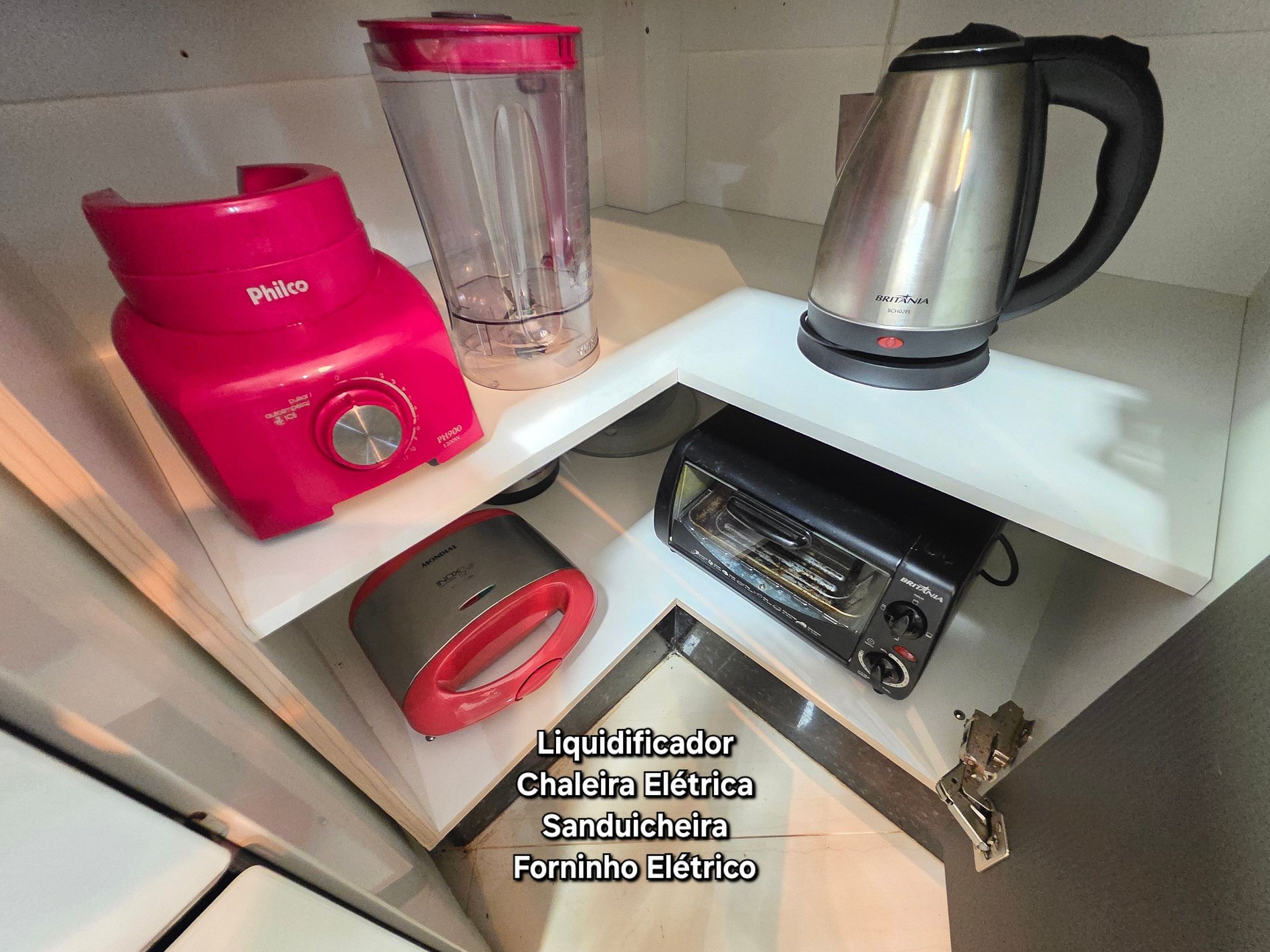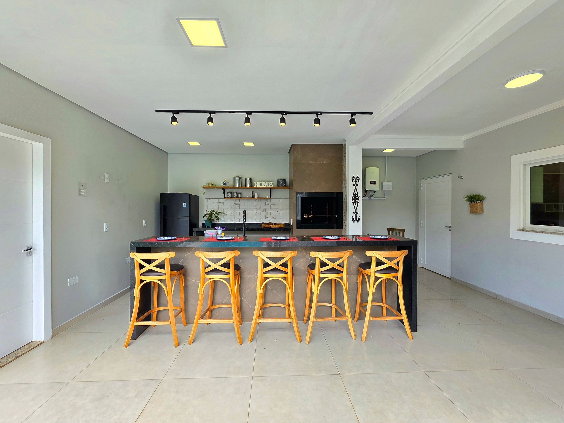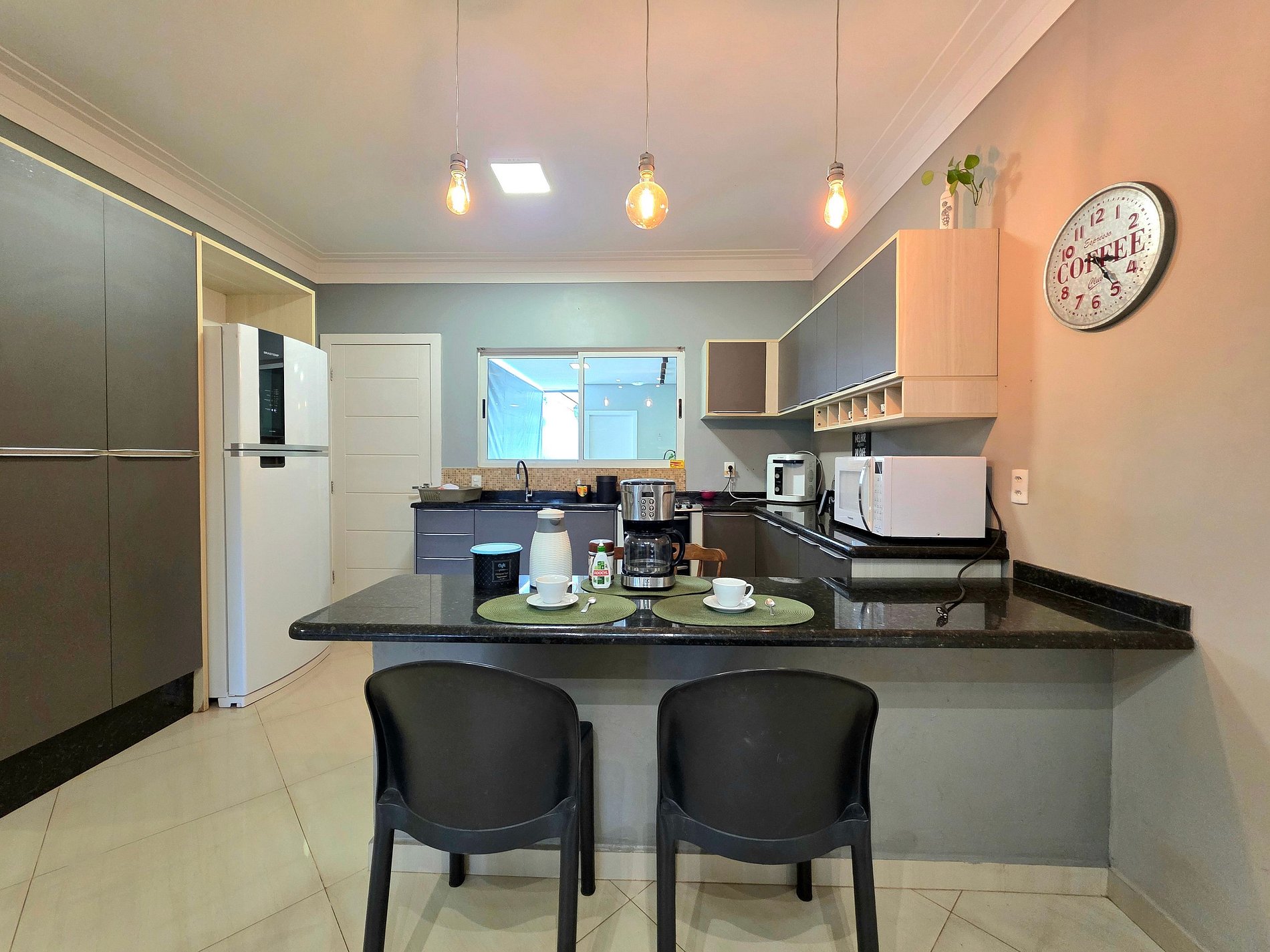 Area gourmet com piscina, equipada com utensilios e louças para as refeições, fogão com forno, microondas, liquidificador, sanduicheira, cafeteira elétrica, chaleira elétrica, forninho elétrico e Airfryer. Temos filtro de água também.