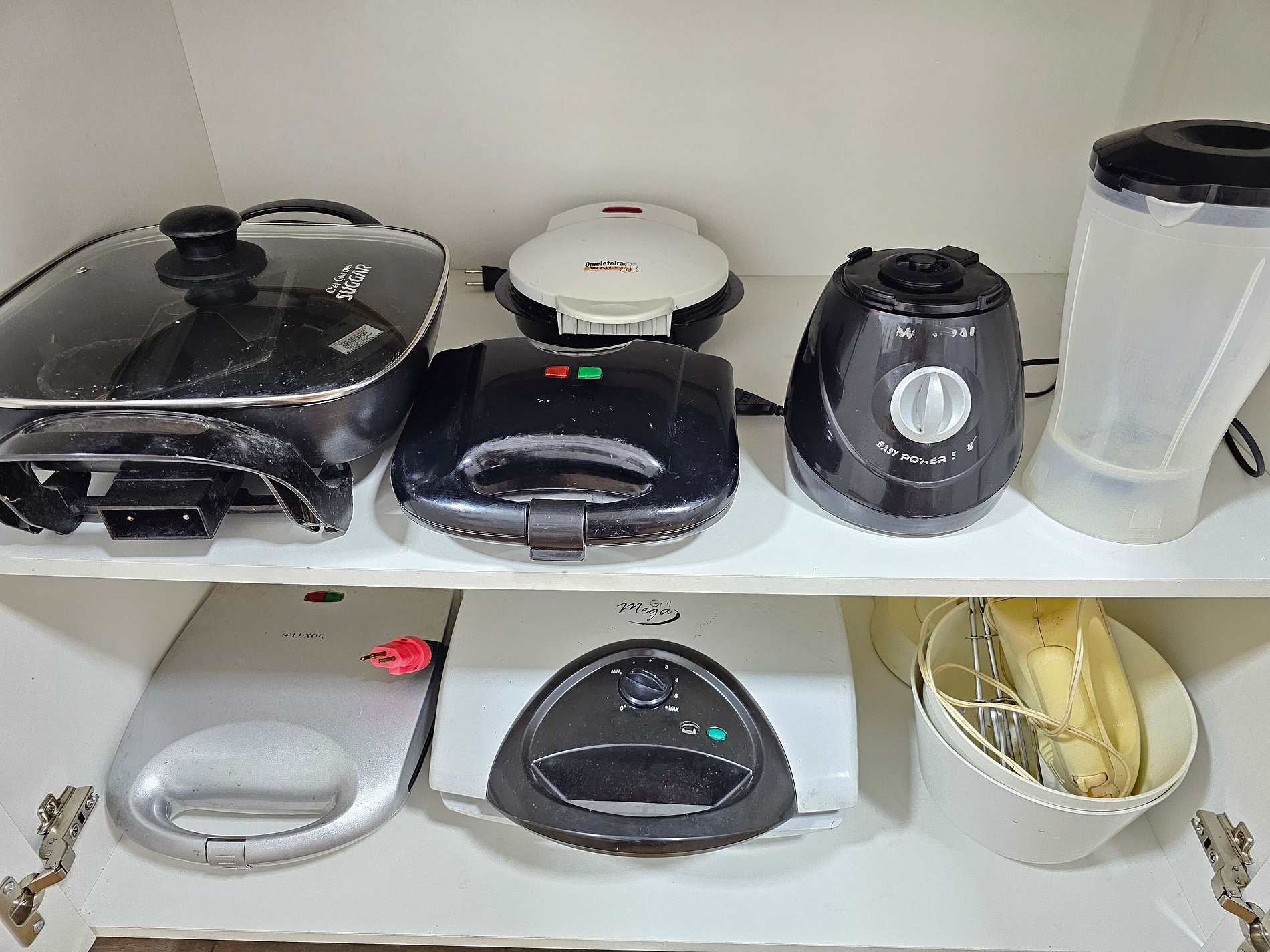 Cozinha completa com utensílios e louças para as refeições, fogão, forno, microondas, chaleira eletrica, sanduicheira, liquidificador.