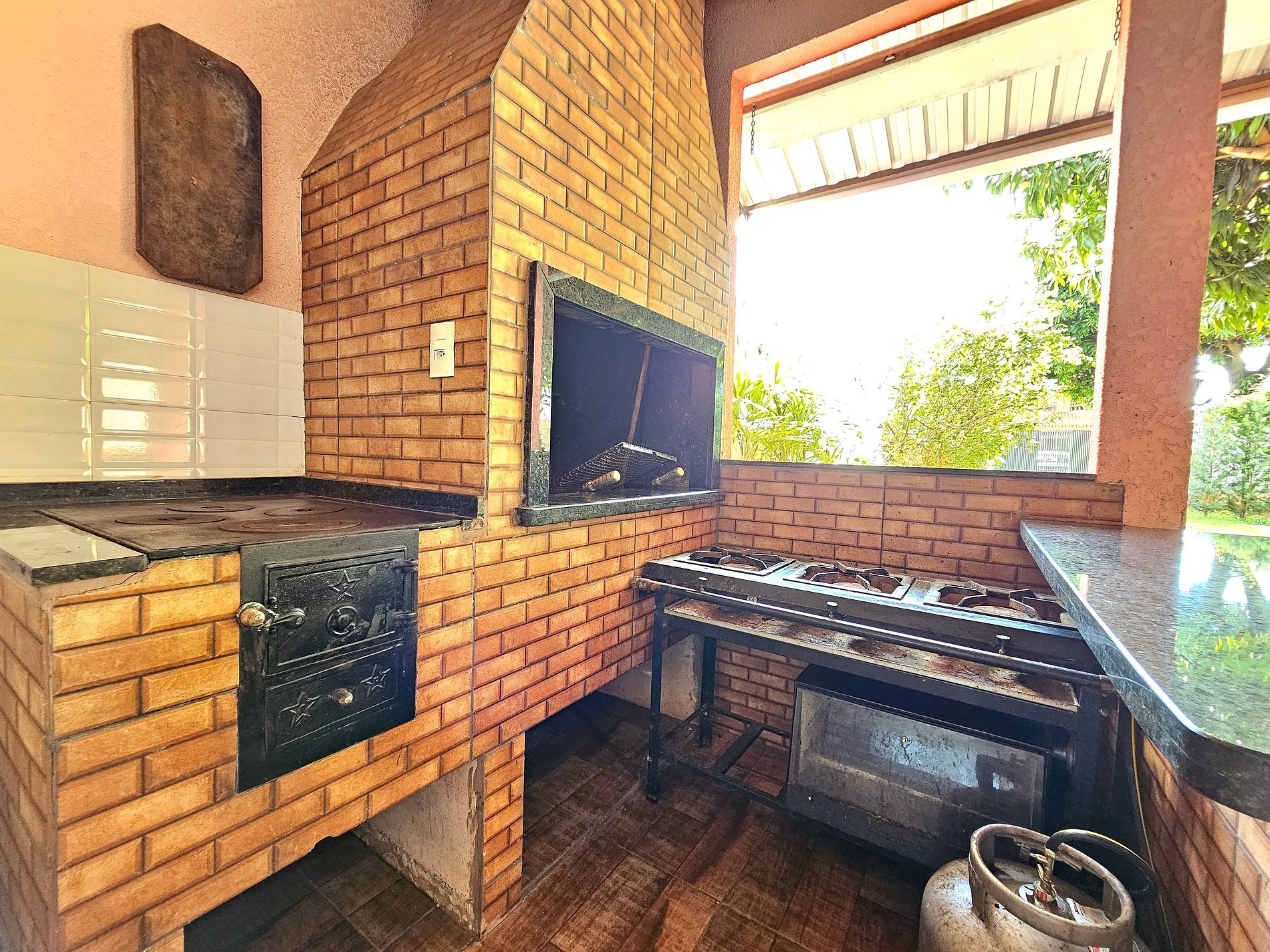 Churrasqueira com espetos e grelhas e fogão a lenha.