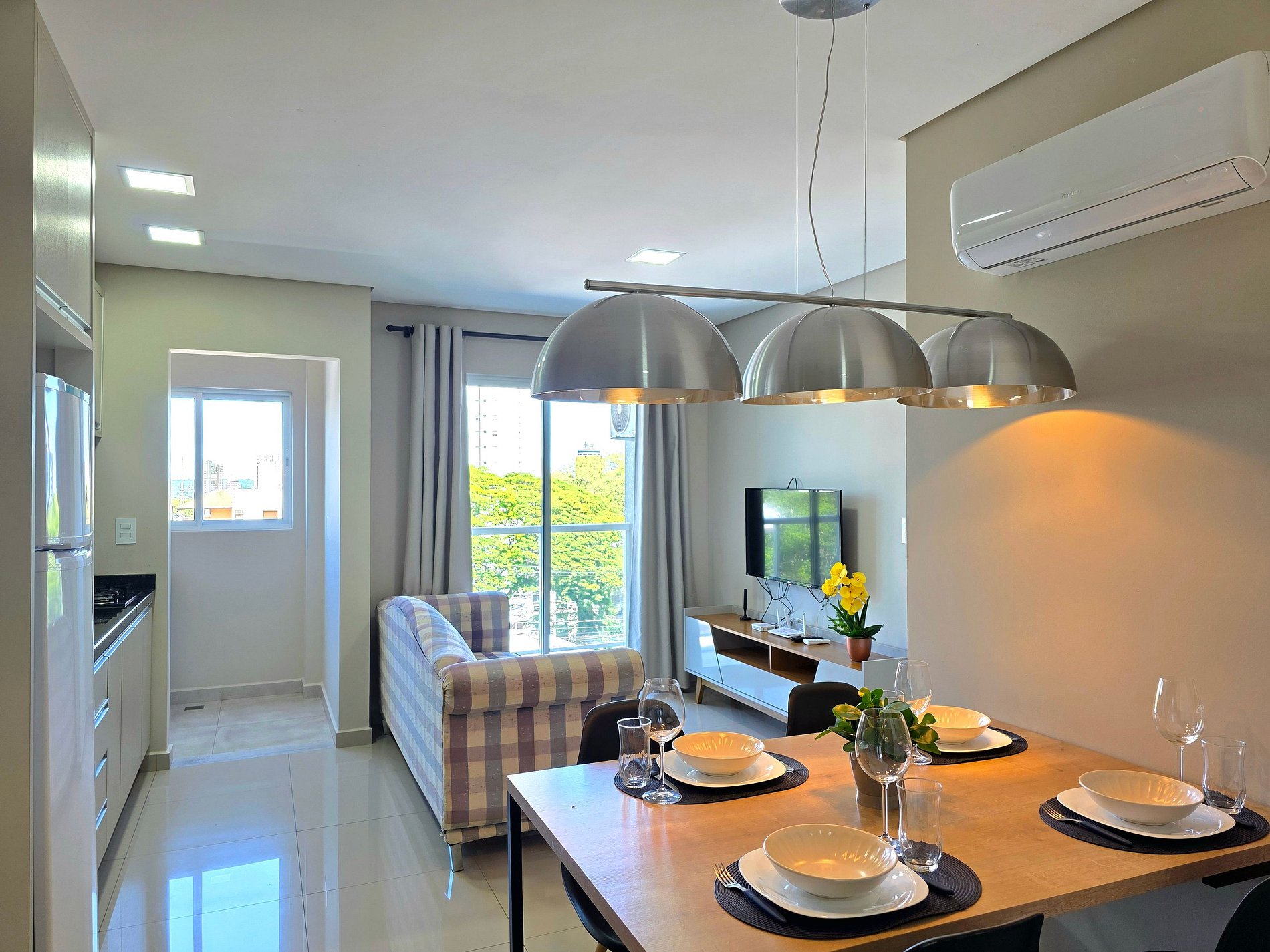 Ar condicionado nos 2 quartos, e na sala e cozinha.