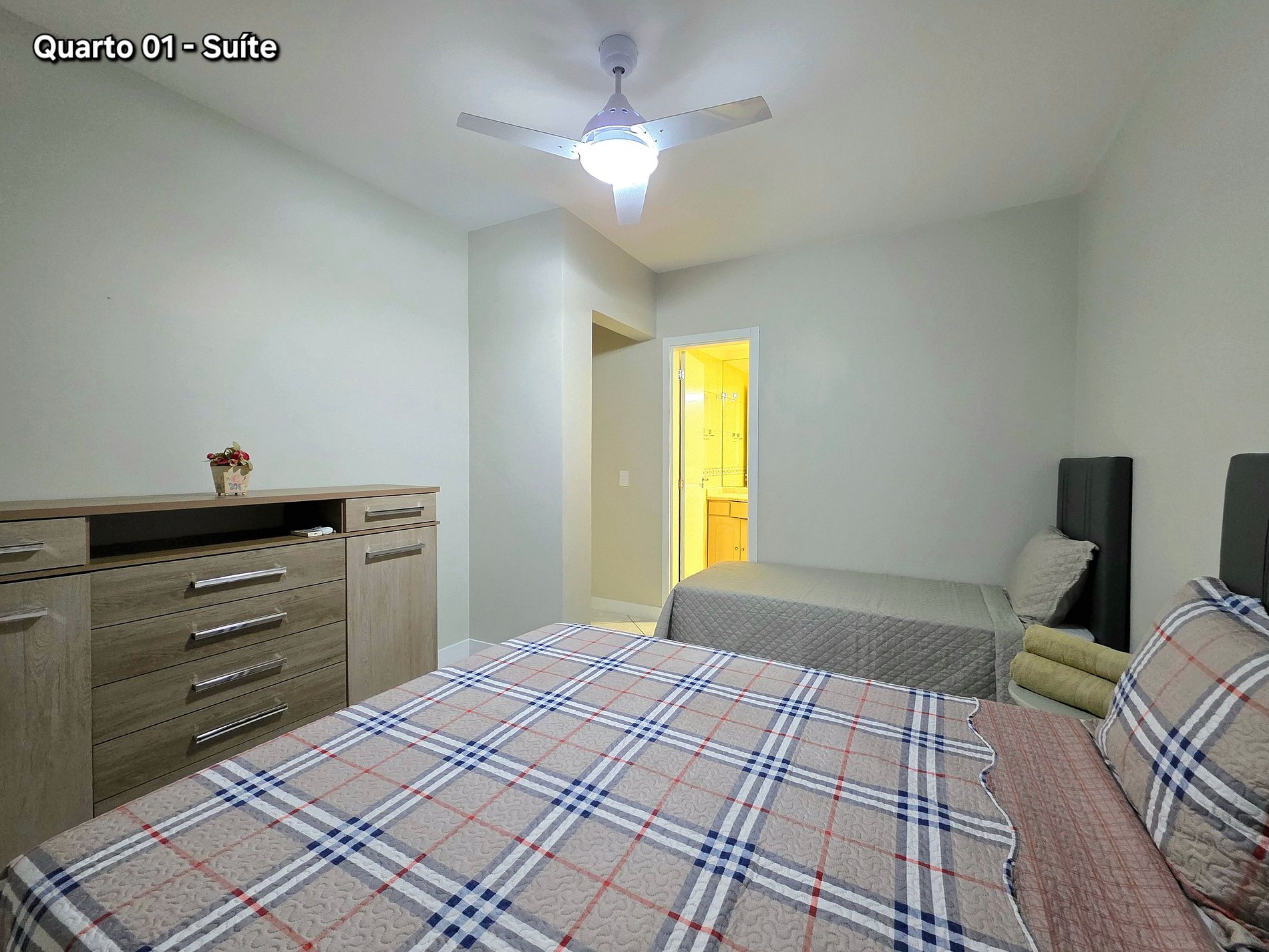Quarto 01: 01 suíte com 01 cama de queensize + 01 cama de solteiro (com banheiro e ar condicionado)