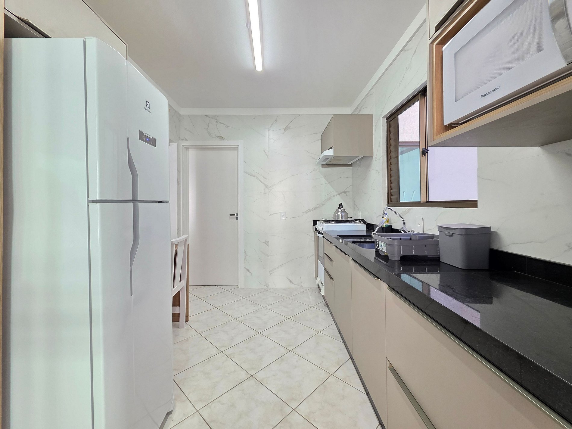 Cozinha completa com utensílios e louças para as refeições, microondas, forno, liquidificador, sanduicheira.