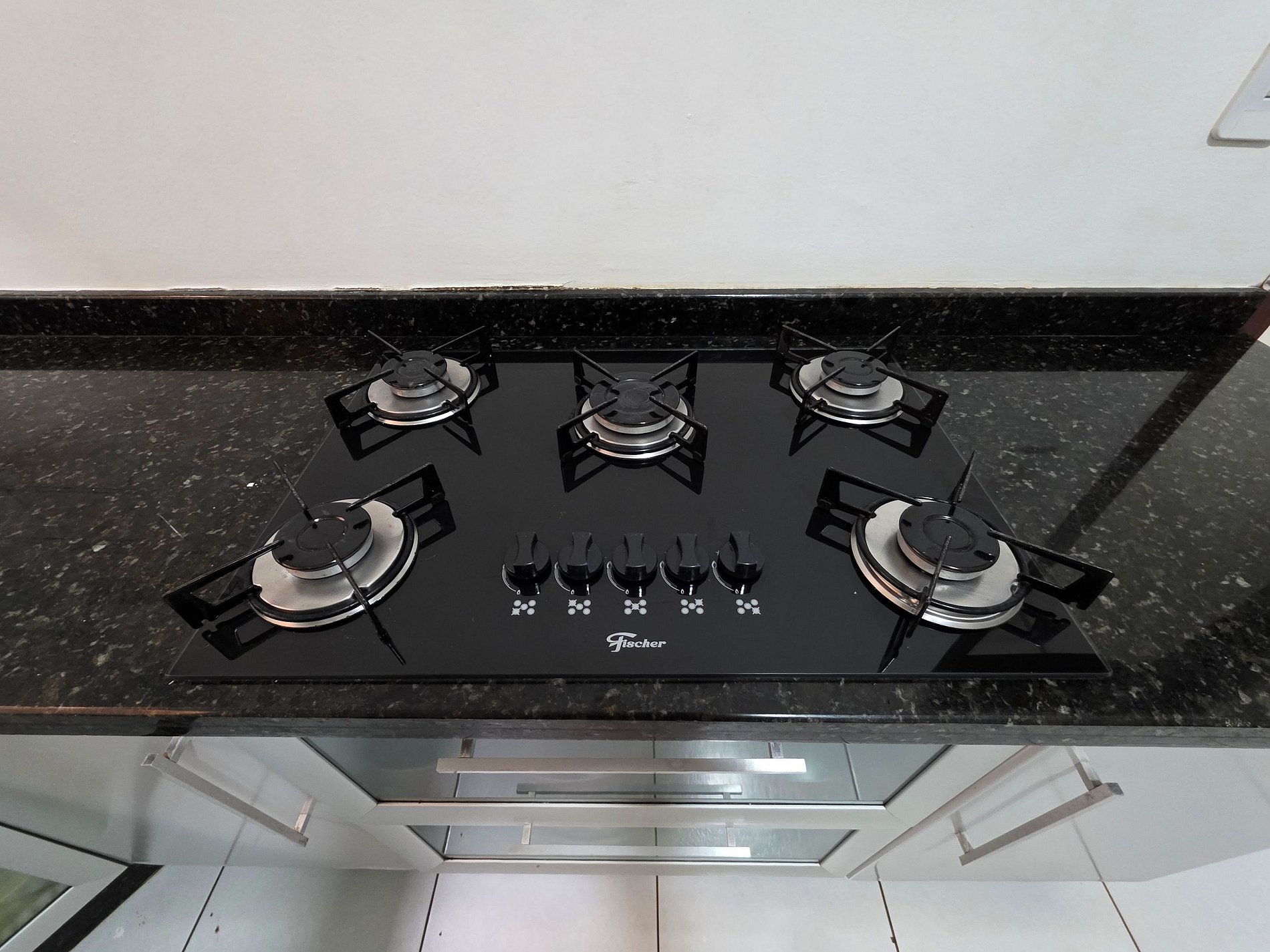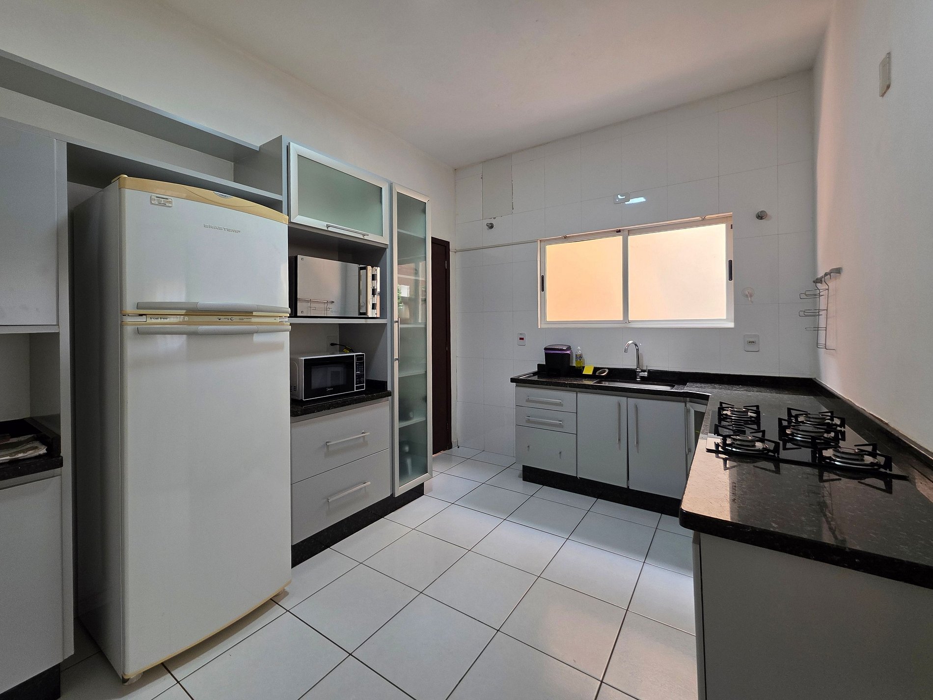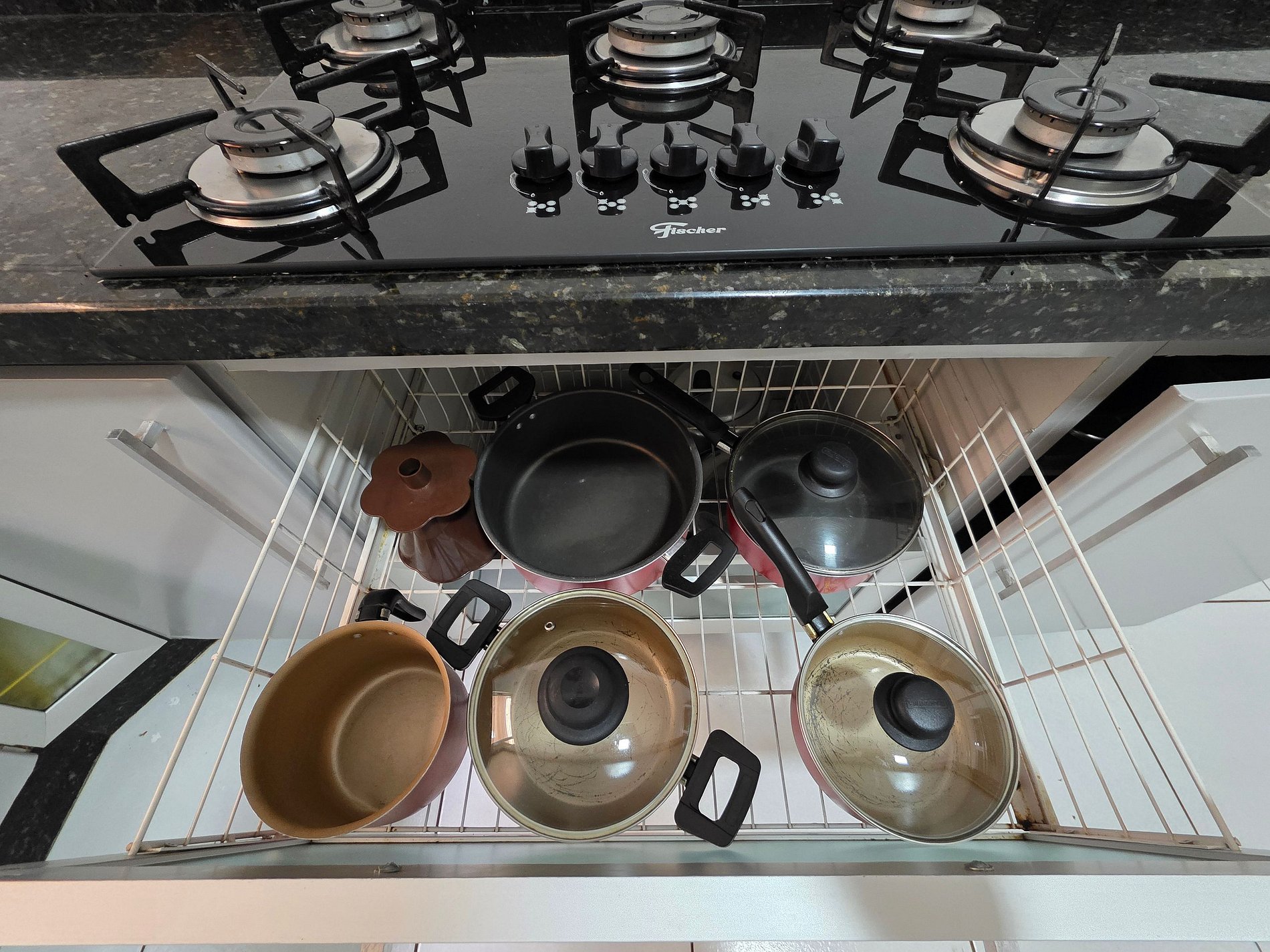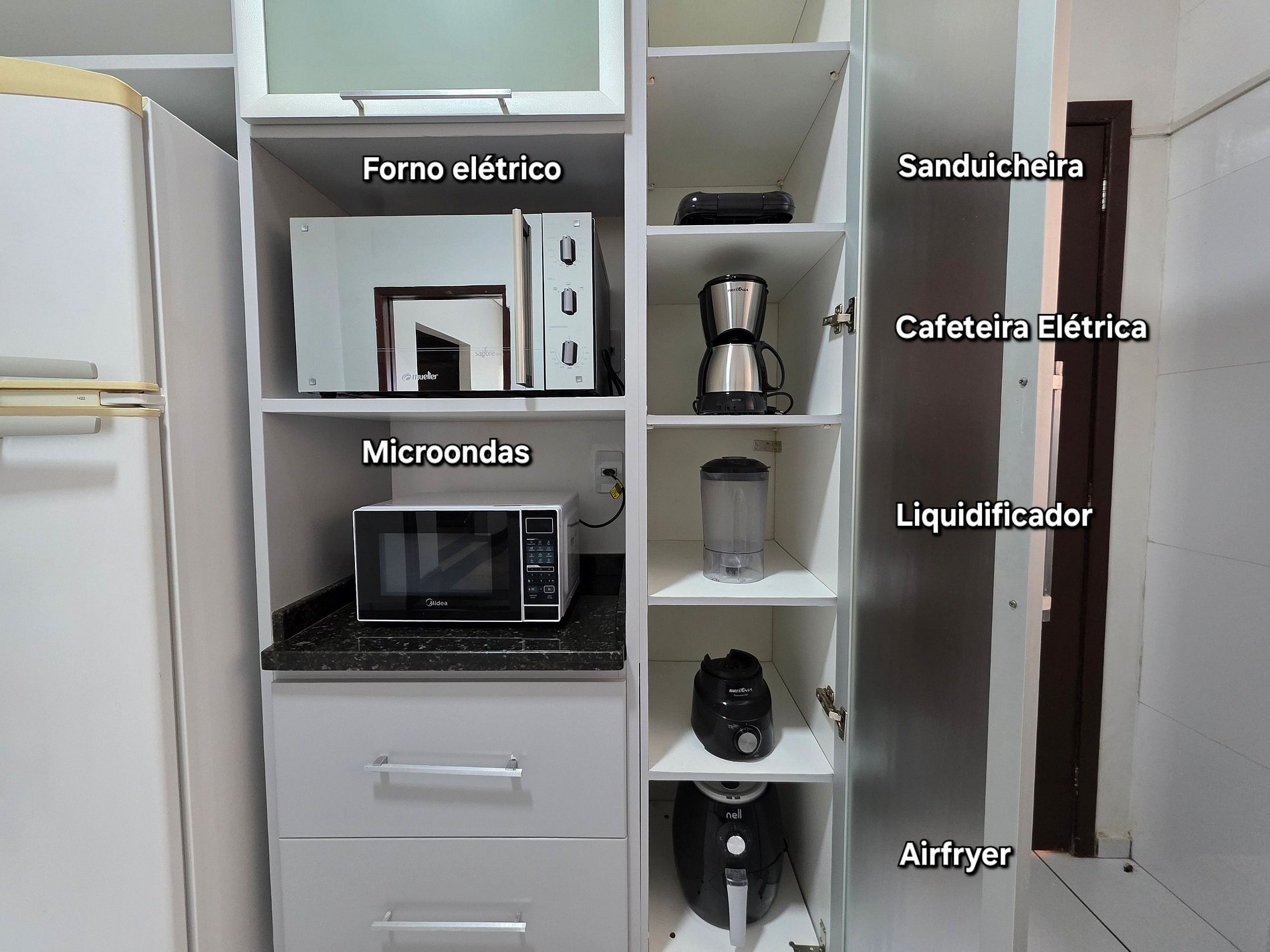 Cozinha completa com utensílios e louças para as refeições, microondas, forno, liquidificador, sanduicheira, cafeteira elétrica.