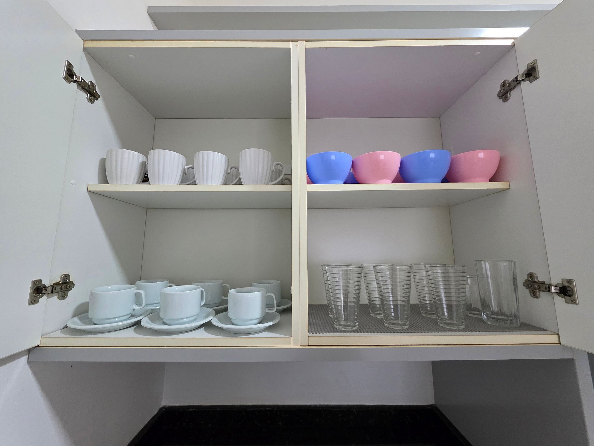 Cozinha completa com utensílios e louças para as refeições, microondas, forno, liquidificador, sanduicheira, cafeteira elétrica.
