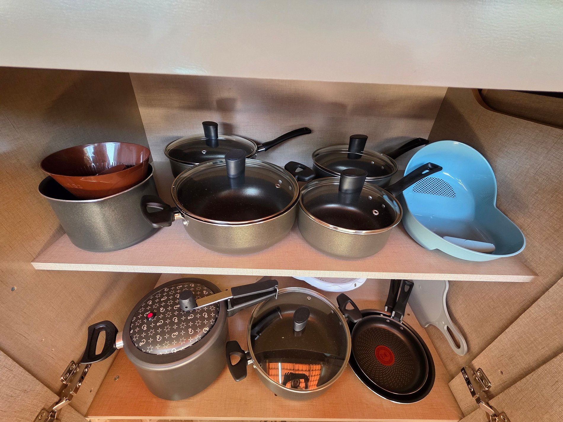 Cozinha completa com utensílios e louças para as refeições, fogão, microondas, sanduicheira, liquidificador.