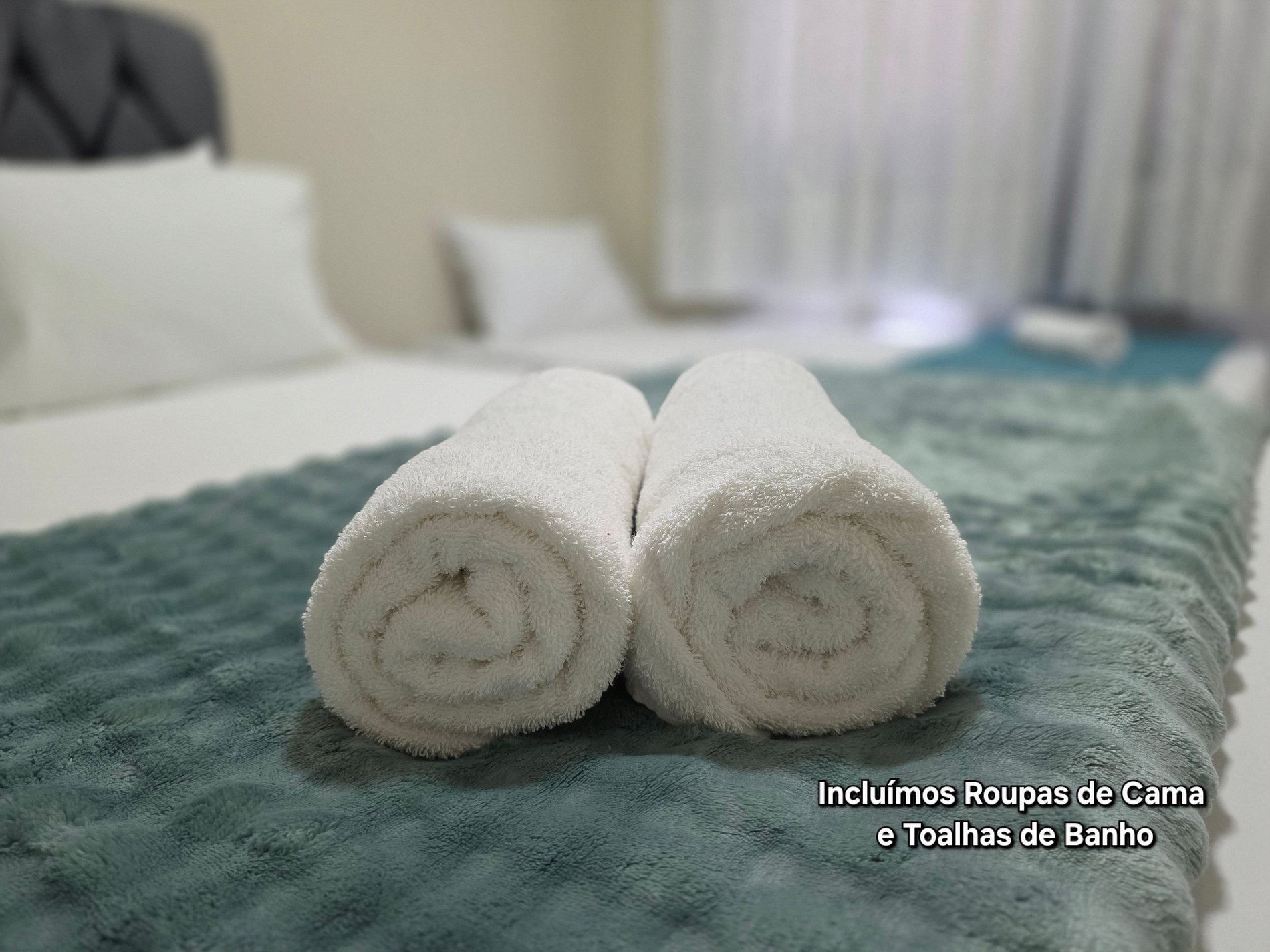 Toalhas de banho (01 por hospede, independente da quantidade de diárias) e 1 de rosto por banheiro