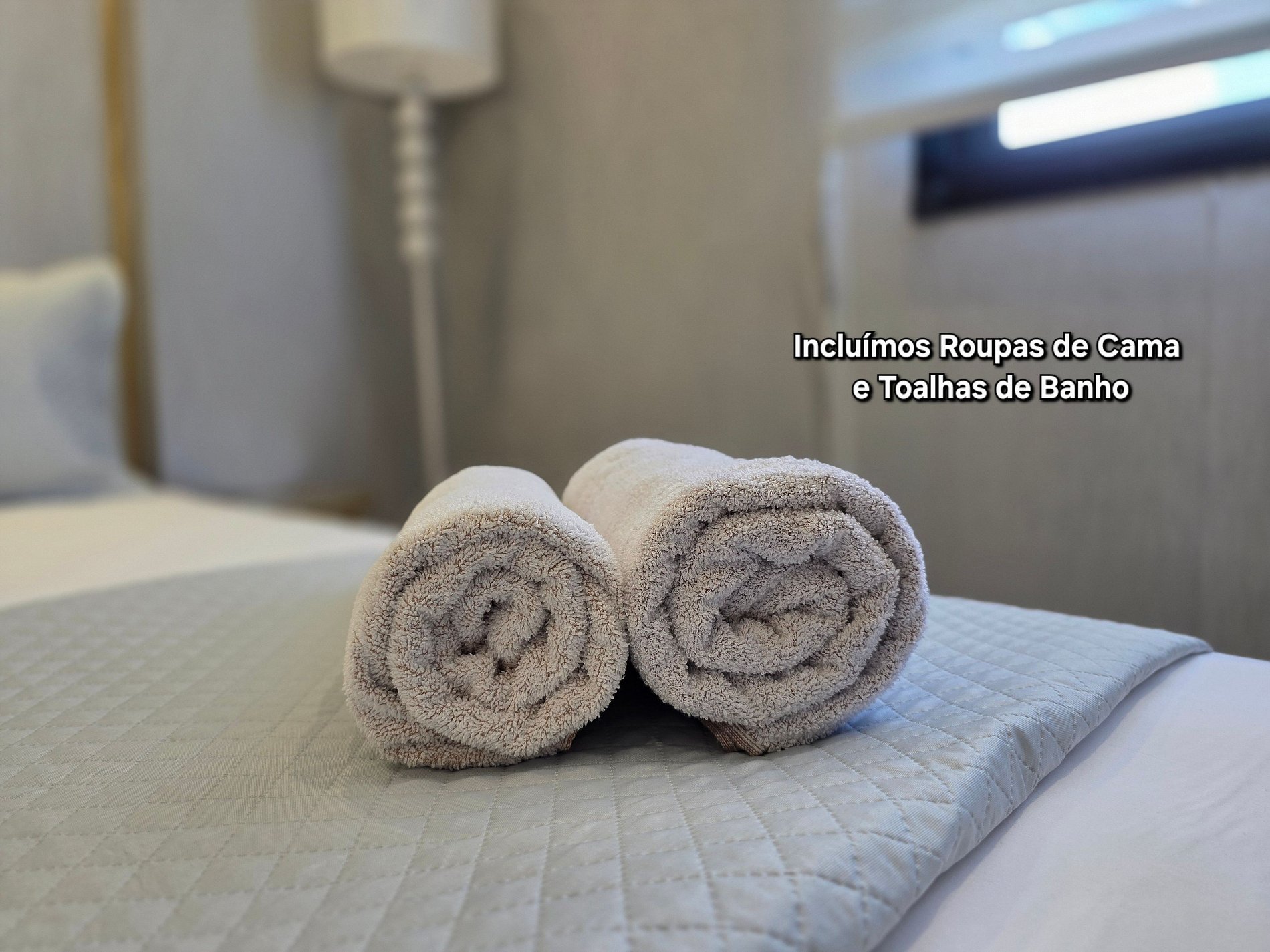 Toalhas de banho (01 por hospede, independente da quantidade de diárias) e 1 de rosto por banheiro