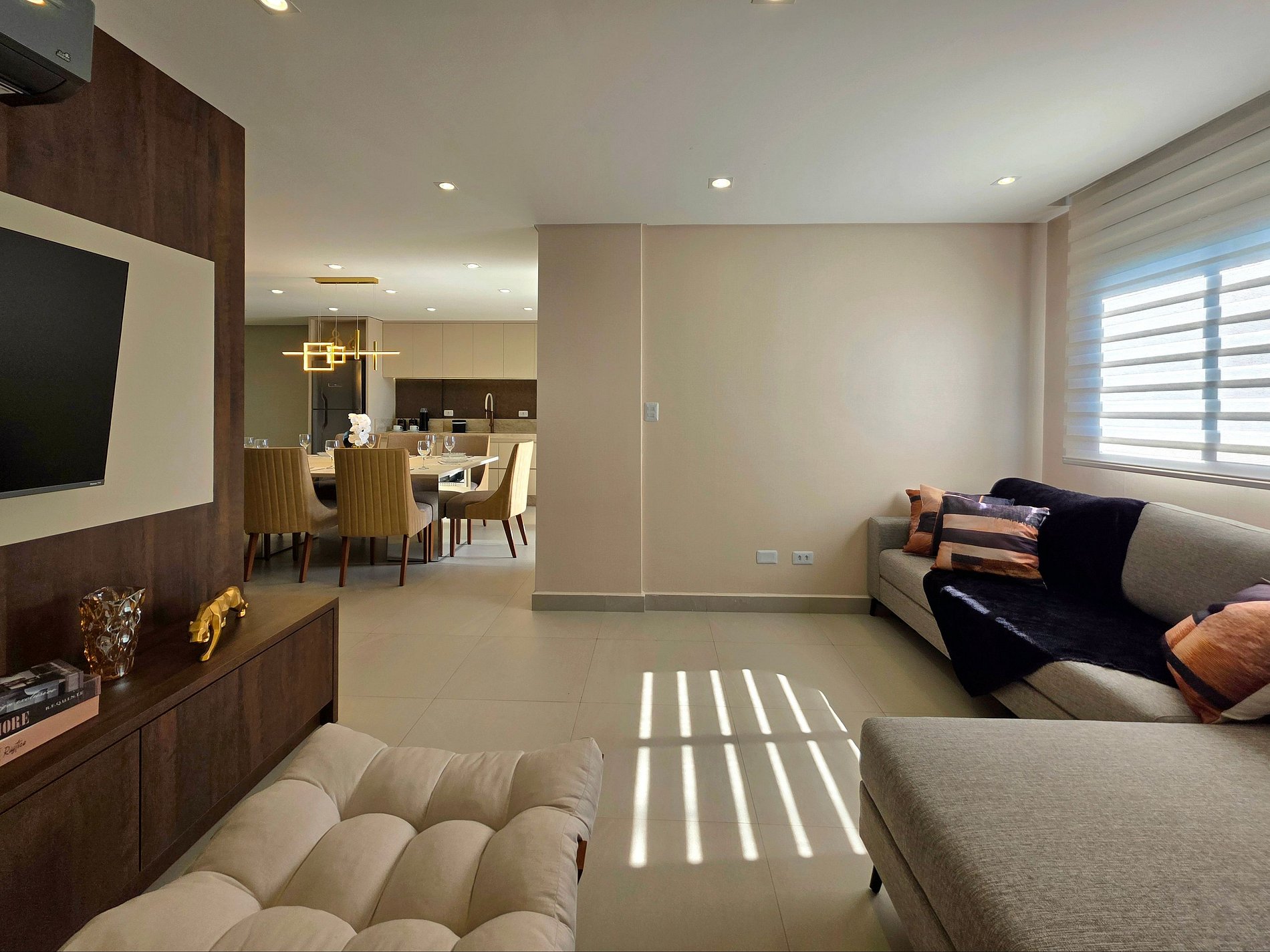 Ar condicionado nos quartos e na sala.
