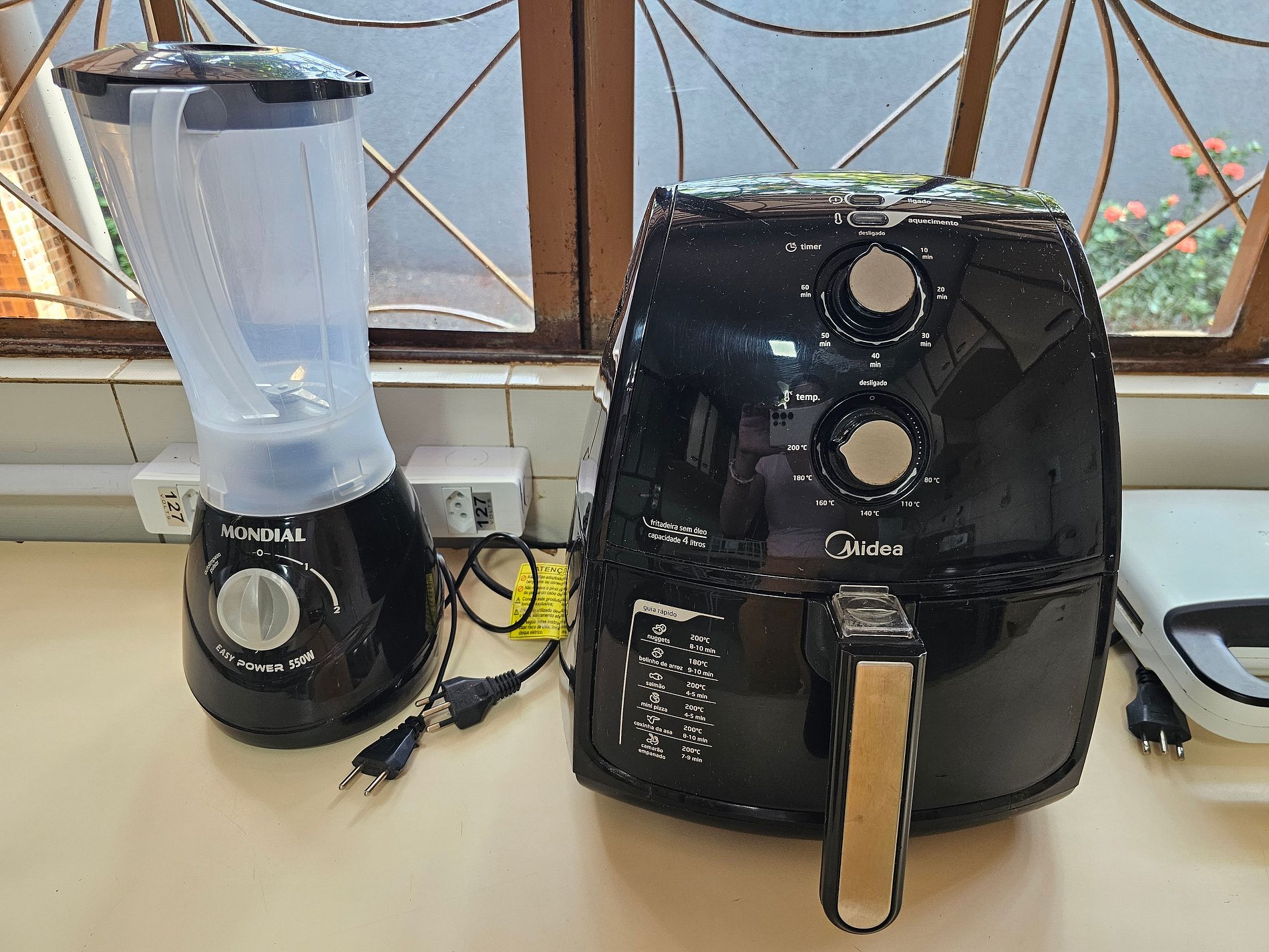Cozinha completa com utensílios e louças para as refeições, microondas, forno, liquidificador, sanduicheira, airfryer.
